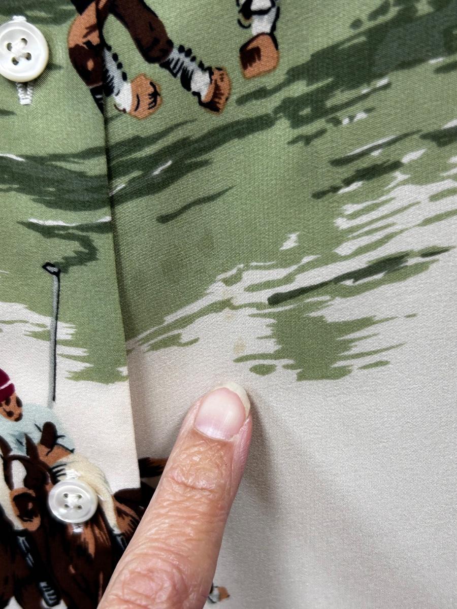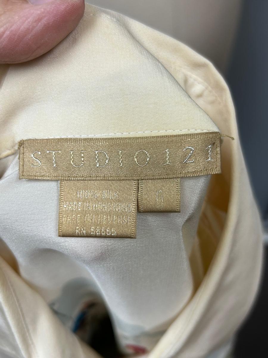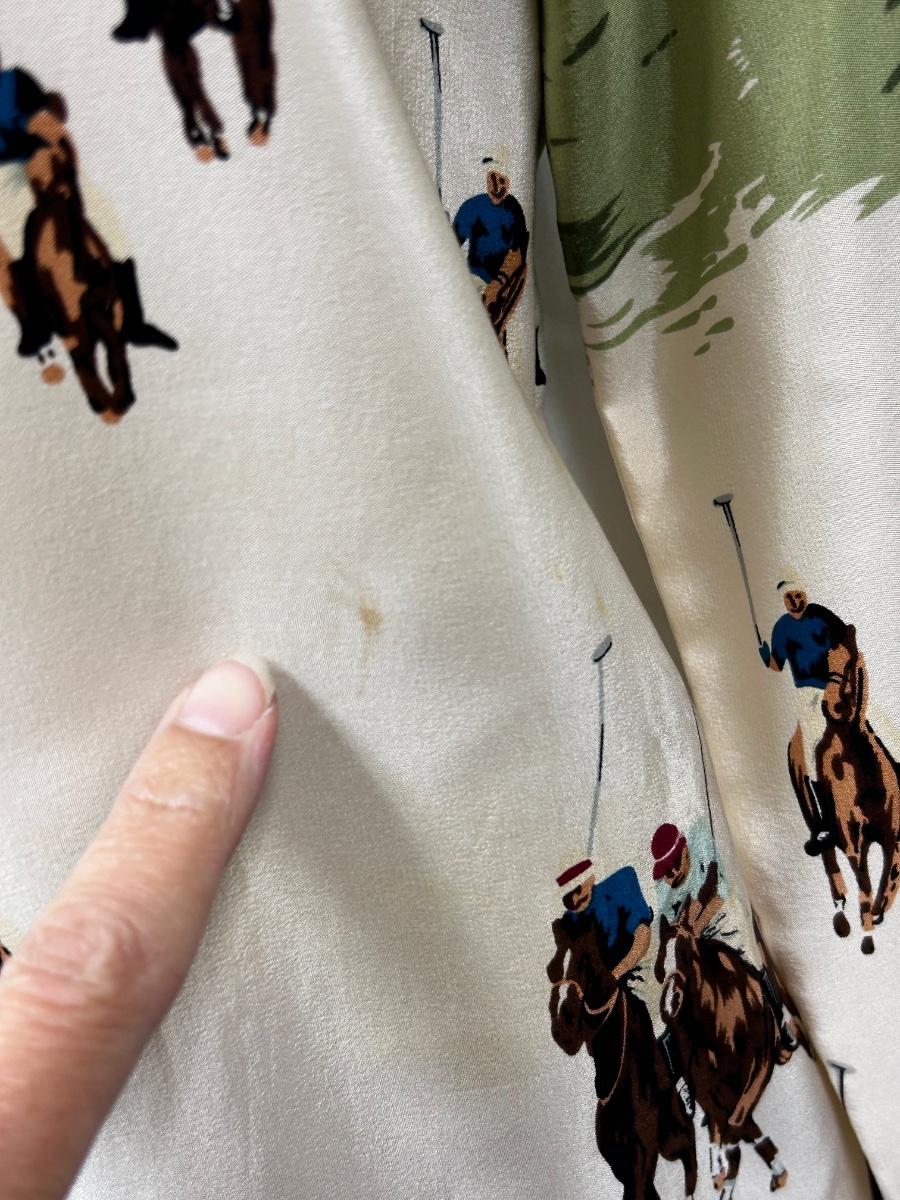 Studio 121 Size 6 100% Silk Equestrian Polo Players Button Front Blouse. In previously worn condition. There is a few faint spots and some discoloration on collar and cuff. May just need to go to cleaners. In wearable condition.