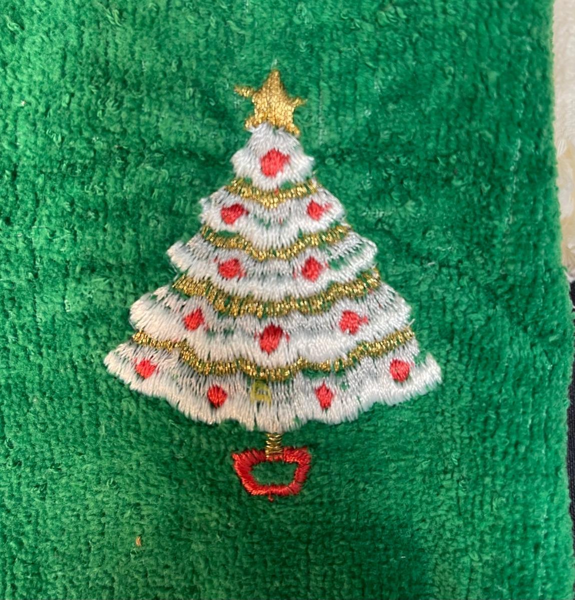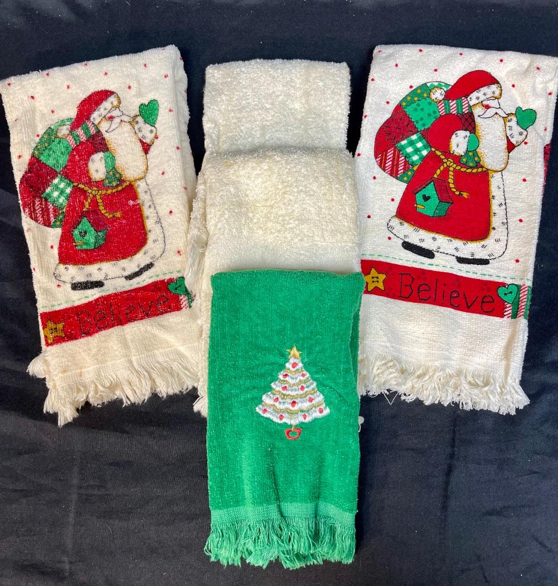 Vintage Christmas Holiday Santa Claus Tree Hand Towels . In previously used condition.