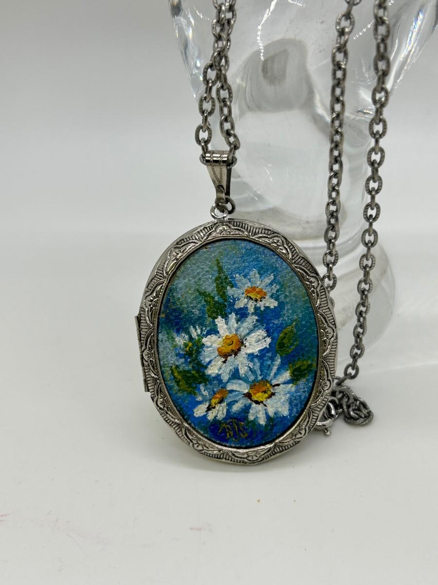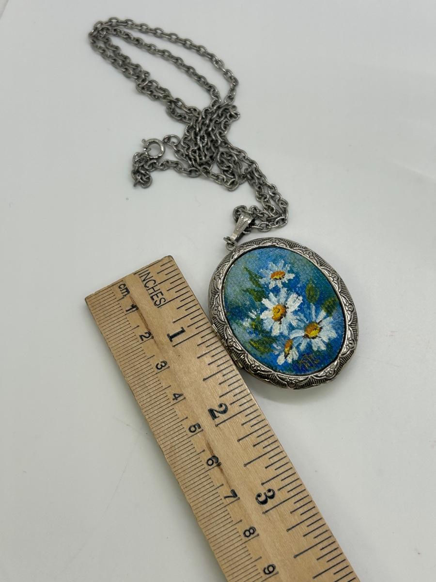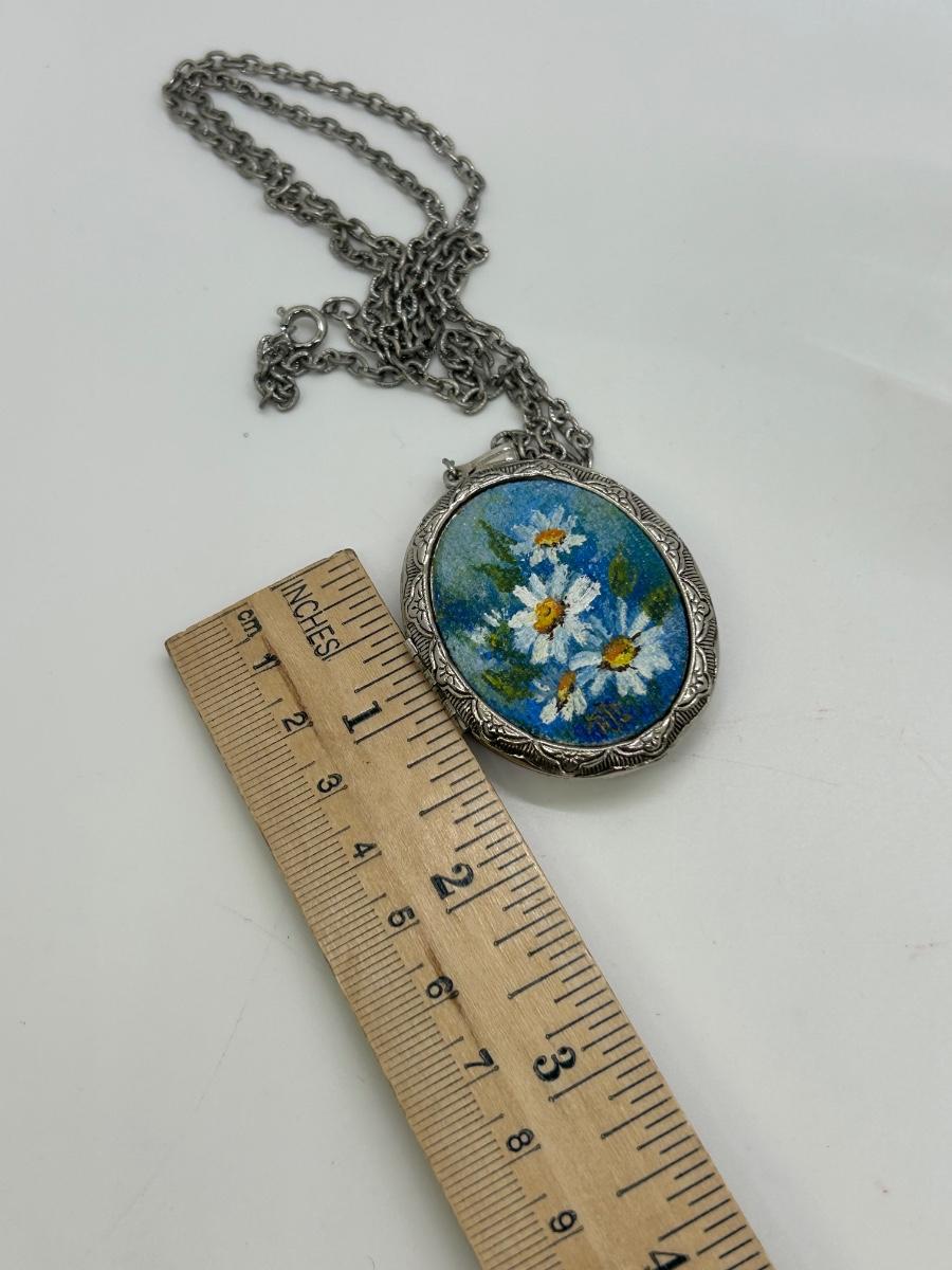 Vintage Silver Tone Metal Oval Locket Pendant Necklace with Hand Painted Daisy Flower Front. The daisy art is hand painted and signed by artist. In good condition.