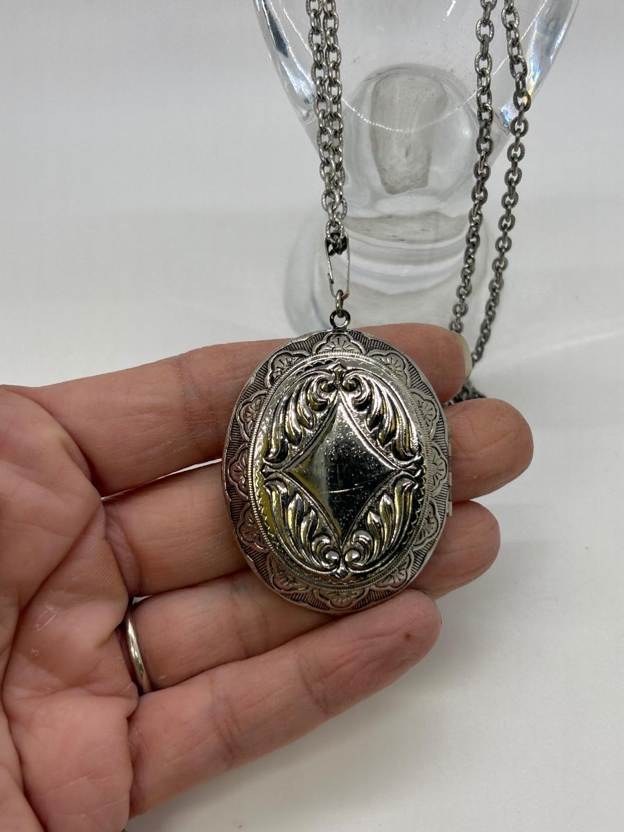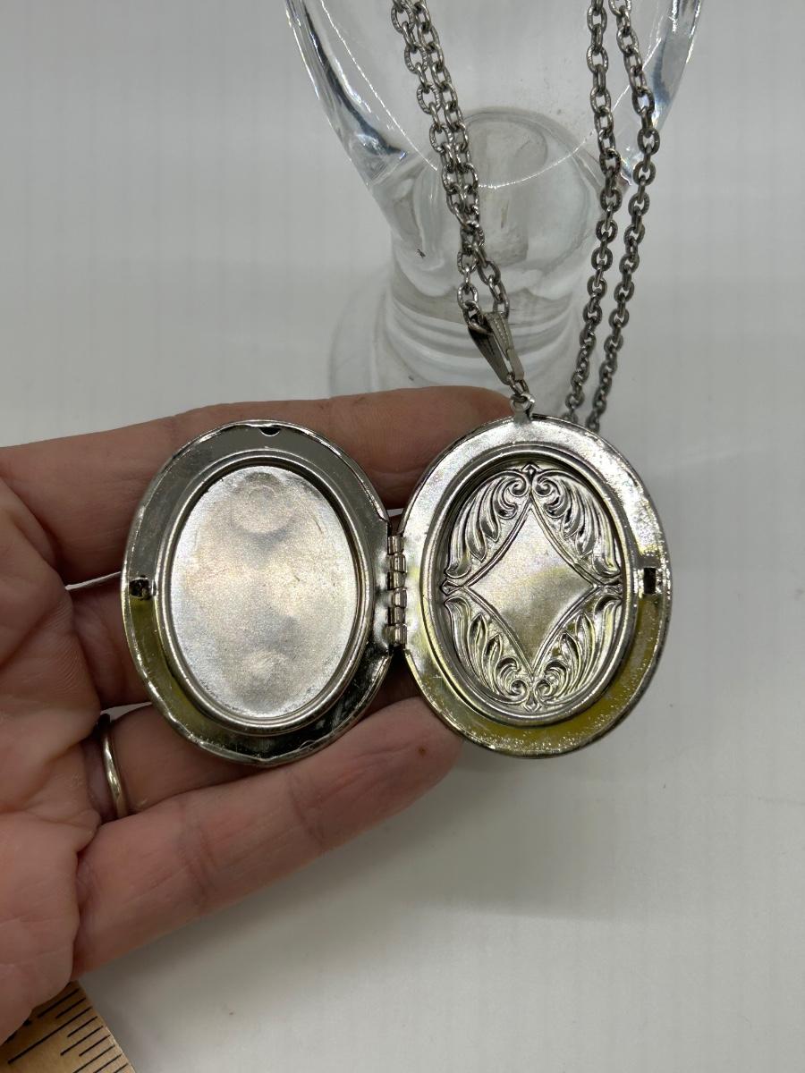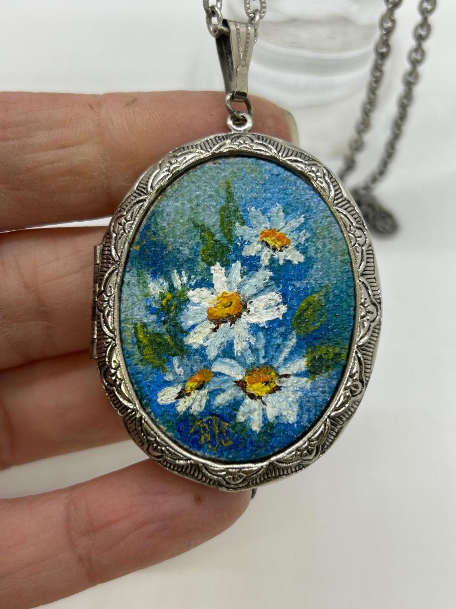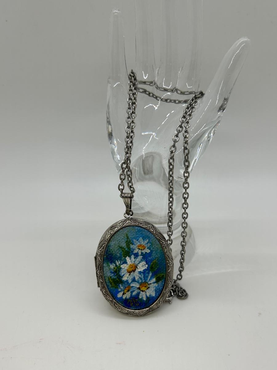Vintage Silver Tone Metal Oval Locket Pendant Necklace with Hand Painted Daisy Flower Front. The daisy art is hand painted and signed by artist. In good condition.