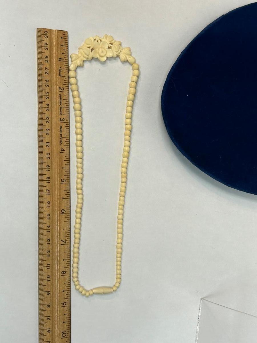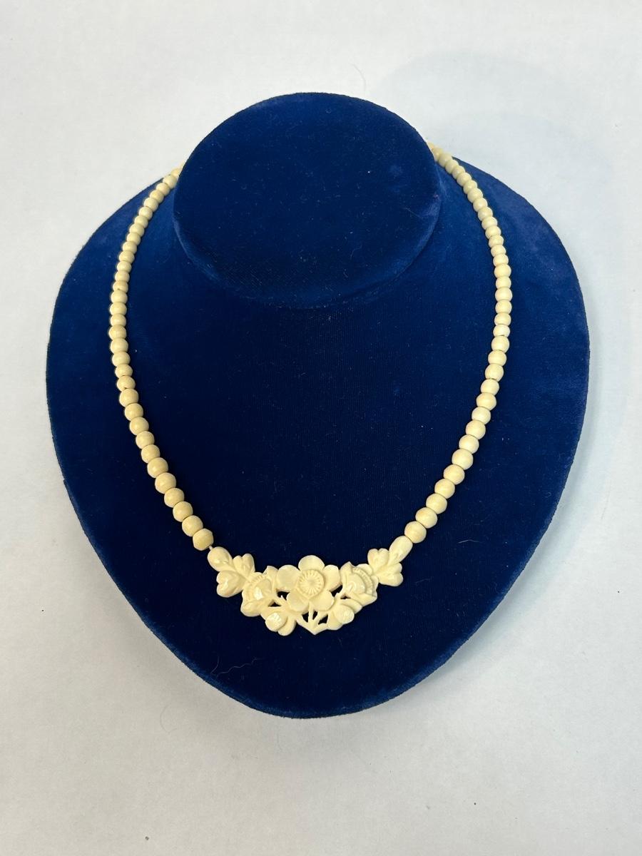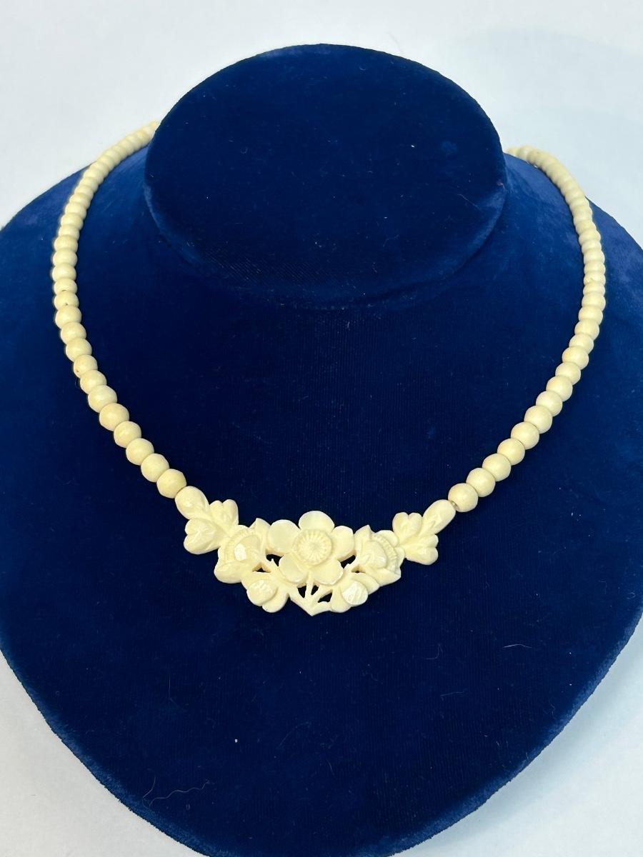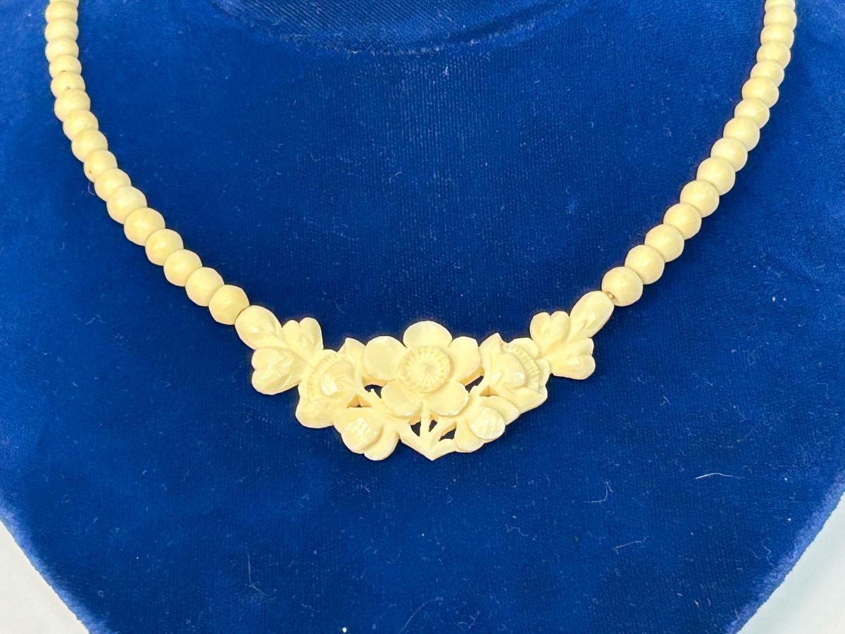 Vintage Carved Bone Horn Beaded Necklace with Floral Flower Centerpiece