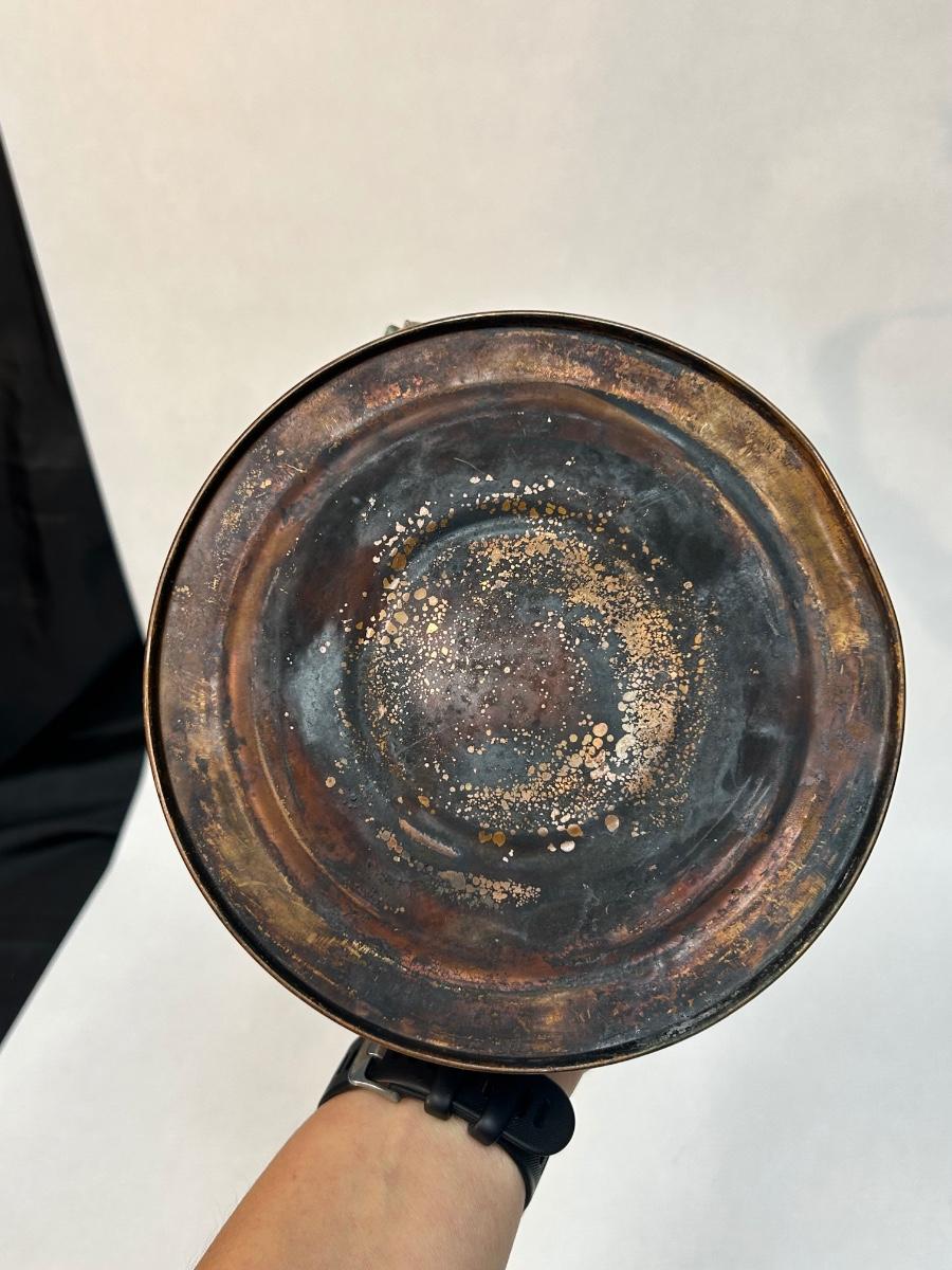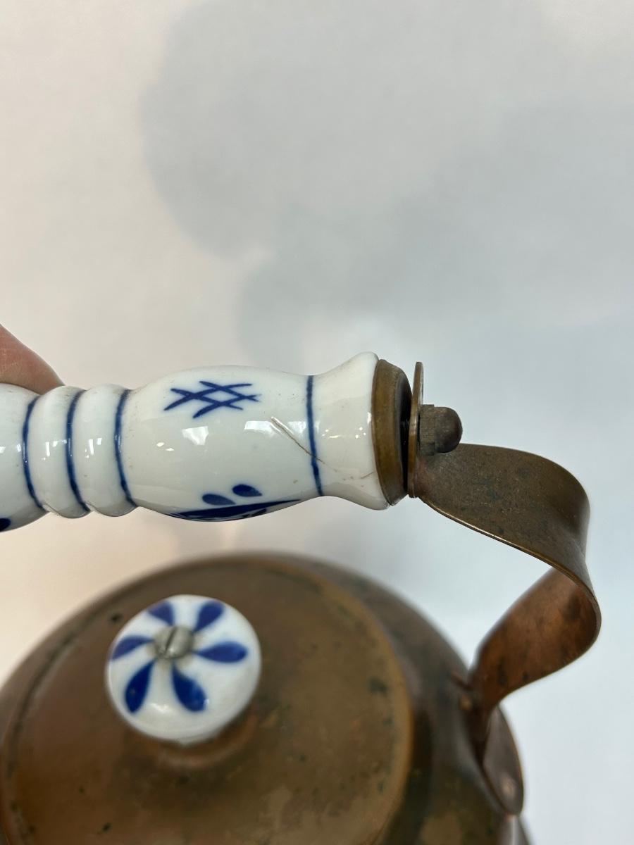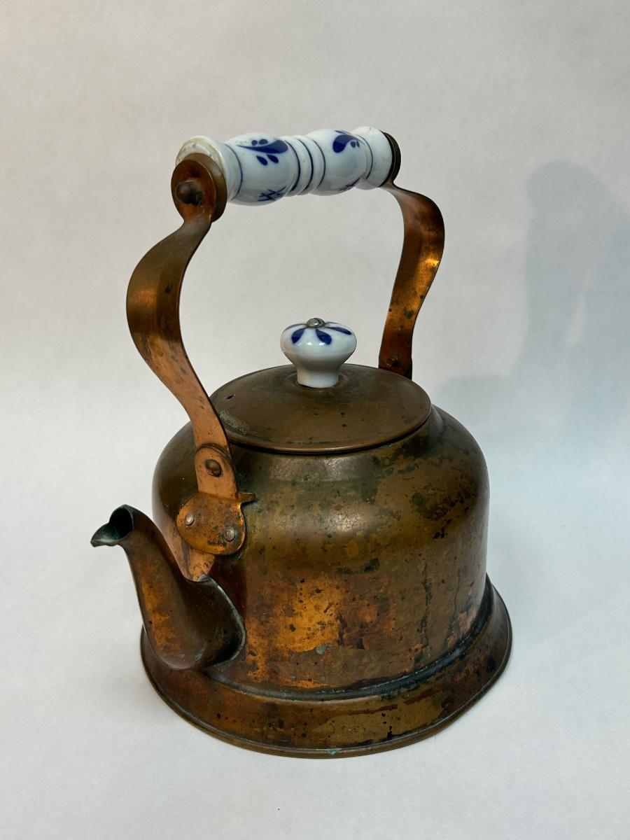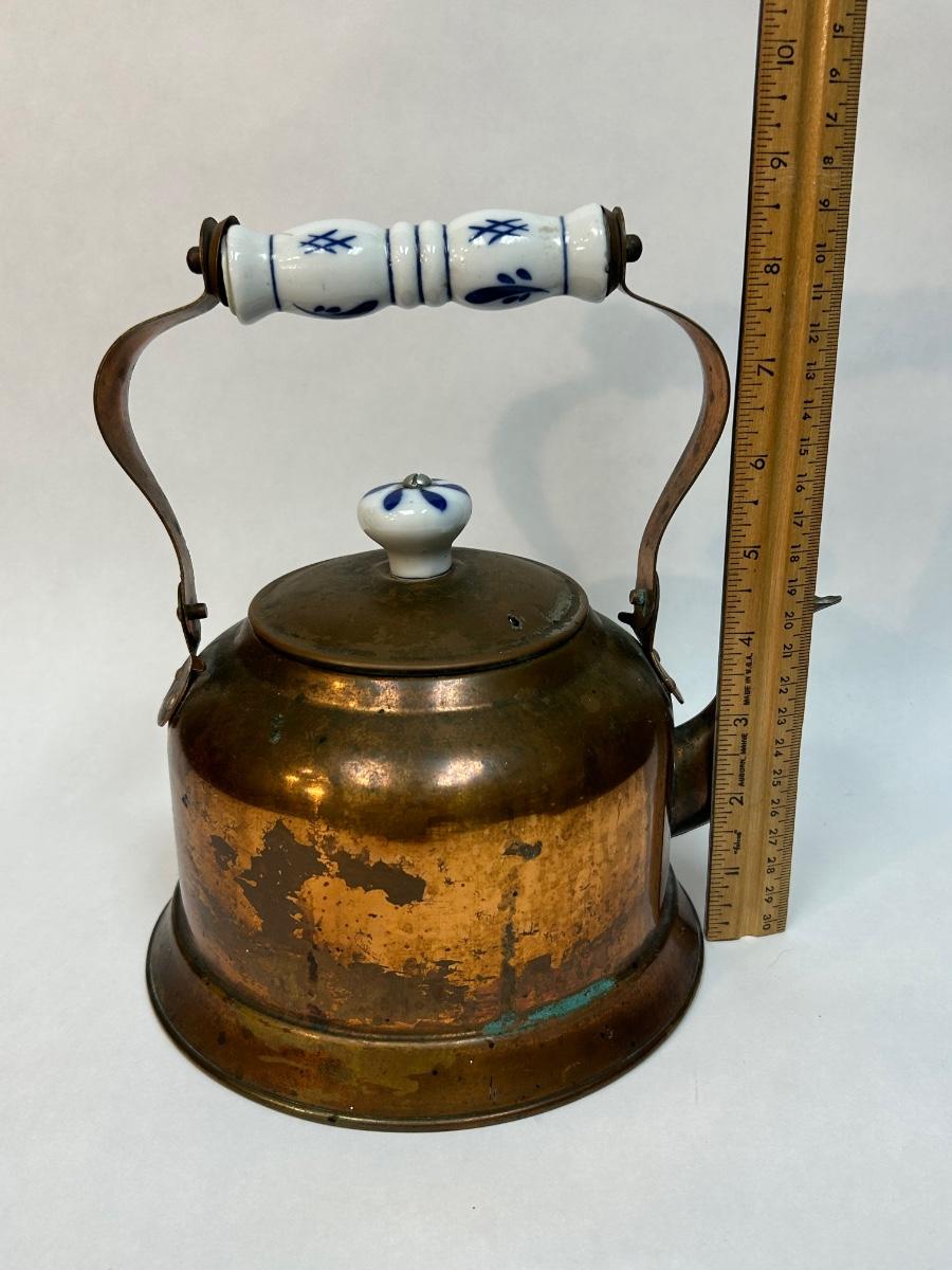 Vintage Copper Tea Kettle with Ceramic Delft Like White & Blue Handle Grip and Lid Knob