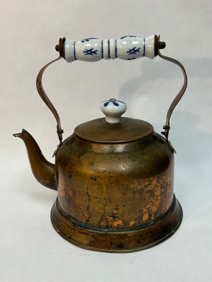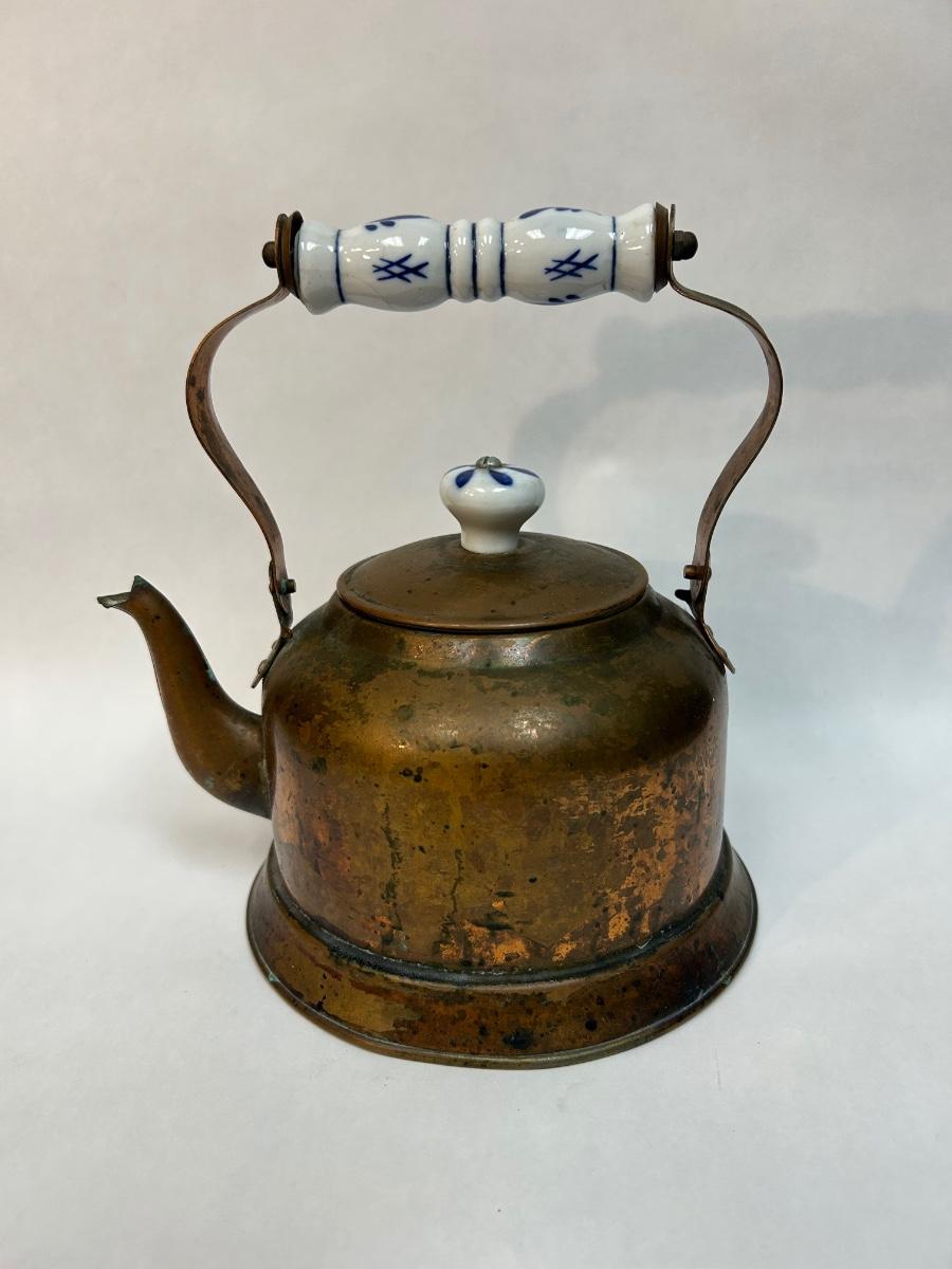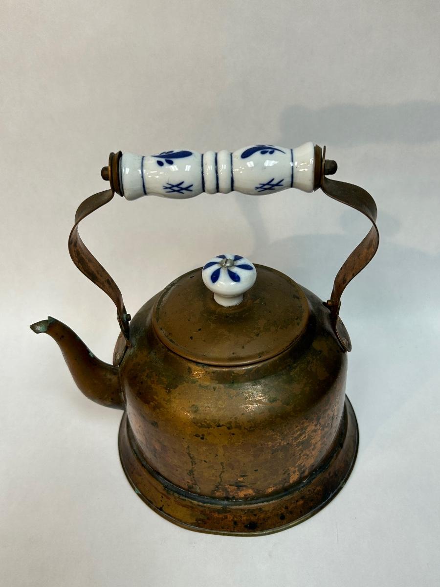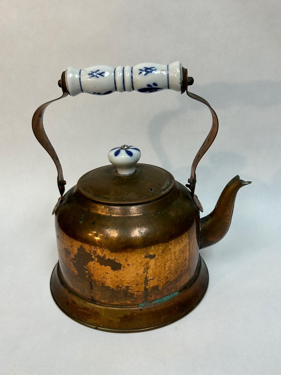 Vintage Copper Tea Kettle with Ceramic Delft Like White & Blue Handle Grip and Lid Knob. In aged condition. Displays nice.