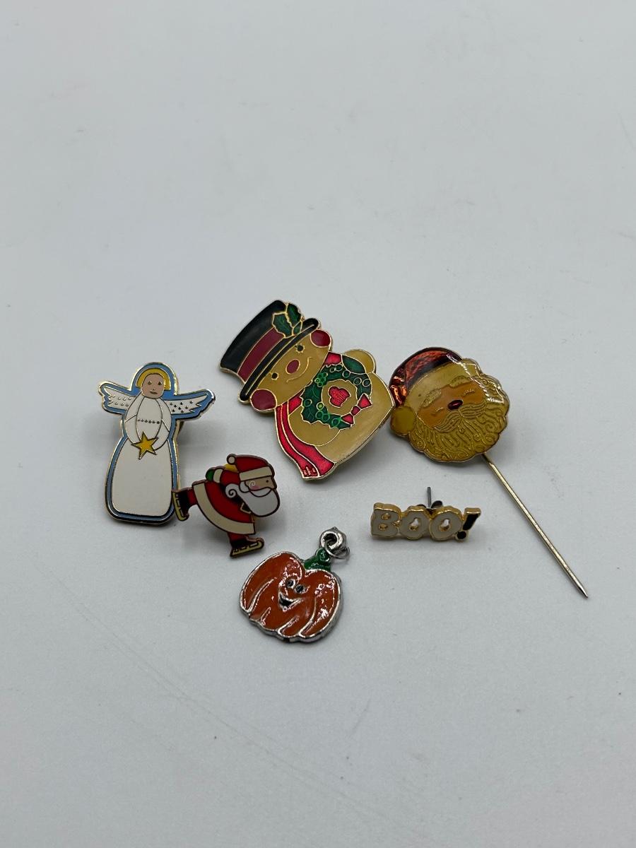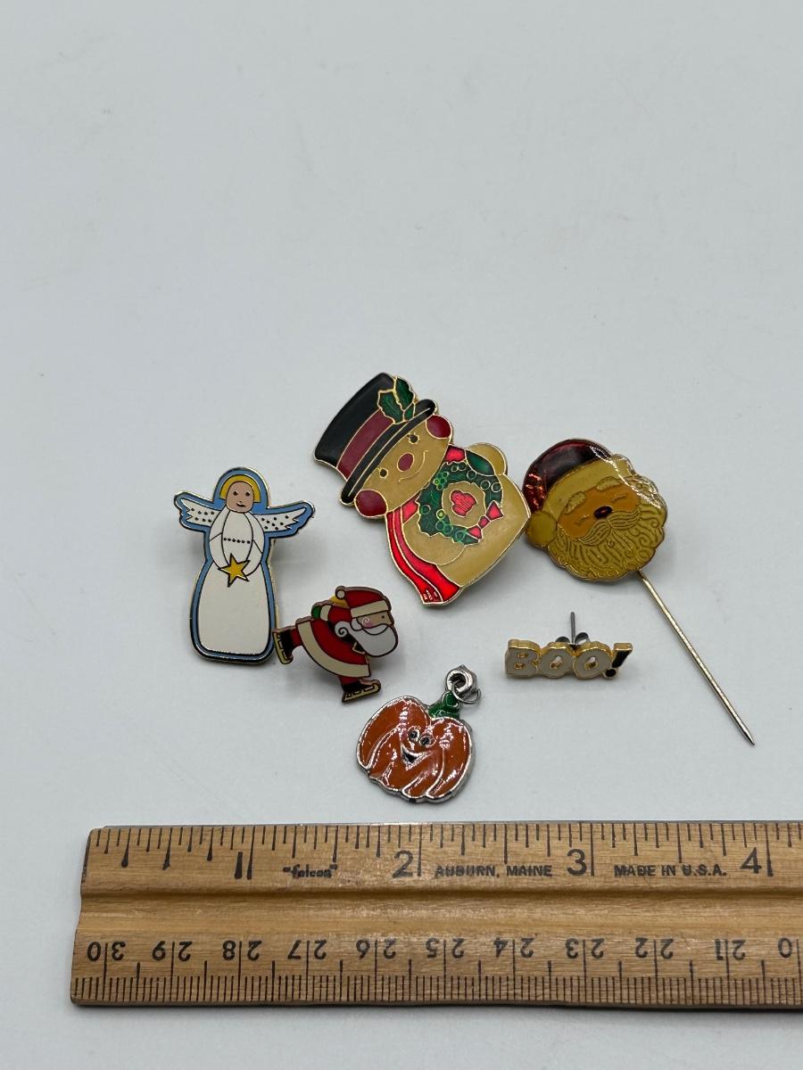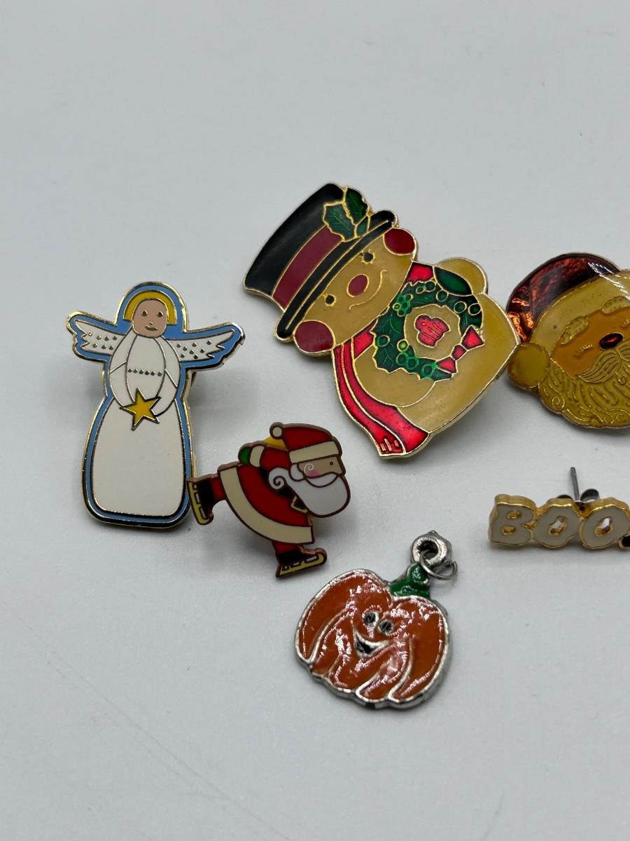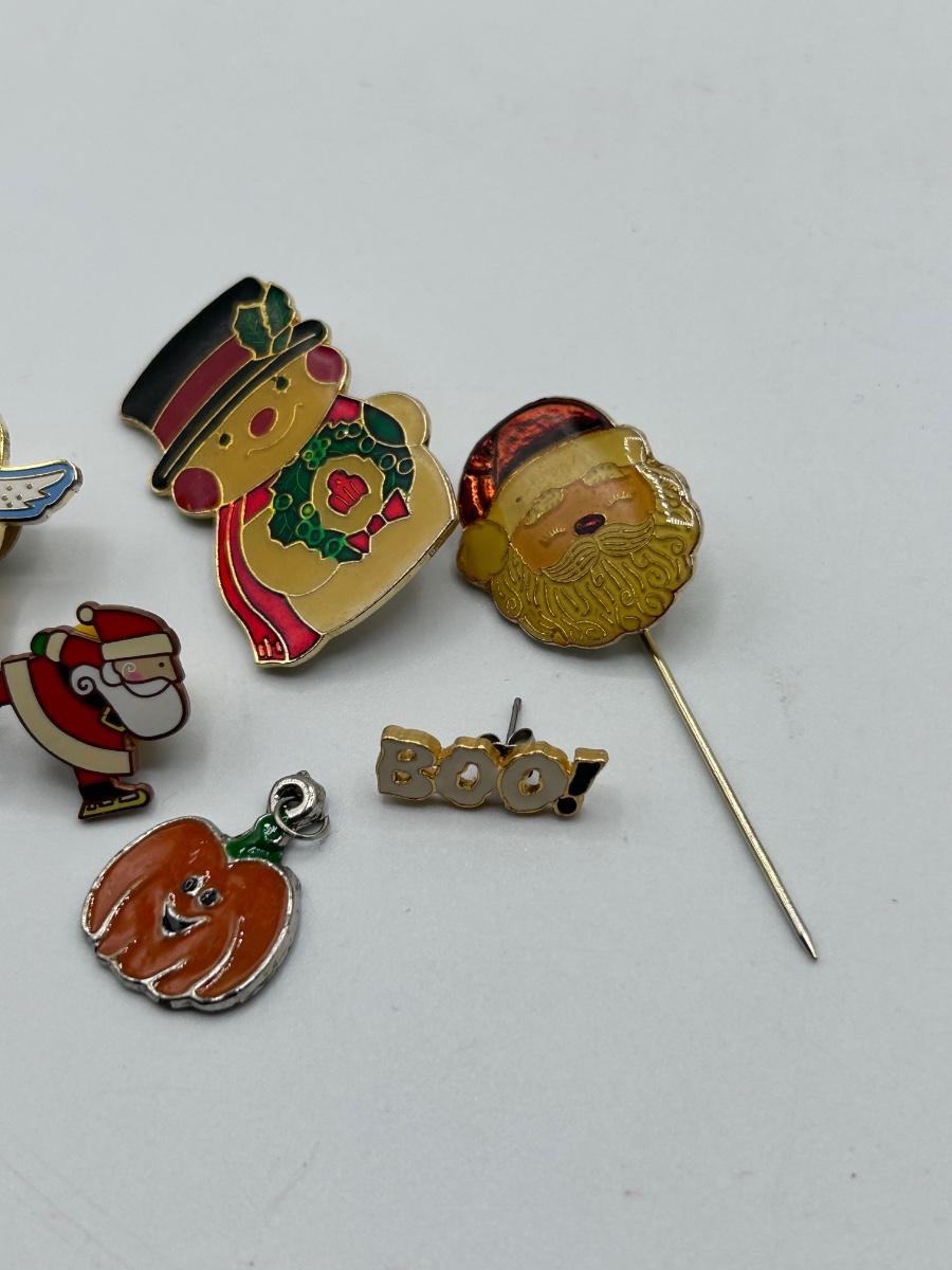 Mixed Lot of Seasonal Holiday Pins and Charms Halloween Christmas. In good condition. Great for crafting.