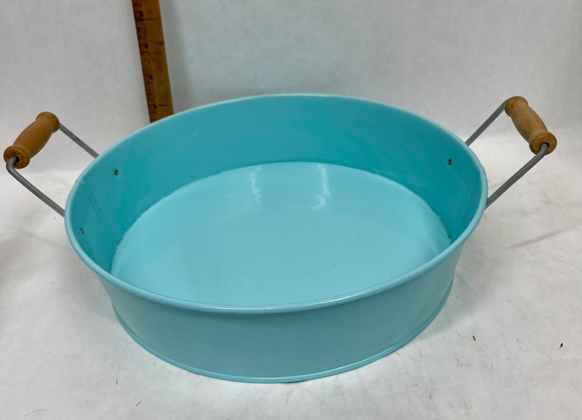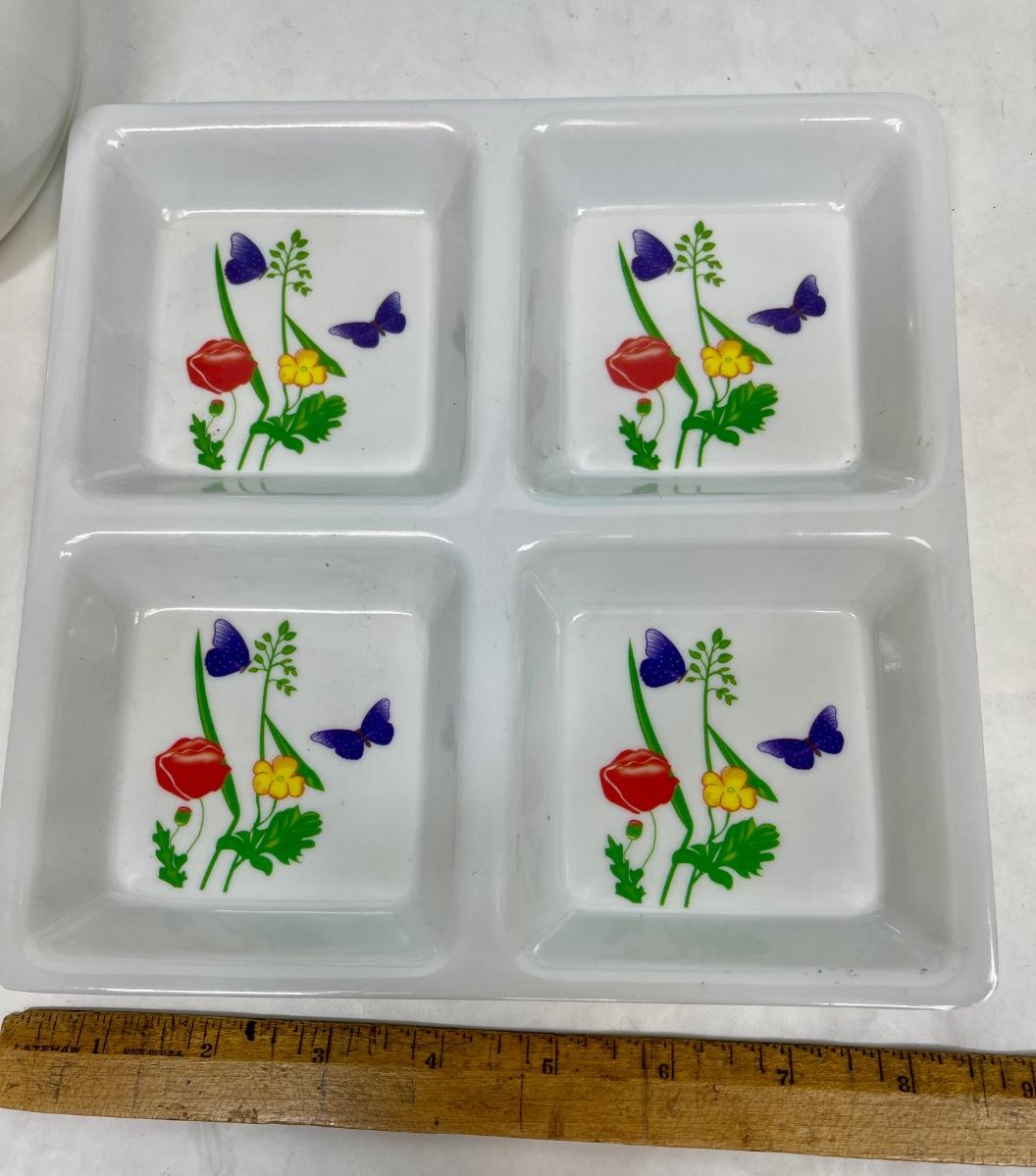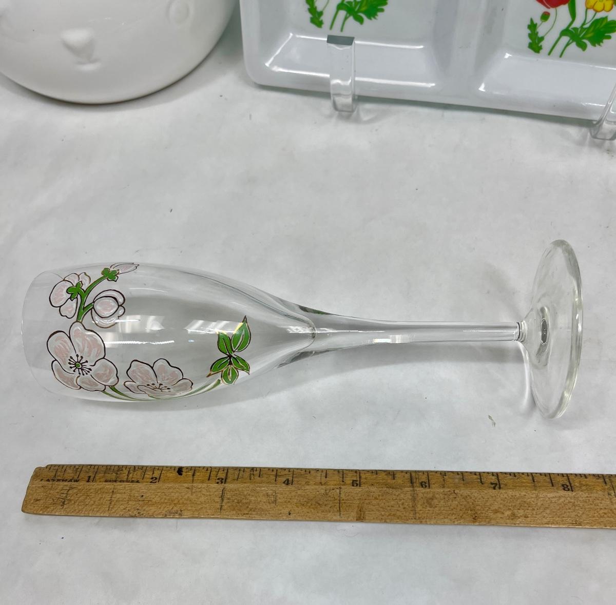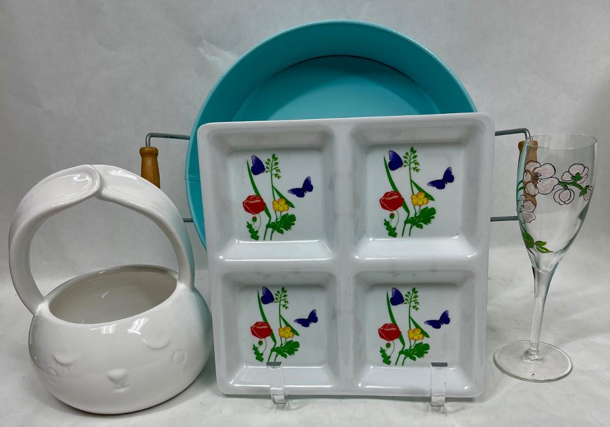Shallow Metal Tray, 4-compartment plastic serving tray, decorated champagne glass, and ceramic basket. All in good condition.