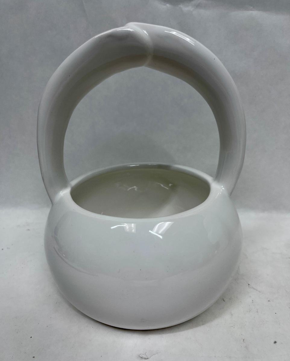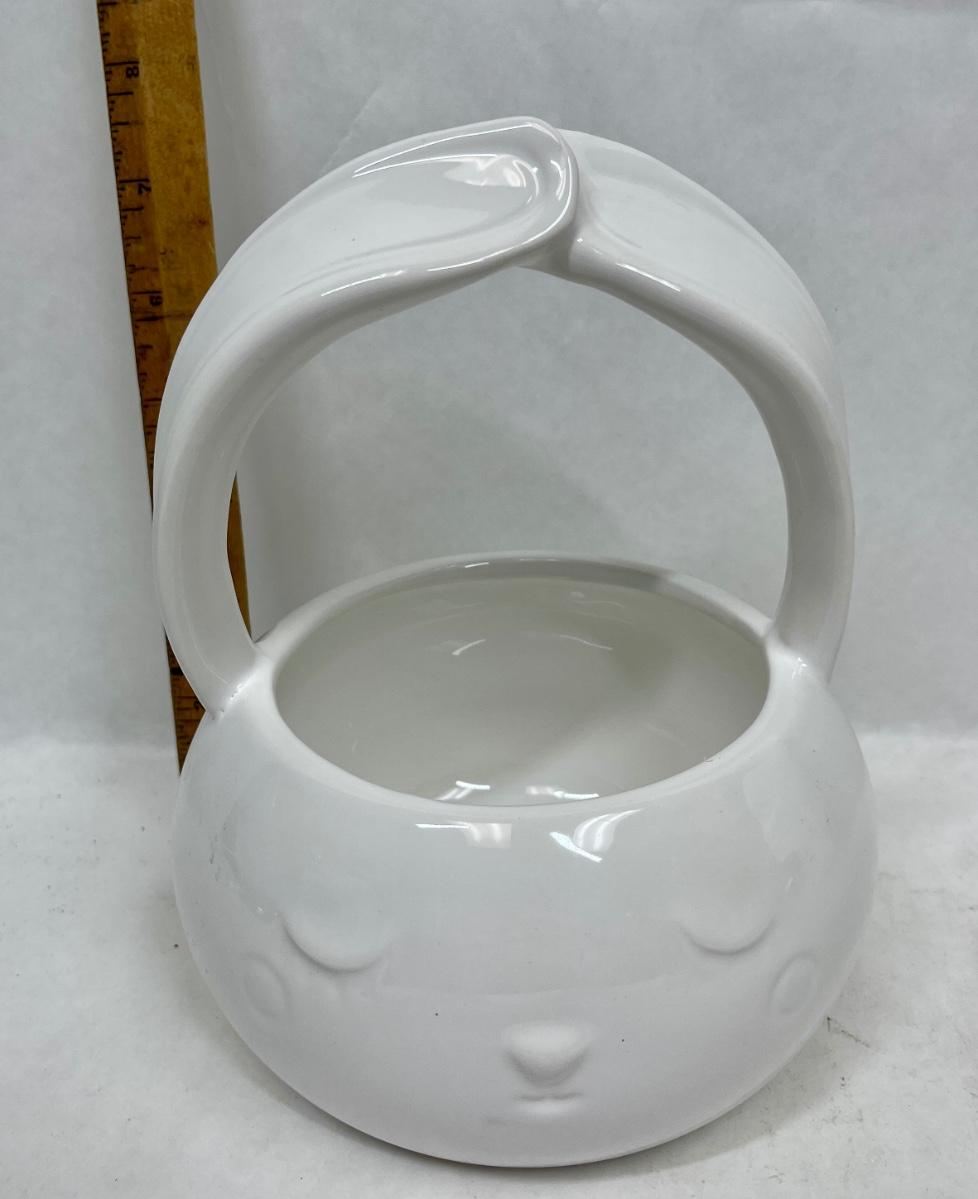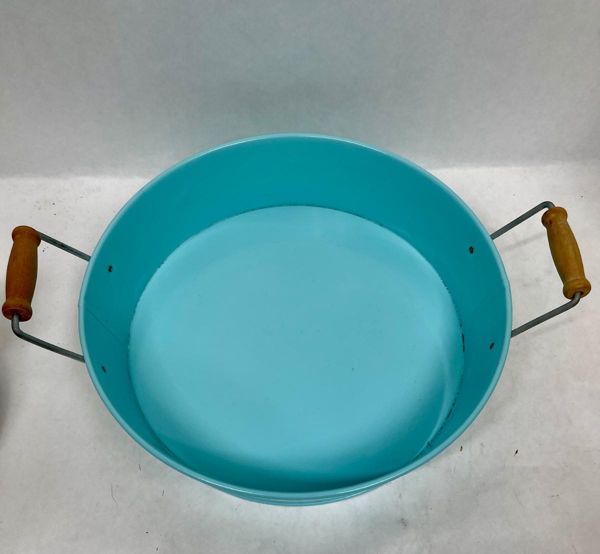 Shallow Metal Tray, 4-compartment plastic serving tray, decorated champagne glass, and ceramic basket. All in good condition.