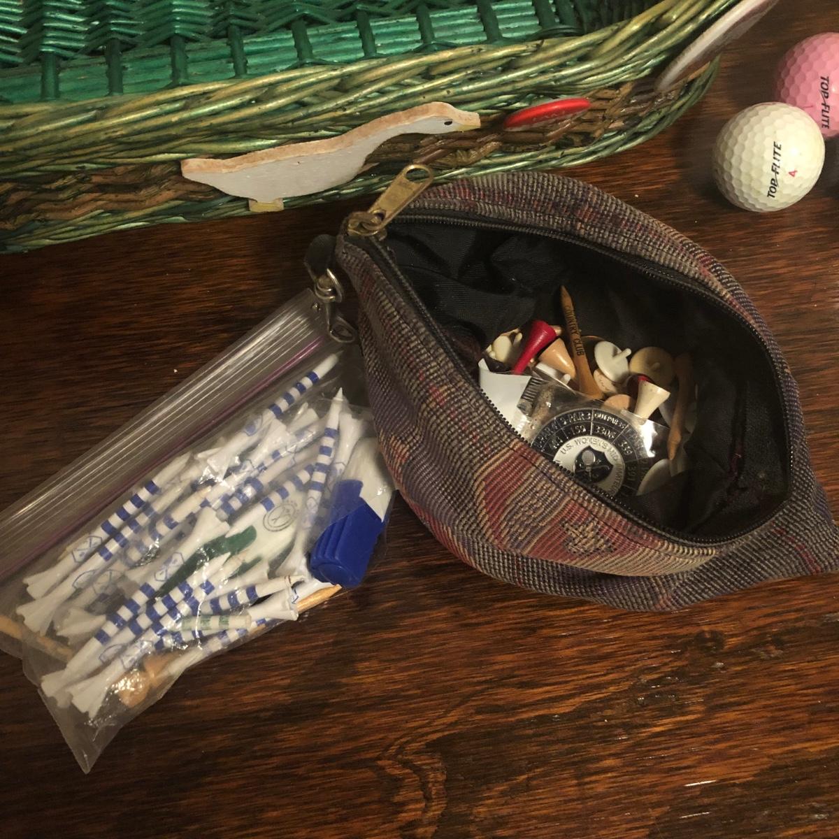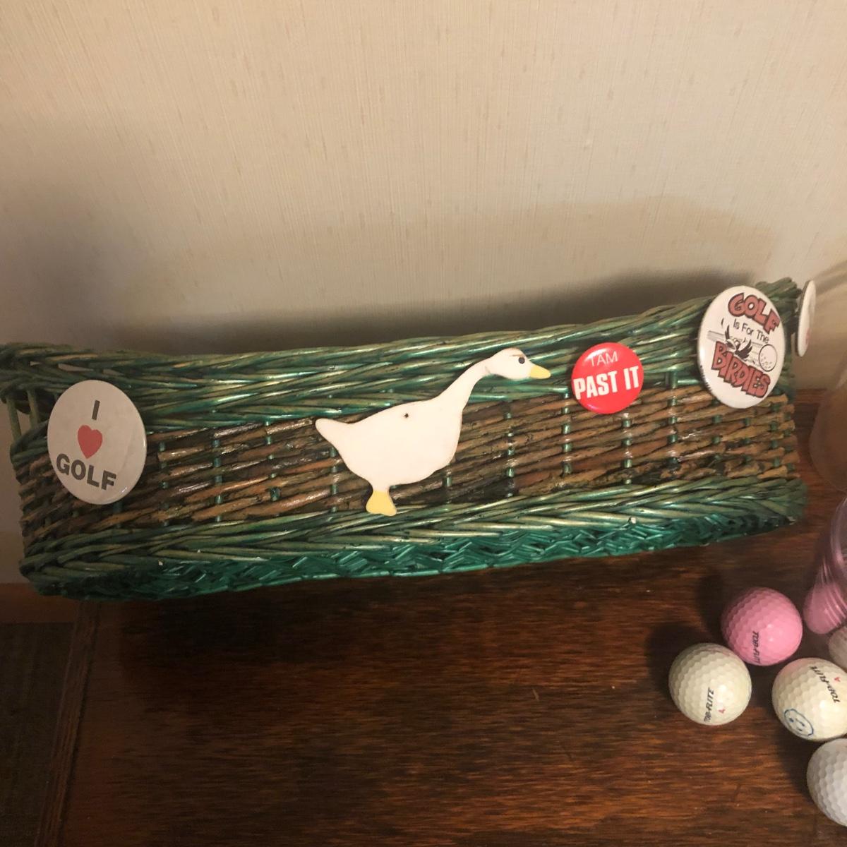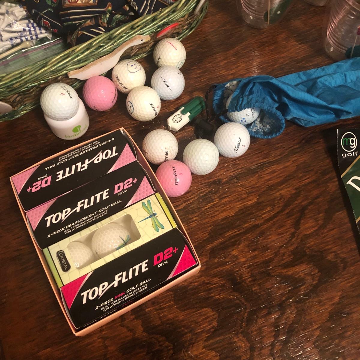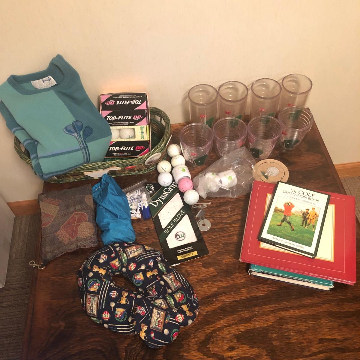This large collection of golf themed items includes Top Flite Diva D2 golf balls with green and blue dragonflies on them, assorted Top Flite and more golf balls, A Pringle wool sweater that says Made in Scotland Vick Faldo Pringle Collection. 3 golf books, 8 golf-themed sturdy plastic cups, tees, birdieballs, a golf themed lavender scented neck and shoulder wrap, and a golf and goose basket. There is also a lady golfer sculpture made of metal nails and a DynaGrip golf glove. The large cups are 3” in diameter by 6” tall. The sweater appears to be a men’s size large. Shipping available.