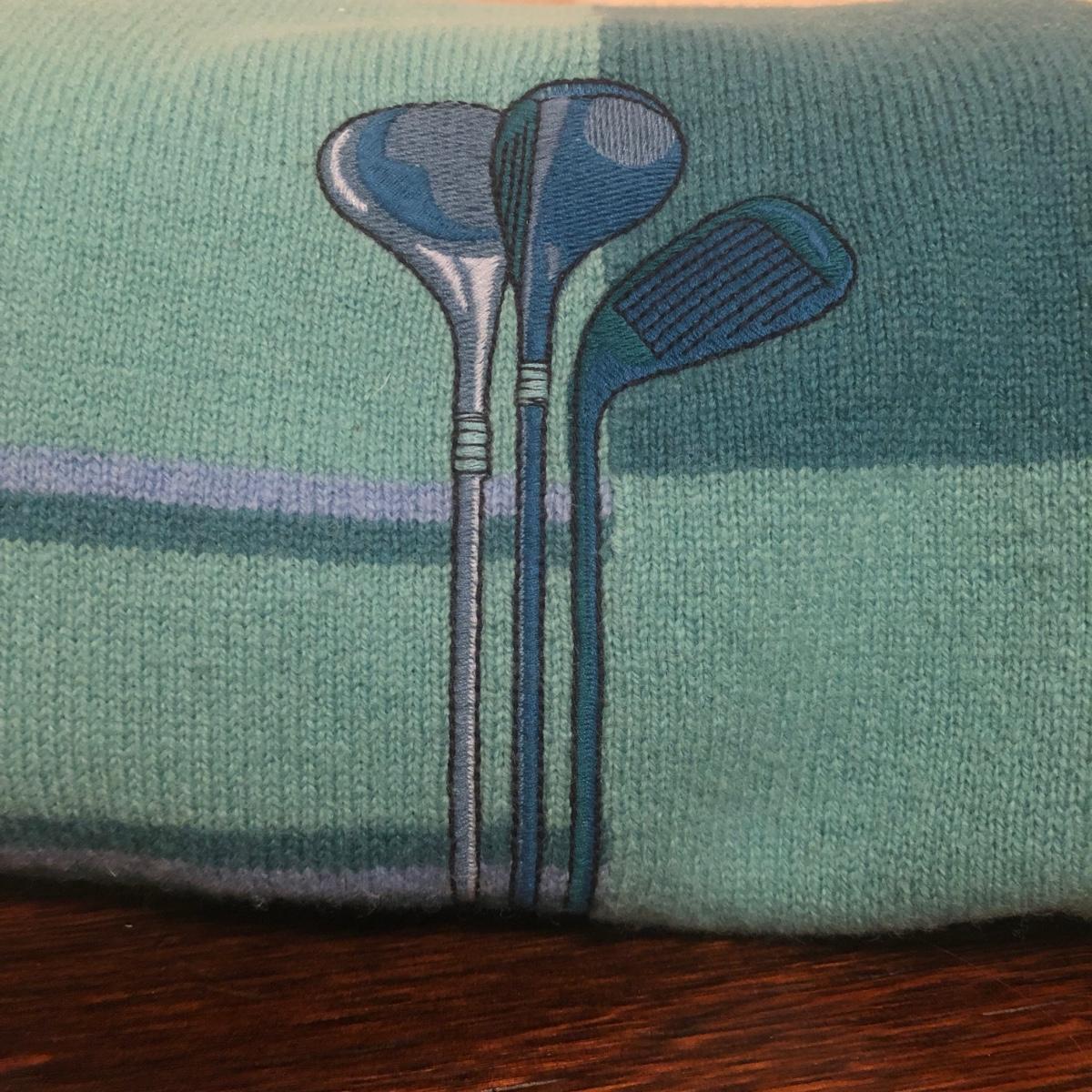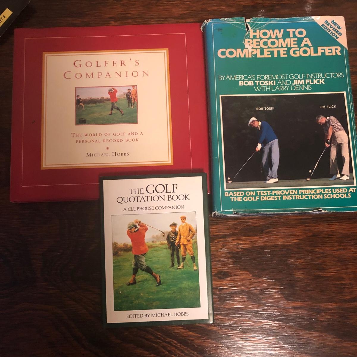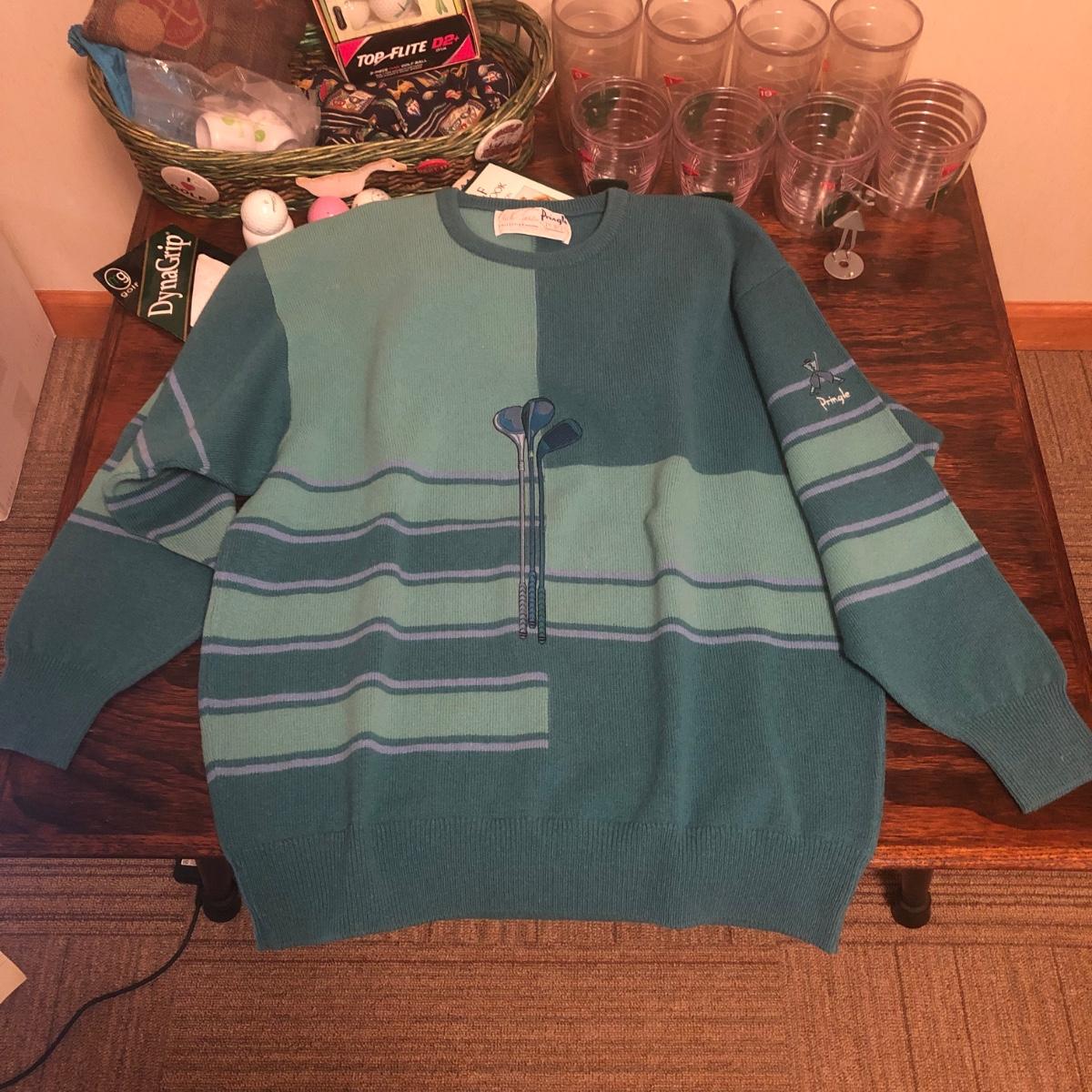 This large collection of golf themed items includes Top Flite Diva D2 golf balls with green and blue dragonflies on them, assorted Top Flite and more golf balls, A Pringle wool sweater that says Made in Scotland Vick Faldo Pringle Collection. 3 golf books, 8 golf-themed sturdy plastic cups, tees, birdieballs, a golf themed lavender scented neck and shoulder wrap, and a golf and goose basket. There is also a lady golfer sculpture made of metal nails and a DynaGrip golf glove. The large cups are 3” in diameter by 6” tall. The sweater appears to be a men’s size large. Shipping available.
