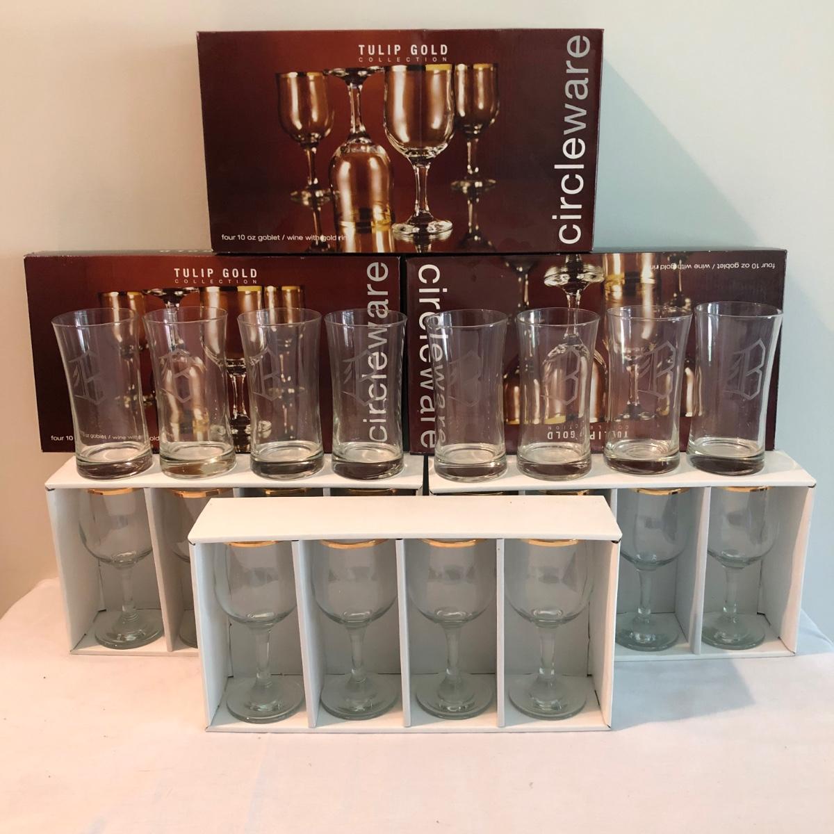 12 gold-rimmed wine glasses are in their original boxes and 8 glasses are etched with the letter “B”. The wine glasses are 10 oz goblets from the Tulip Gold Collection by circleware. Shipping available.