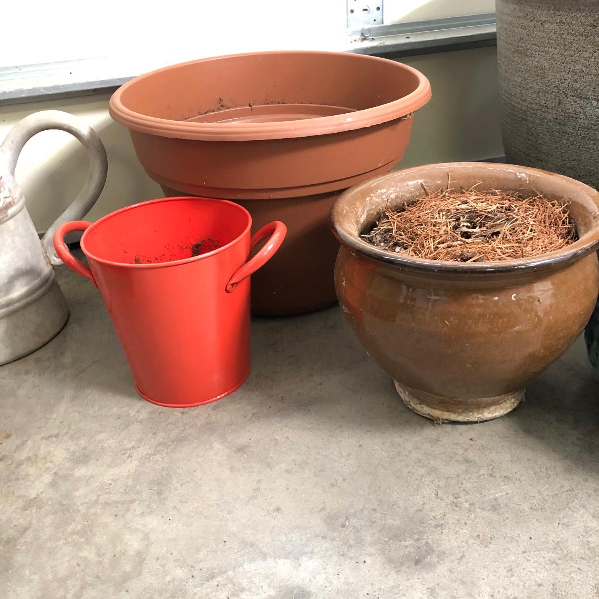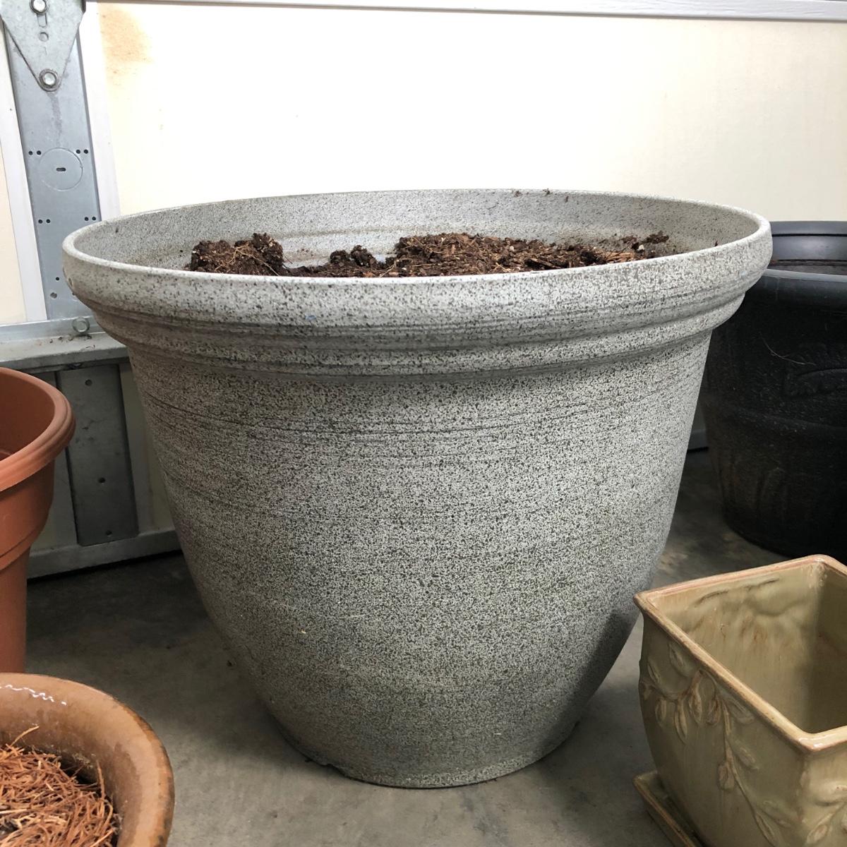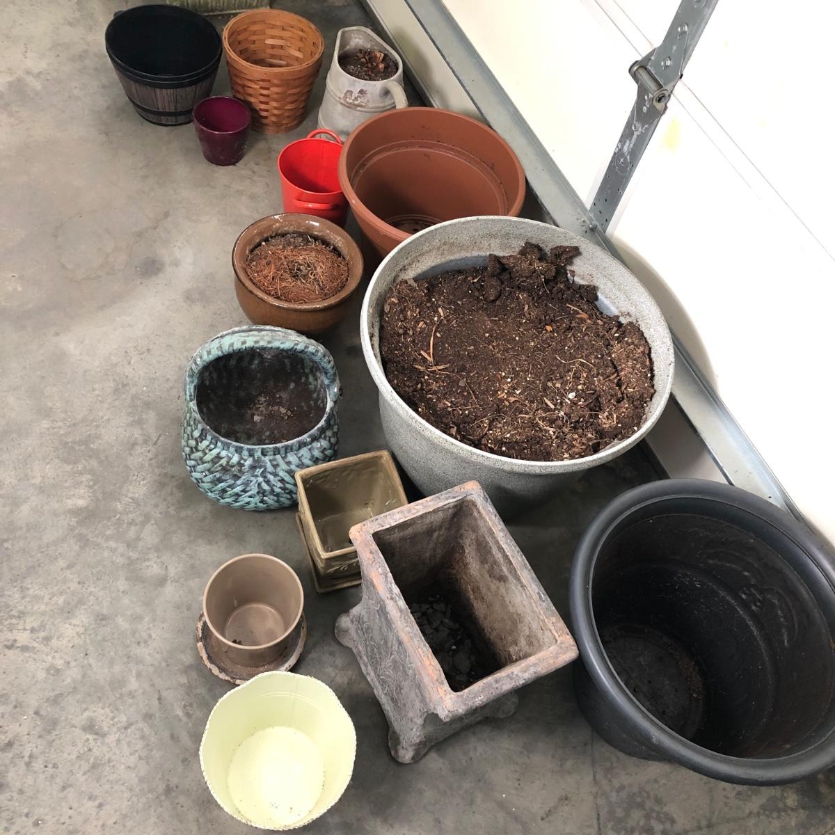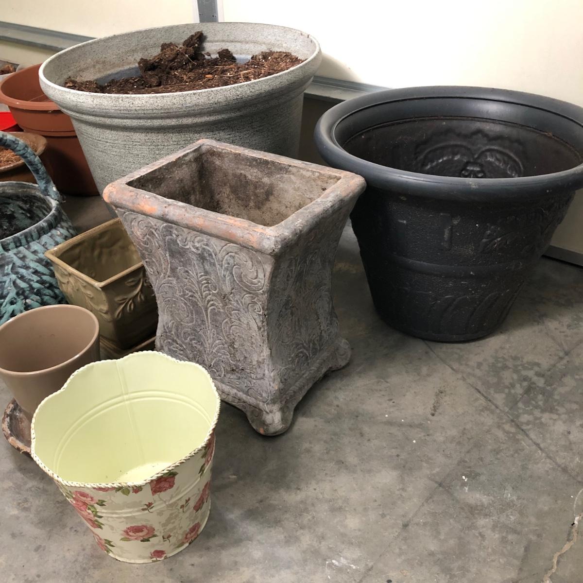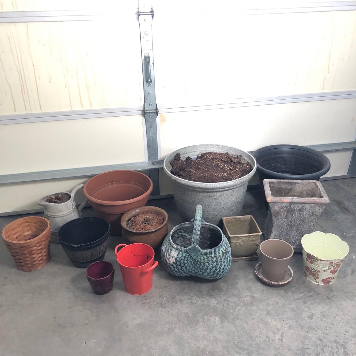 These 14 pots are made of ceramic, plastic, and fiberglass with a wide range of styles and shapes. The ceramic basket pot is painted matte turquoise and black. The largest pot that is speckled in black and white is made of a lightweight but sturdy fiberglass material. This large pot measures 17.5” in diameter and is 14.25” tall. Soil mix and plant debris is included in some of the pots as pictured. Some of these pots have areas where paint is chipped giving them a rustic look. Local pickup only.