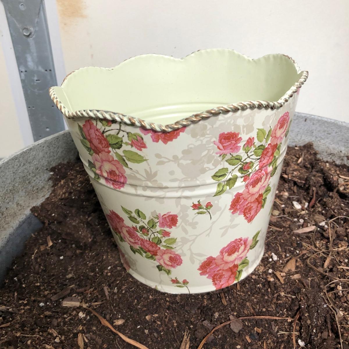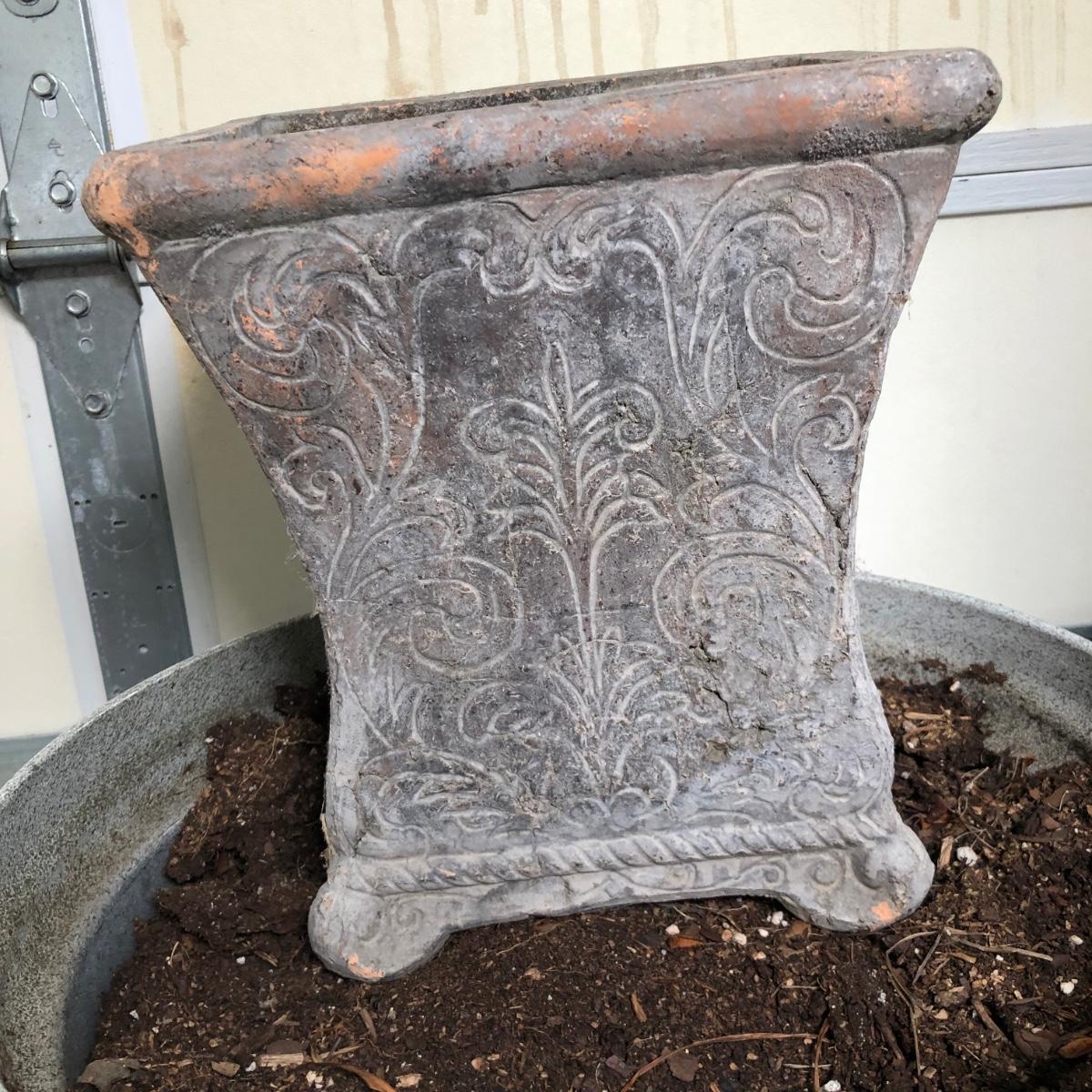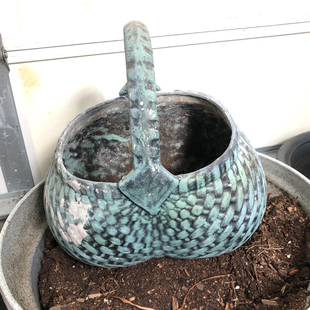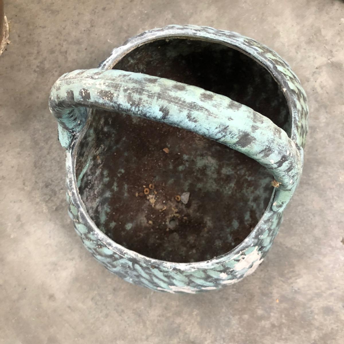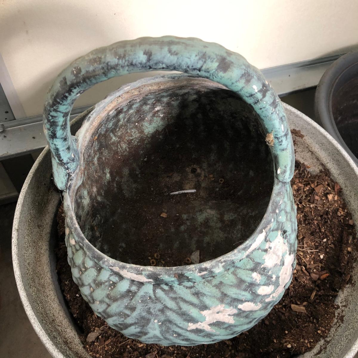 These 14 pots are made of ceramic, plastic, and fiberglass with a wide range of styles and shapes. The ceramic basket pot is painted matte turquoise and black. The largest pot that is speckled in black and white is made of a lightweight but sturdy fiberglass material. This large pot measures 17.5” in diameter and is 14.25” tall. Soil mix and plant debris is included in some of the pots as pictured. Some of these pots have areas where paint is chipped giving them a rustic look. Local pickup only.