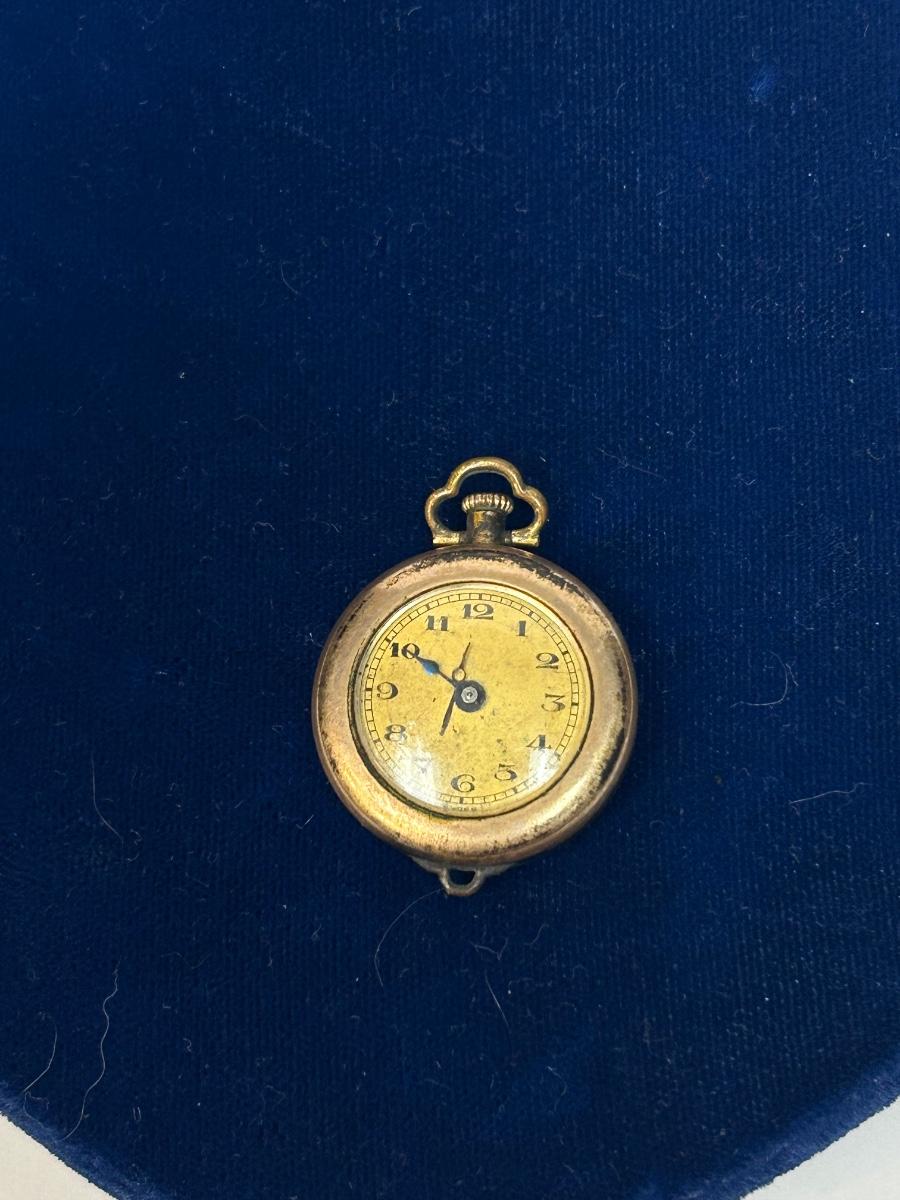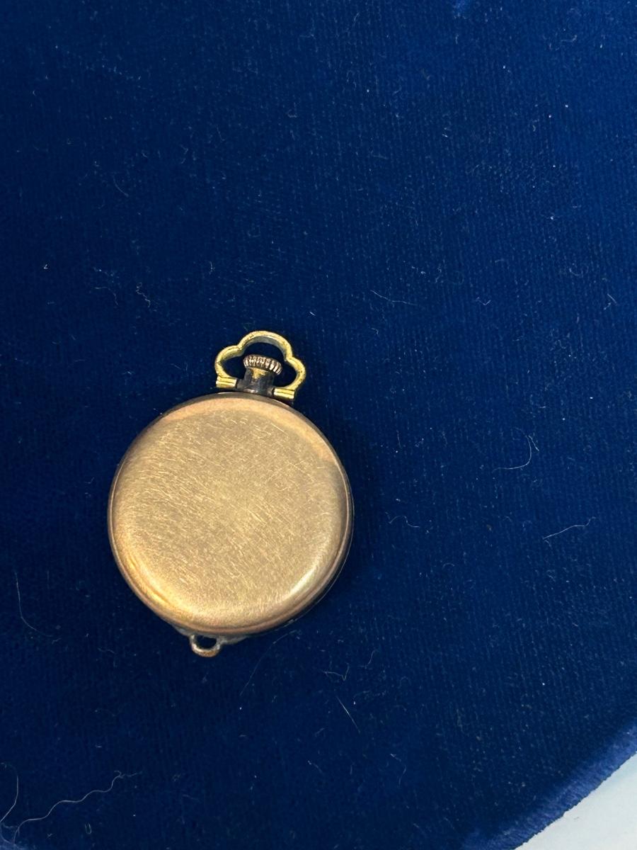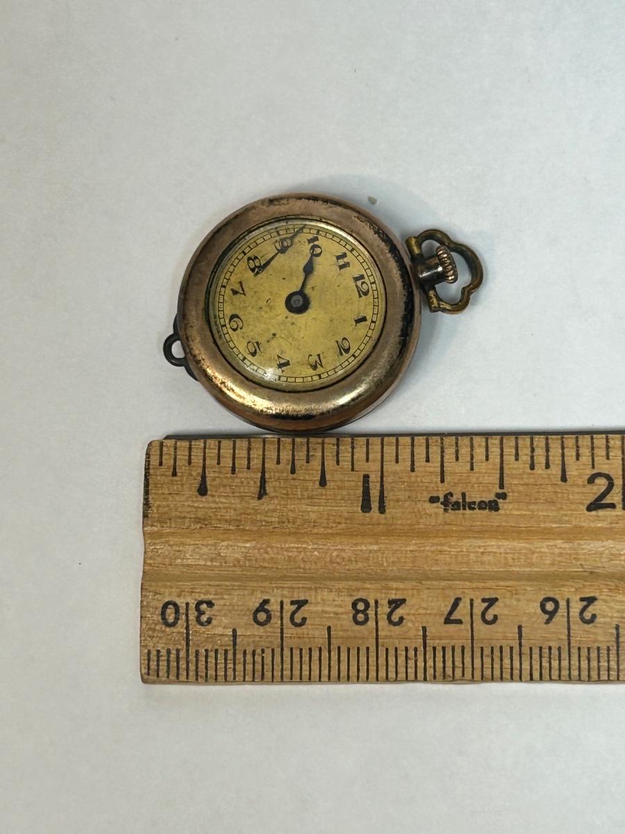 Small Vintage Gold Tone Pocket Watch For Parts or Repair Not Running. In aged condition. Great for parts, repair or crafts. One of the hands is loose inside the face. Small 1" size.