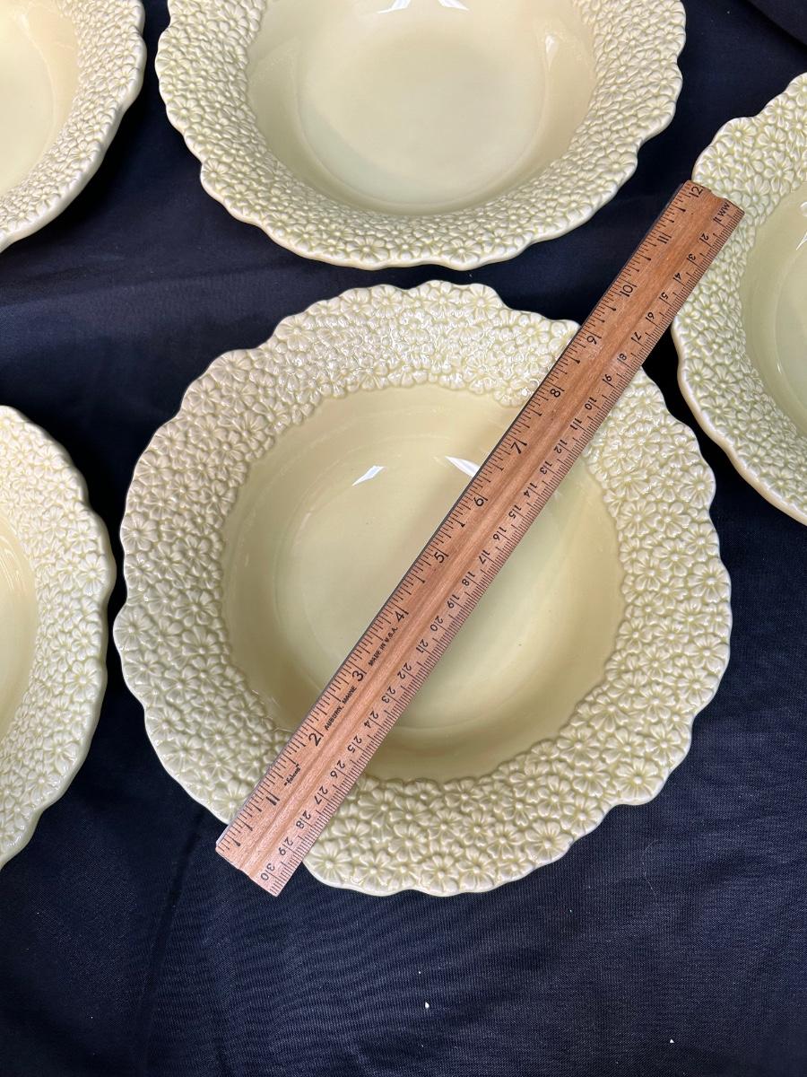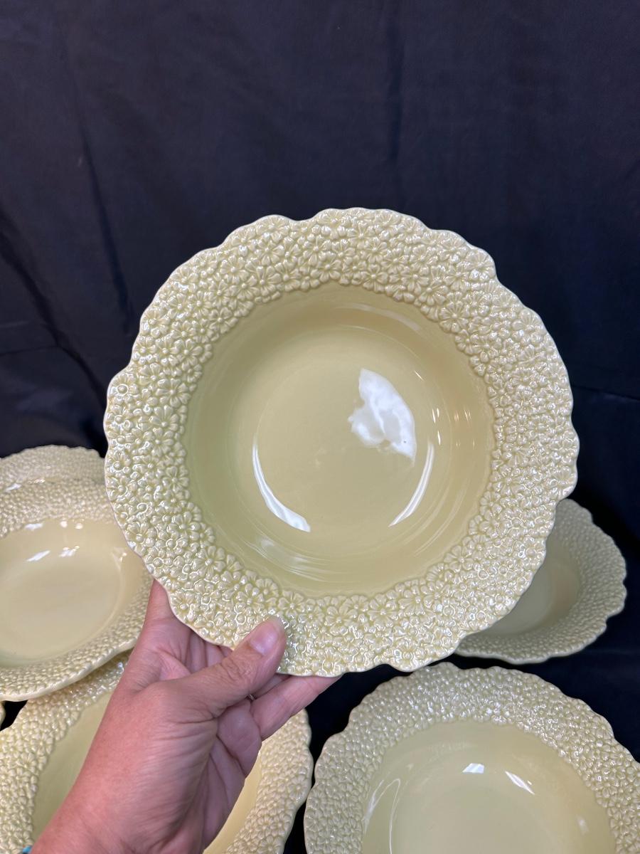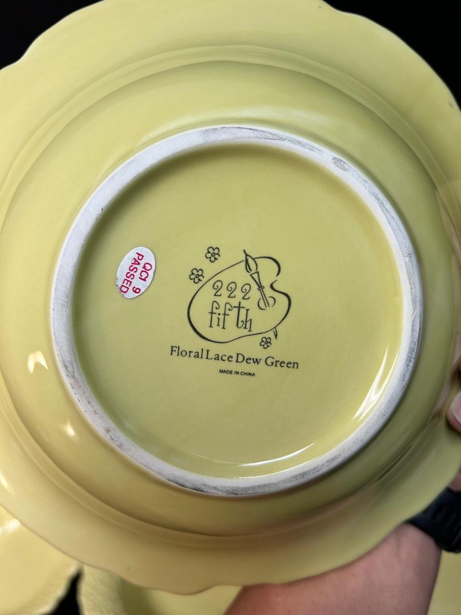 222 Fifth Floral Lace Dew Green Soup Bowl Set Daisy Flower Rim. Color is Dew Green but it is almost a yellow. Did find a couple flea bite chips but in useable condition.