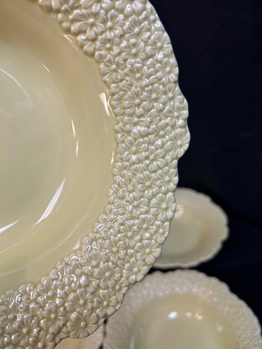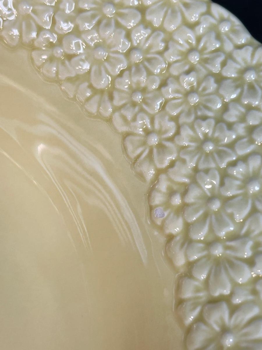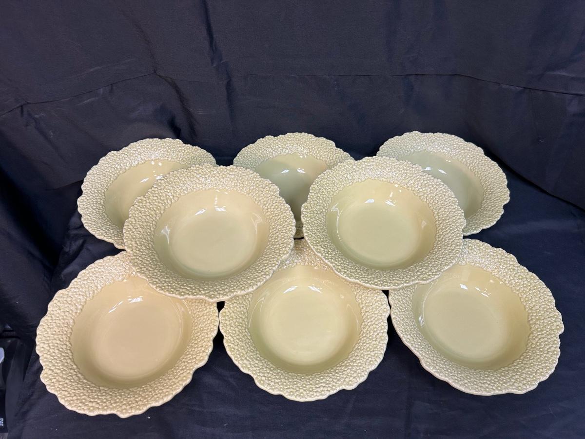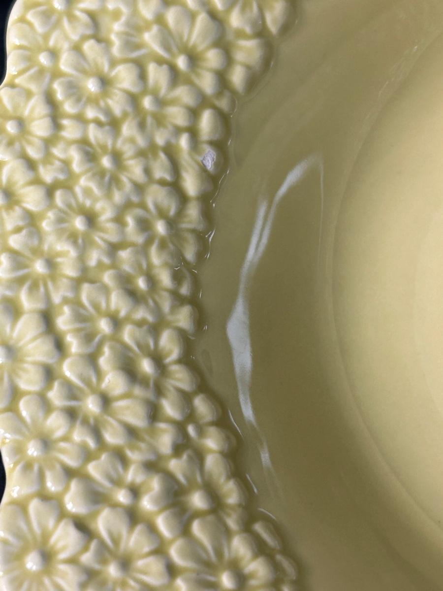 222 Fifth Floral Lace Dew Green Soup Bowl Set Daisy Flower Rim. Color is Dew Green but it is almost a yellow. Did find a couple flea bite chips but in useable condition.