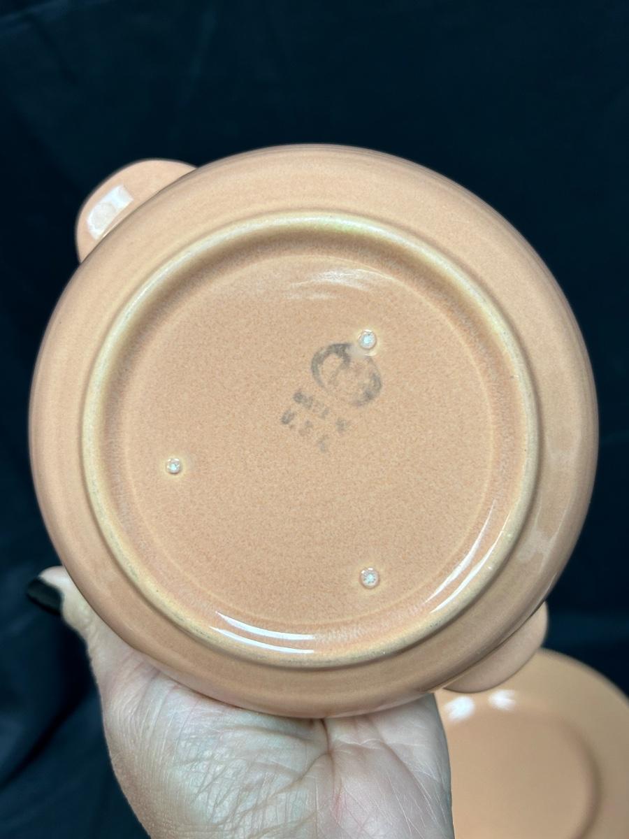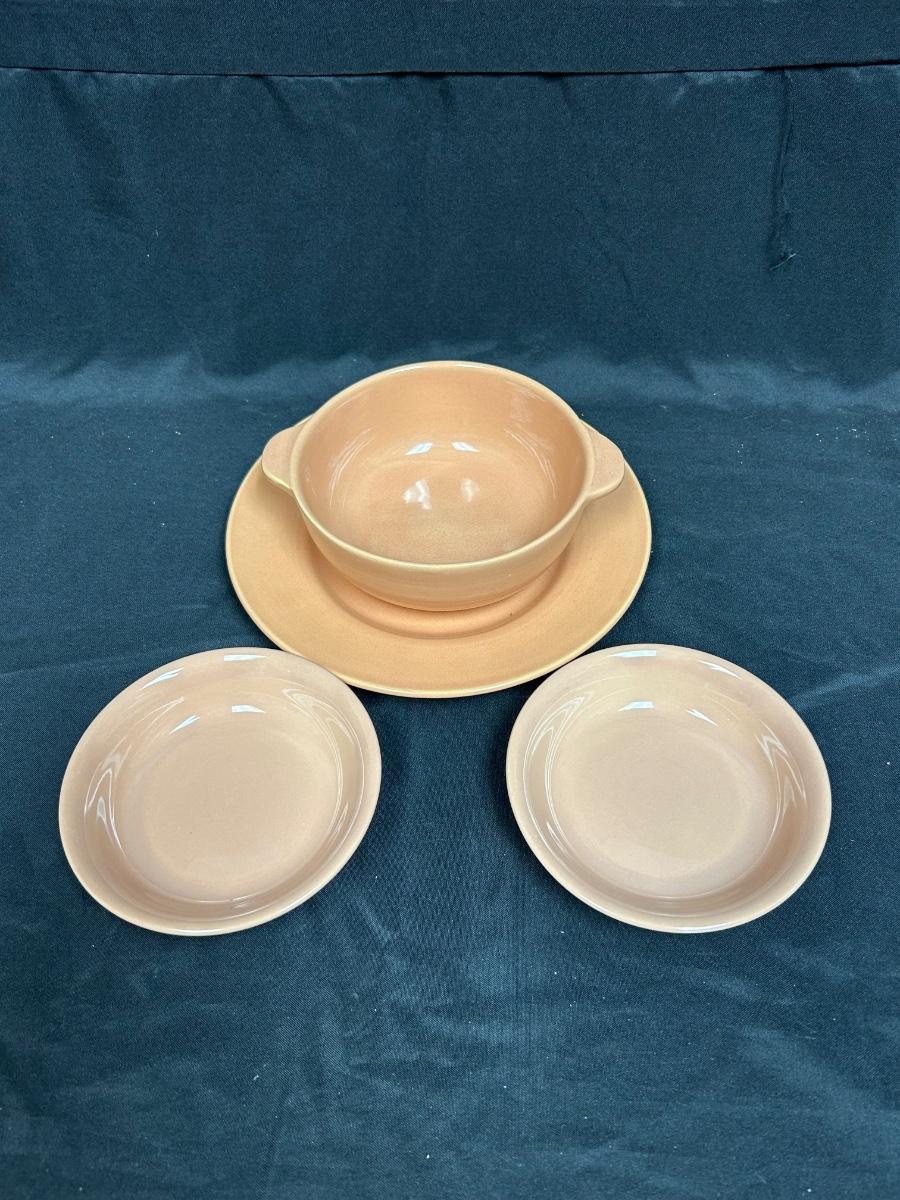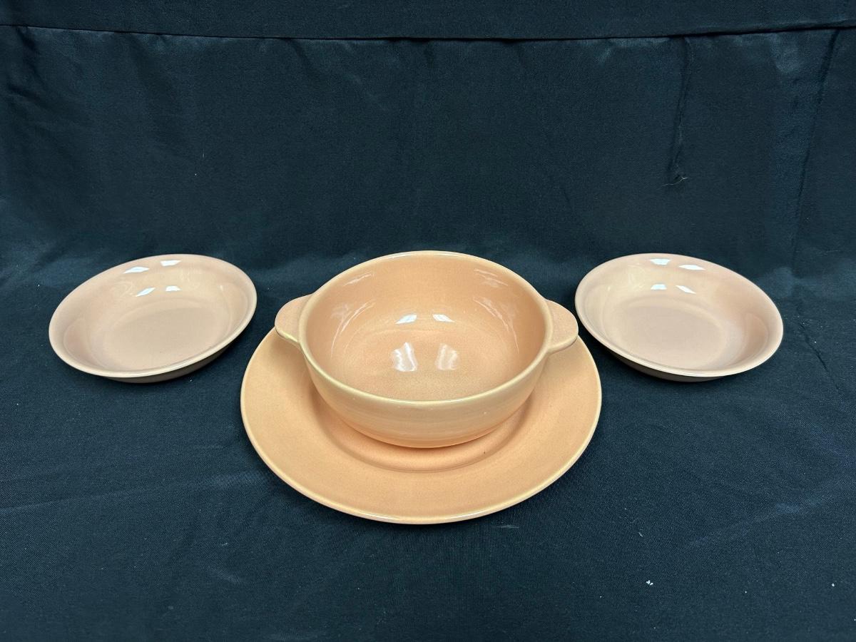 Vintage Peachy Pink California Pottery Fruit Bowls Handled Soup Bread Plate Franciscan Ware Gladding McBean. Fruit bowls are a little paler pink than the soup bowl and plate. All are in good condition.