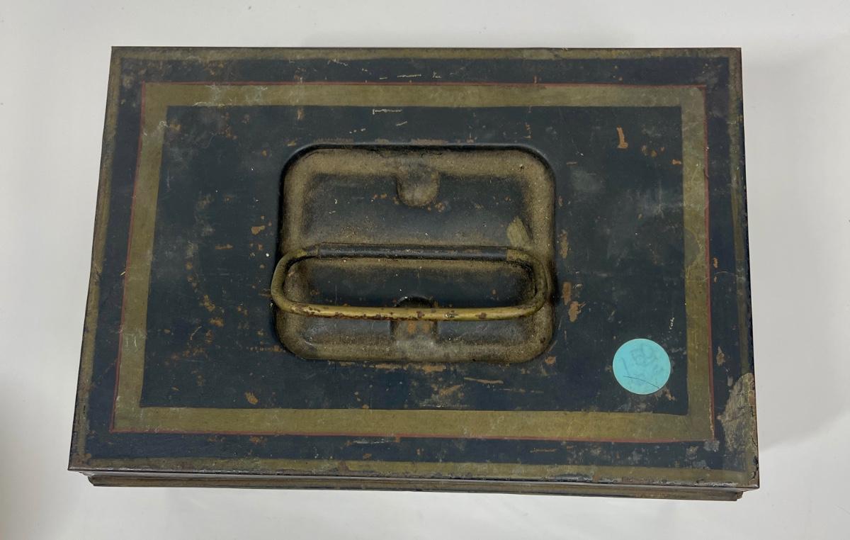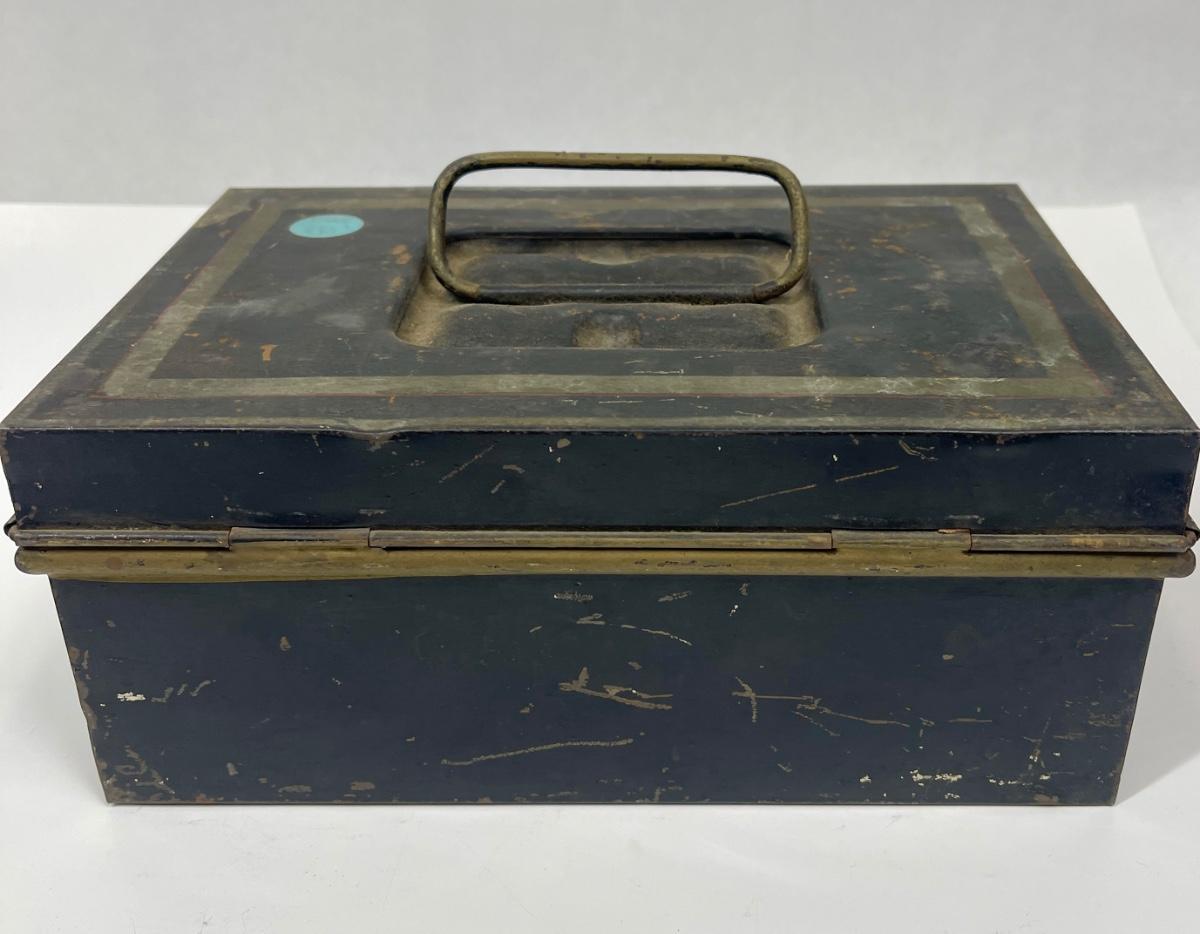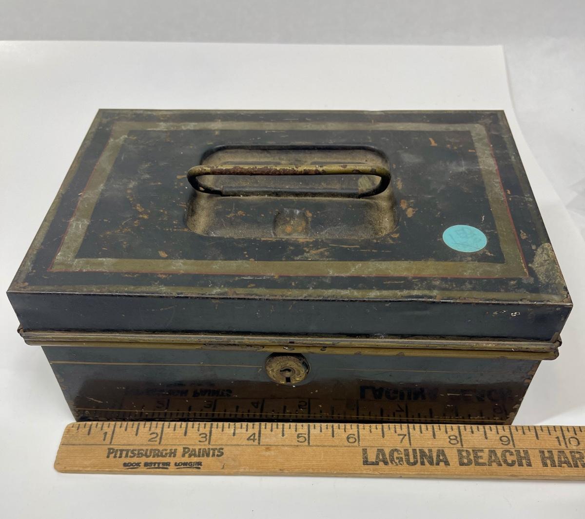 Approx. 9" long, hinged lid with top handle. Lock does not work. Slight surface rust.