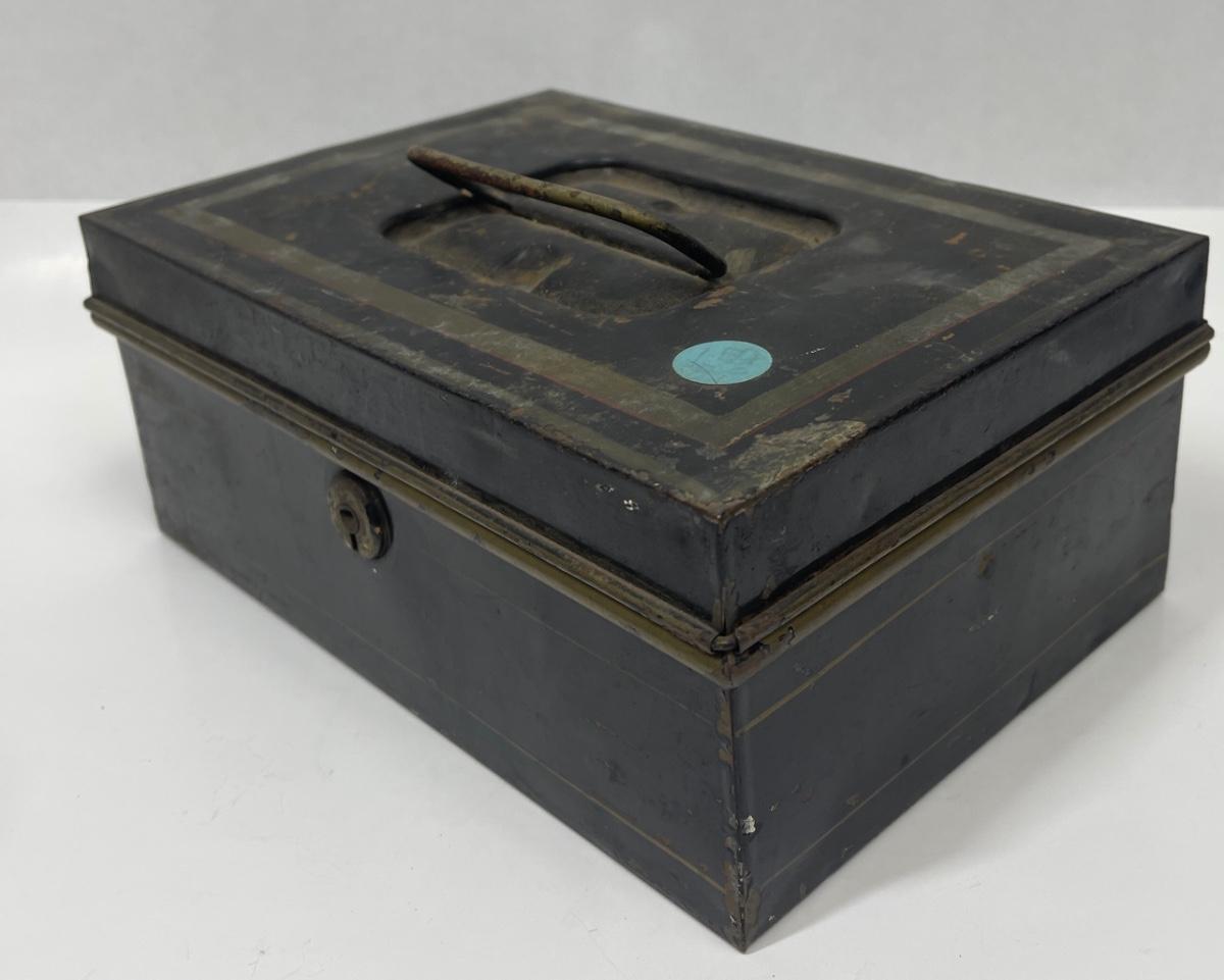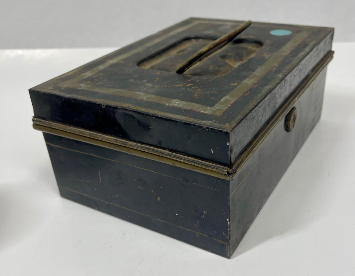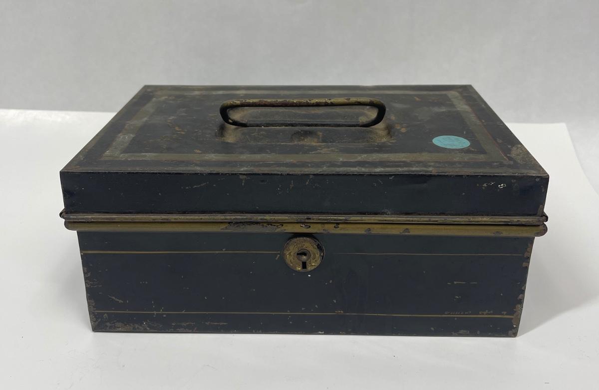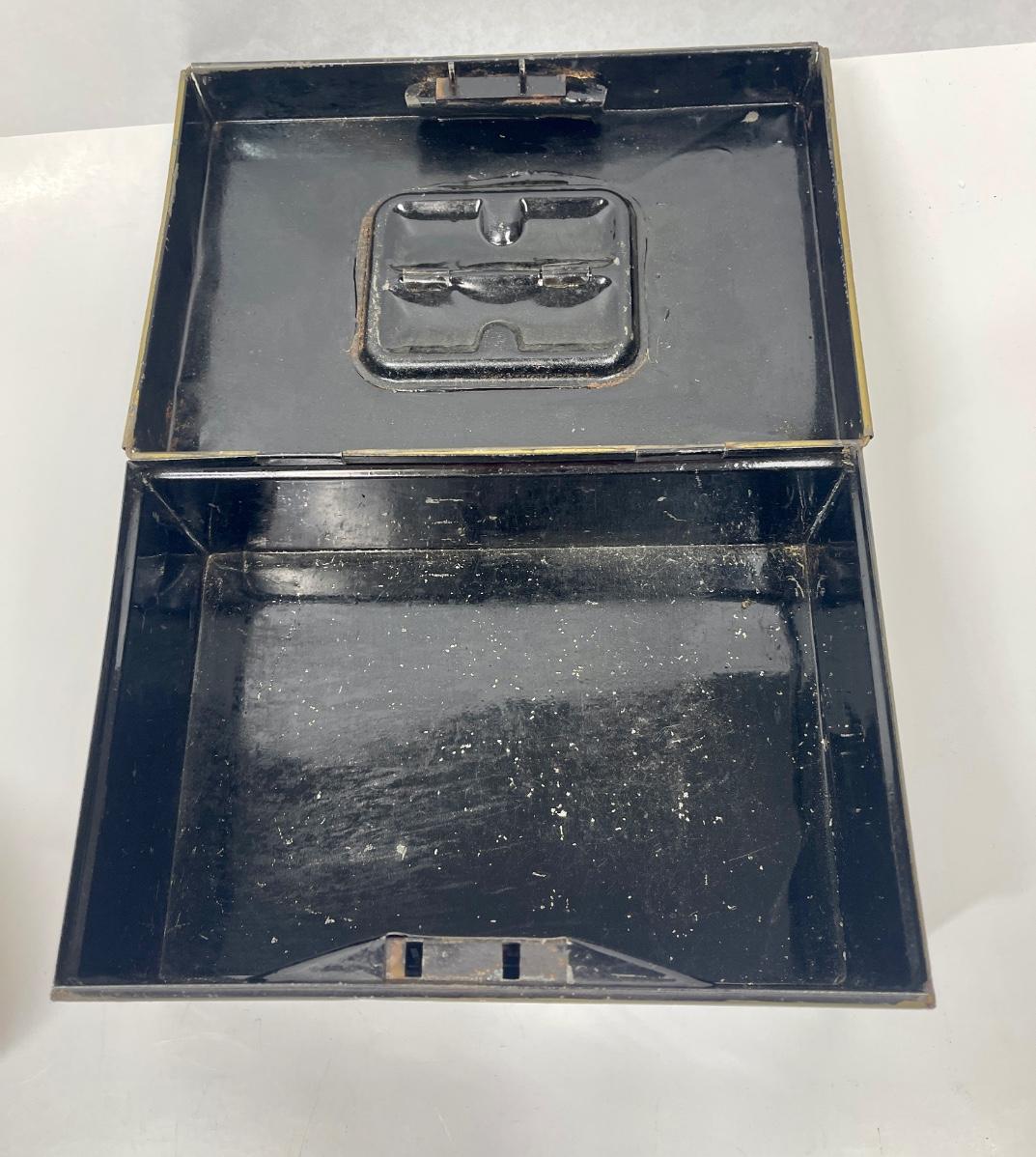 Approx. 9" long, hinged lid with top handle. Lock does not work. Slight surface rust.