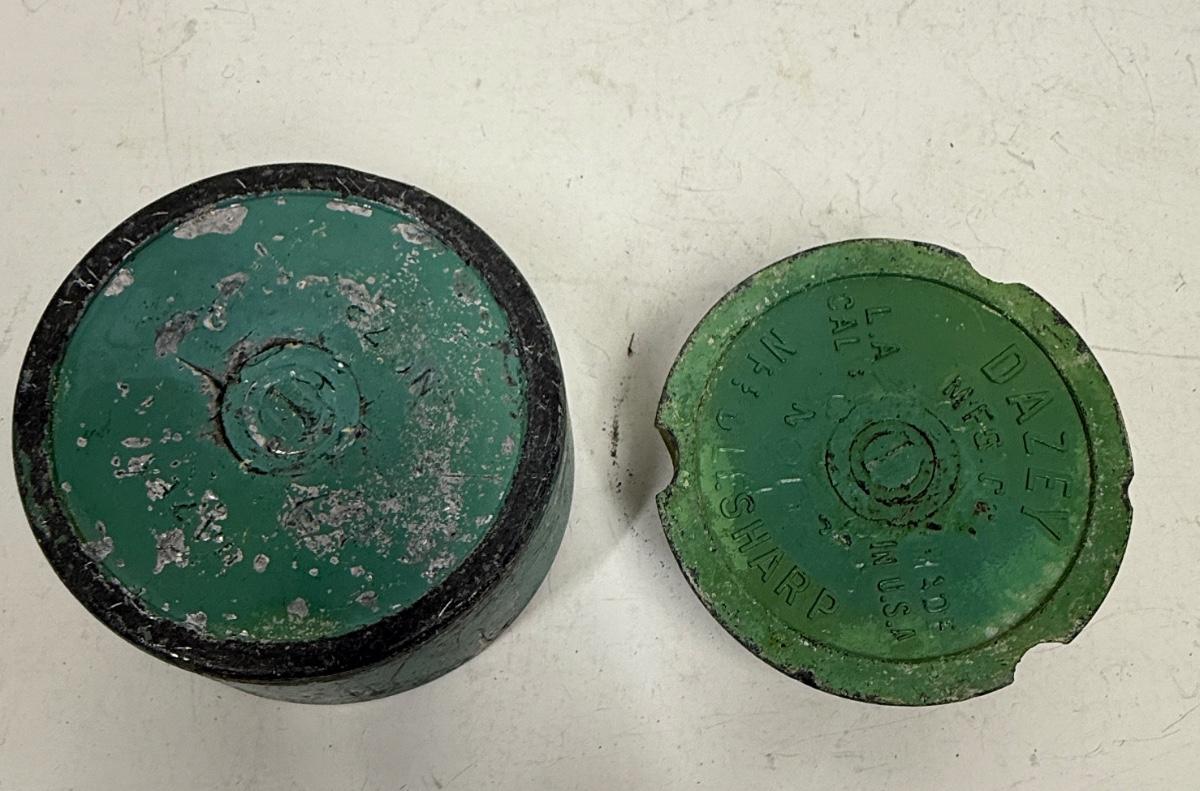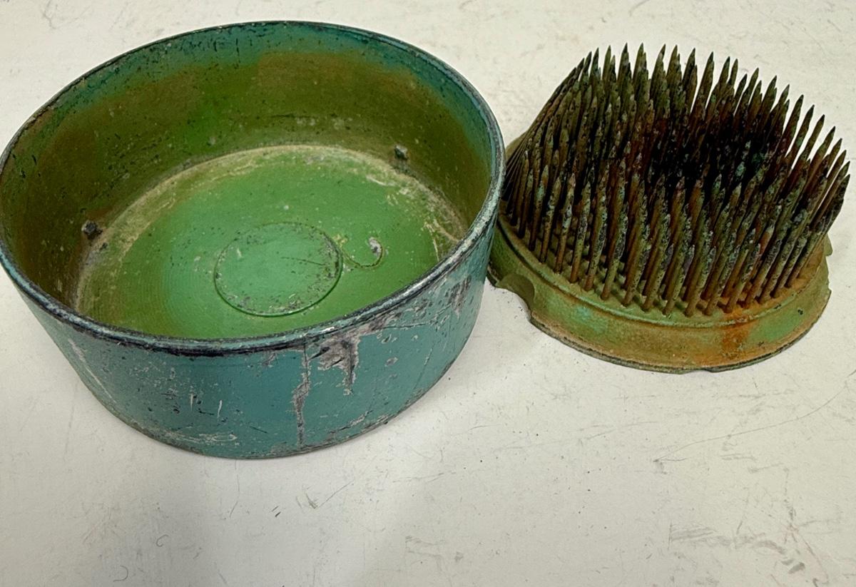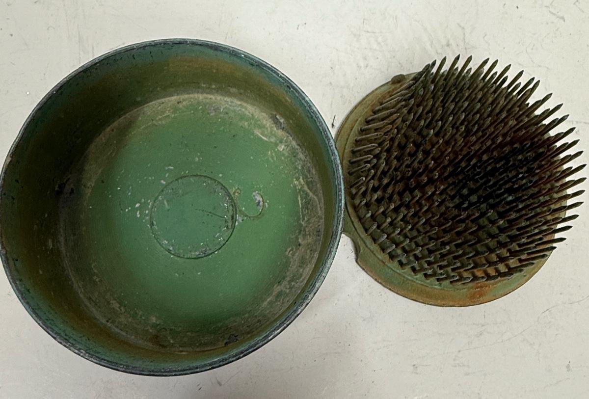 Antique PRIMITIVE Green Metal Pin Round Flower Frog Floral and tray. for storage