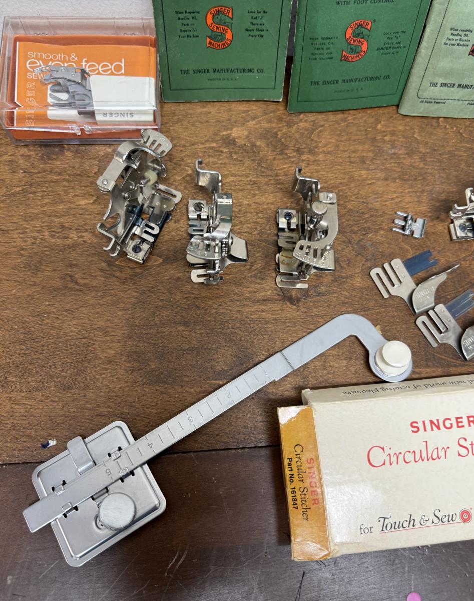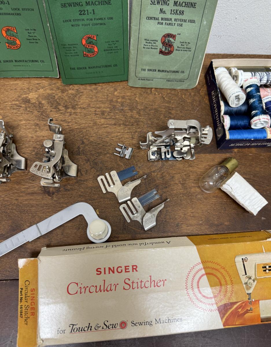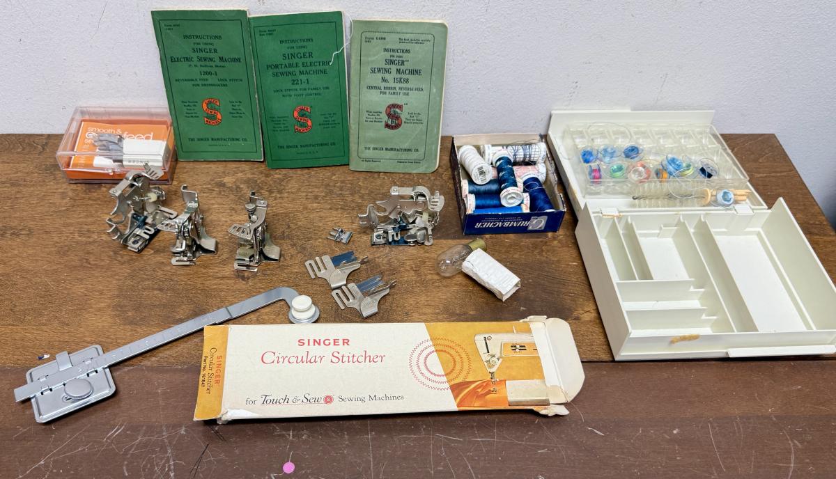 Circular stitcher, bobbins with thread, binder and ruffler attachments, instruction booklets, and more.