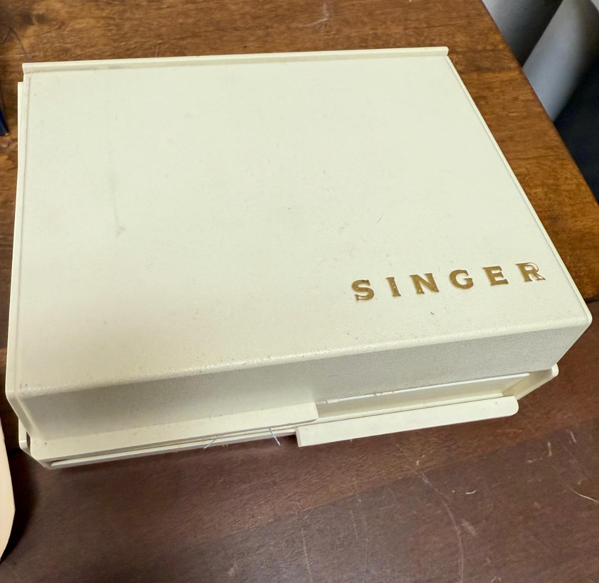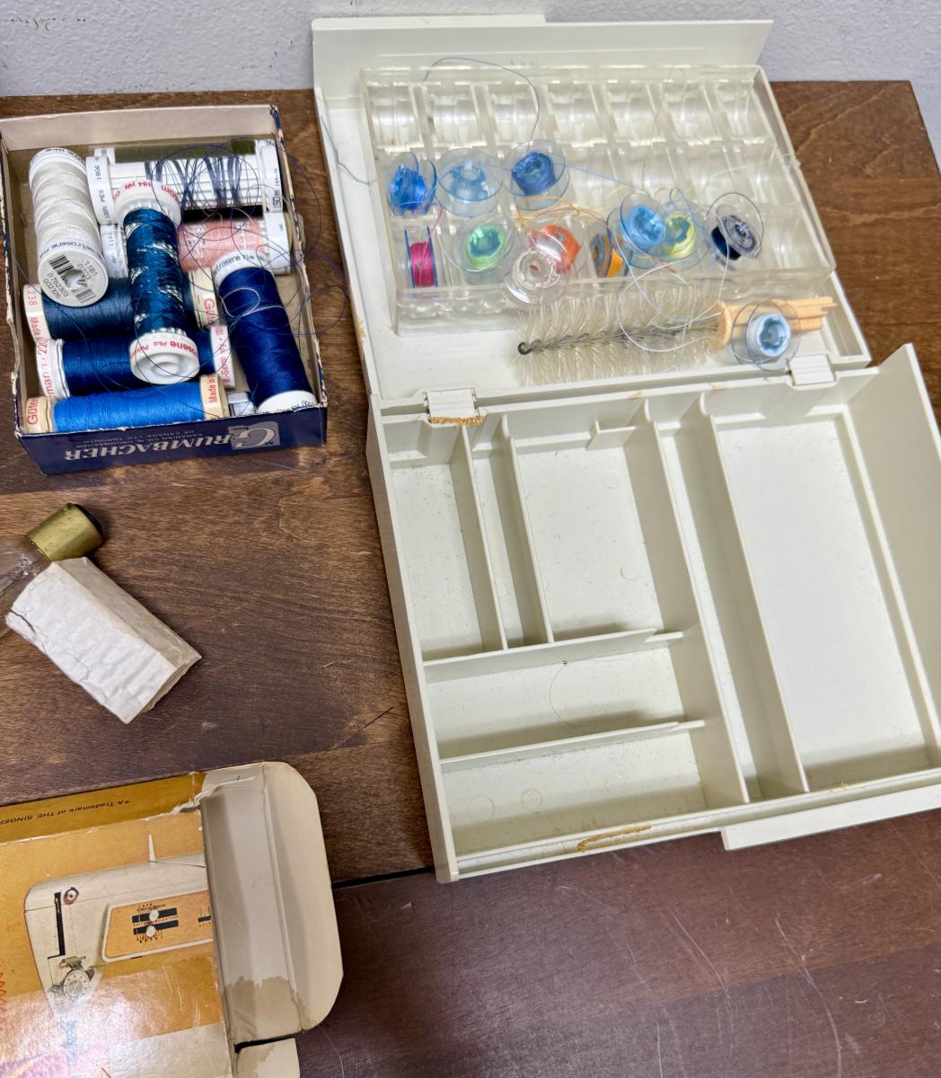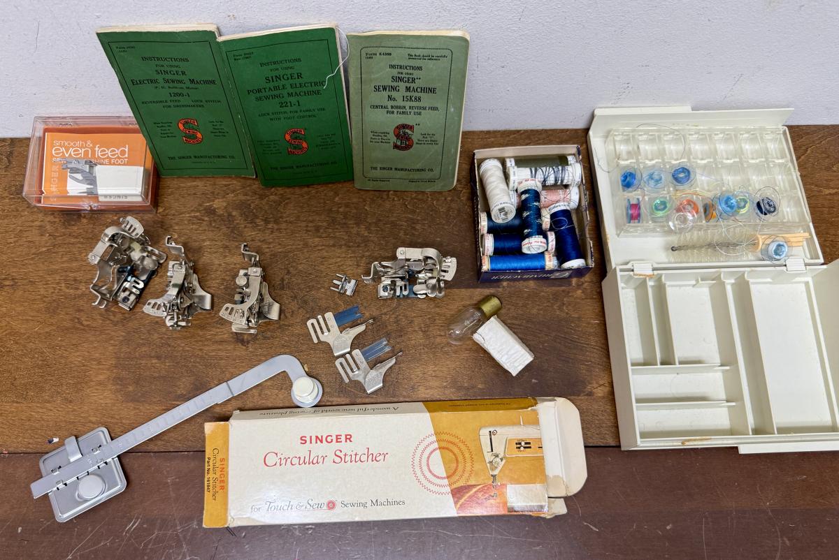 Circular stitcher, bobbins with thread, binder and ruffler attachments, instruction booklets, and more.