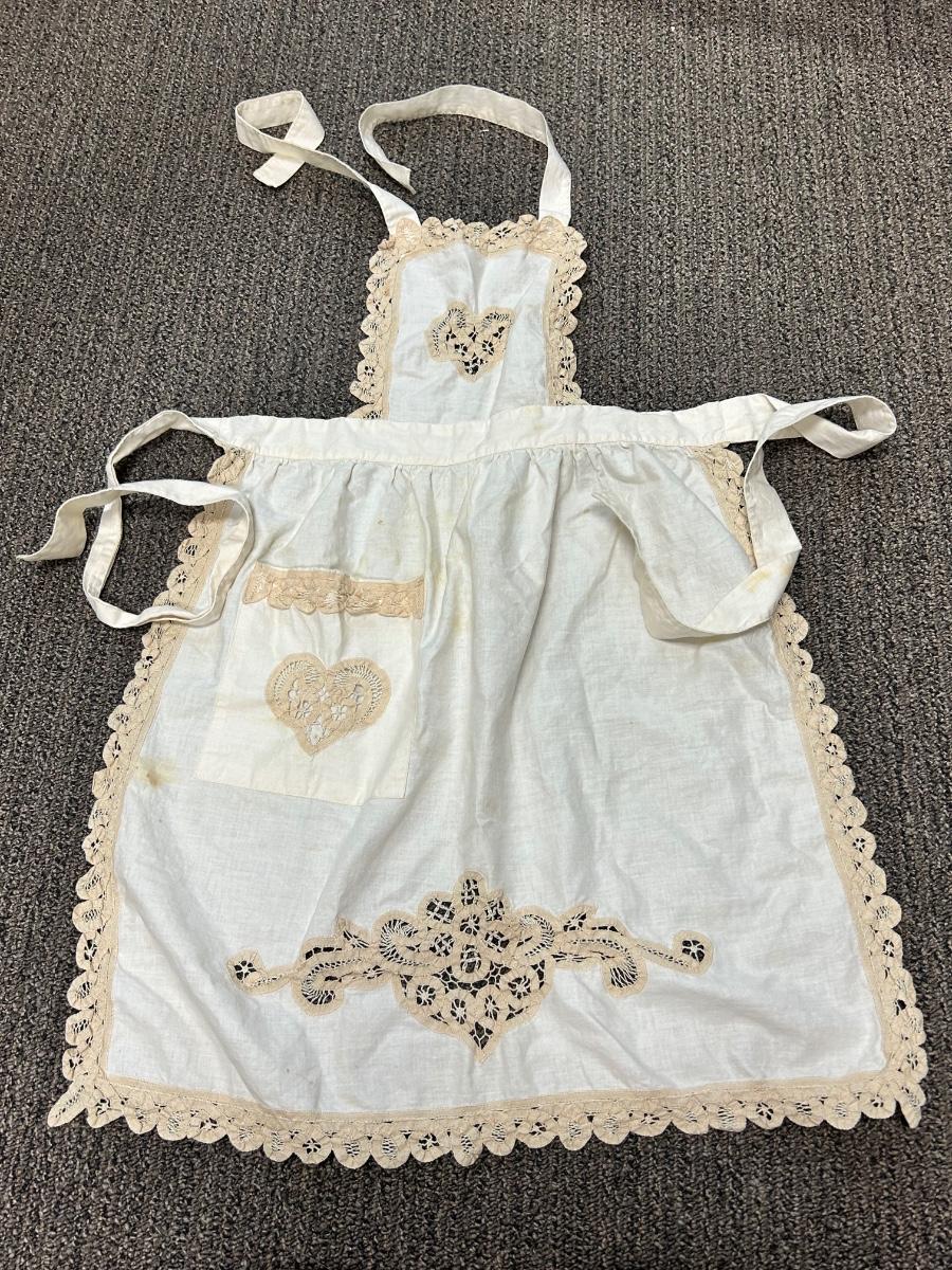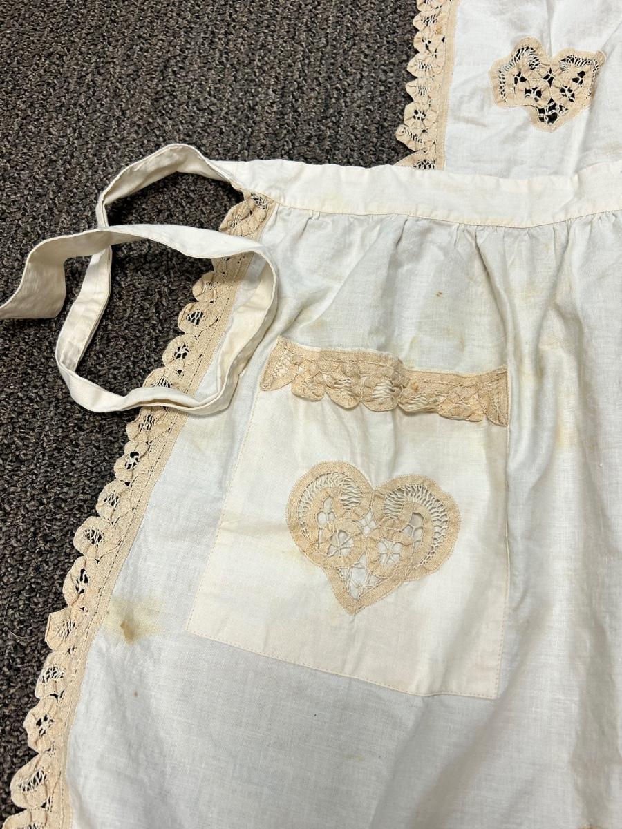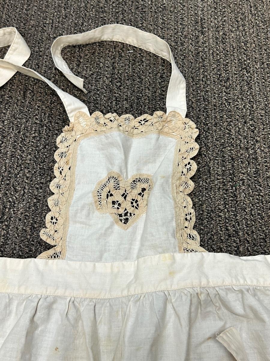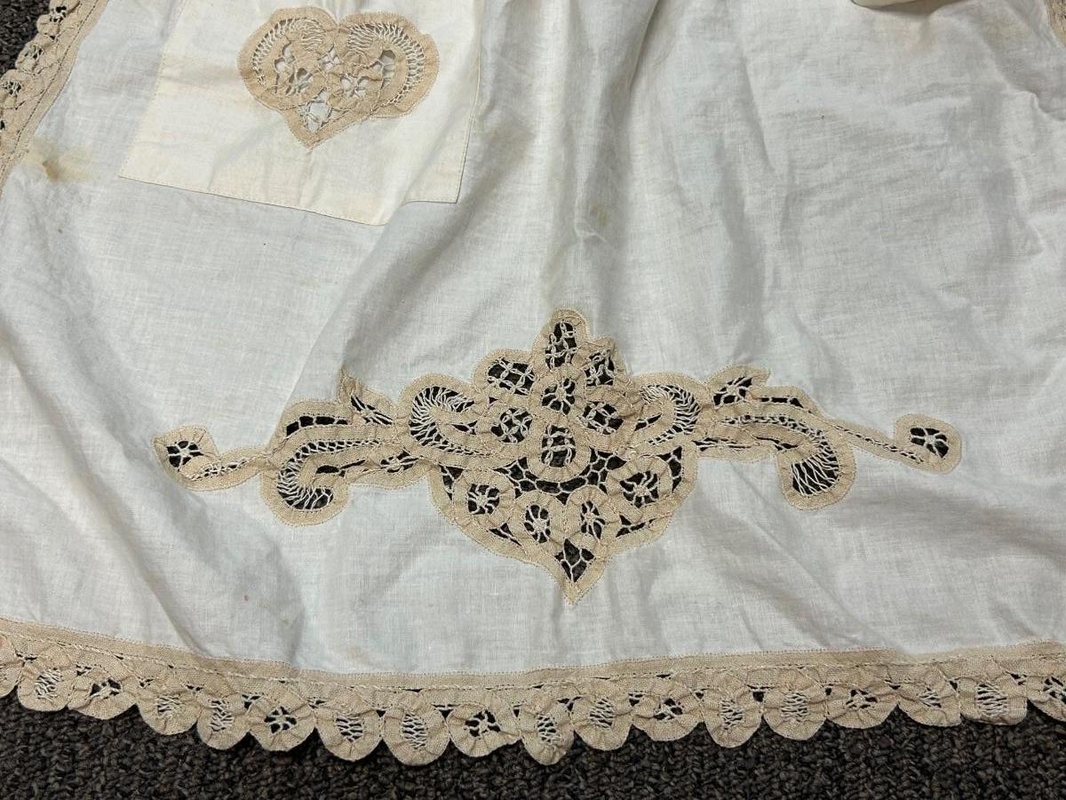 Vintage Off White Lace Details Full Apron. In good vintage condition. Some light discolor and spotting may be present.