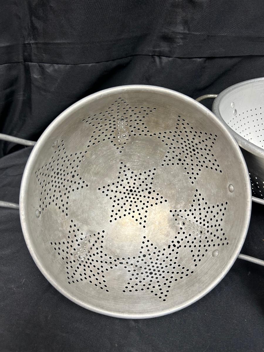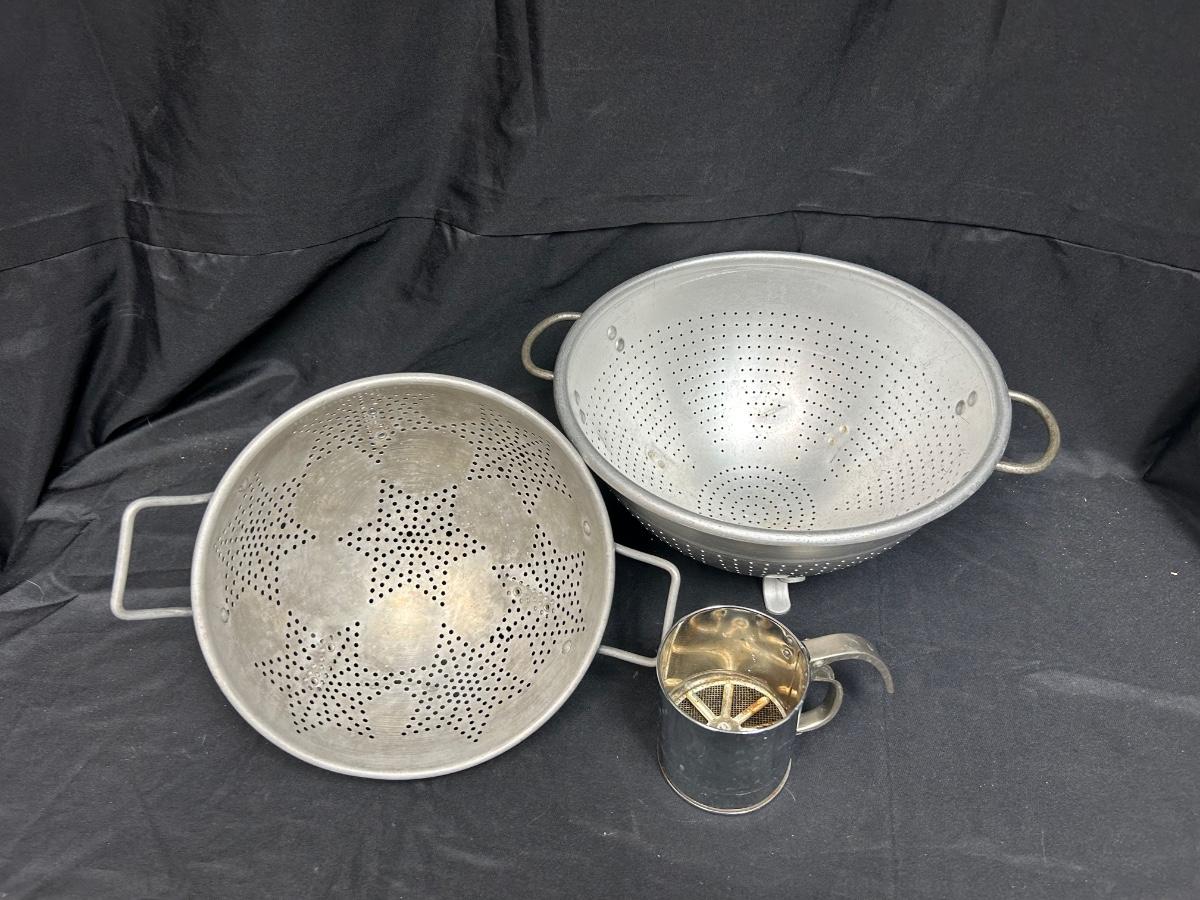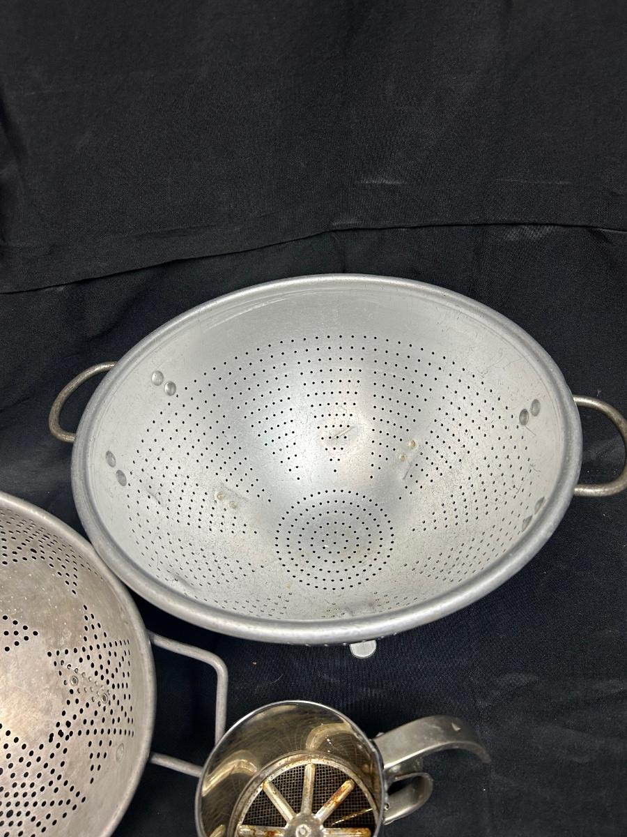Vintage Aluminum Metal Kitchen Strainer Colanders Small Sifter. In good vintage condition. All pieces are in useable condition.