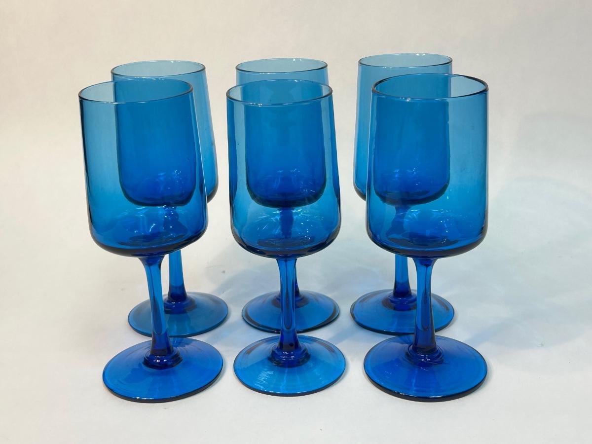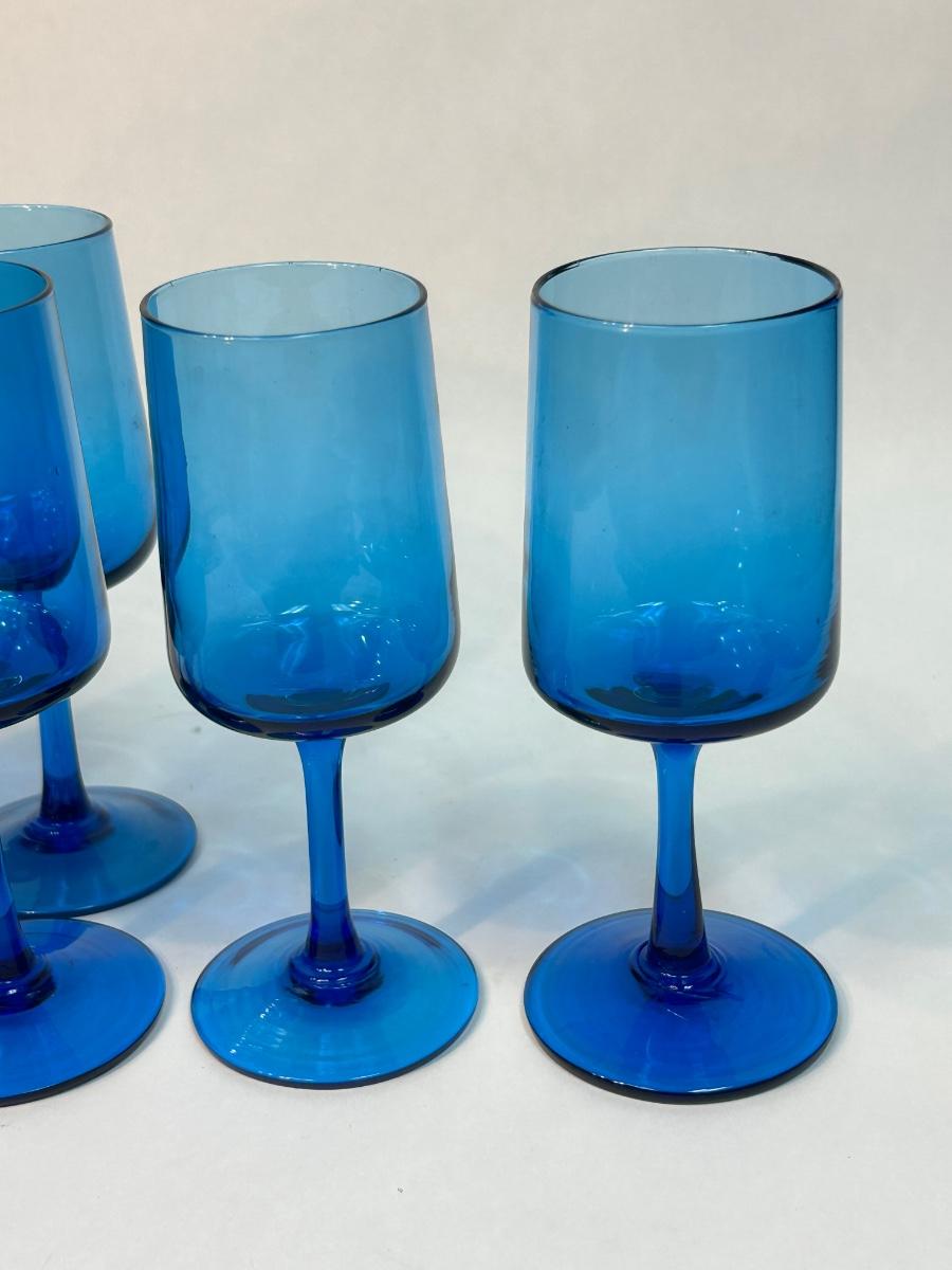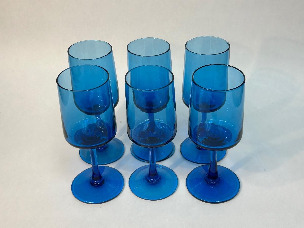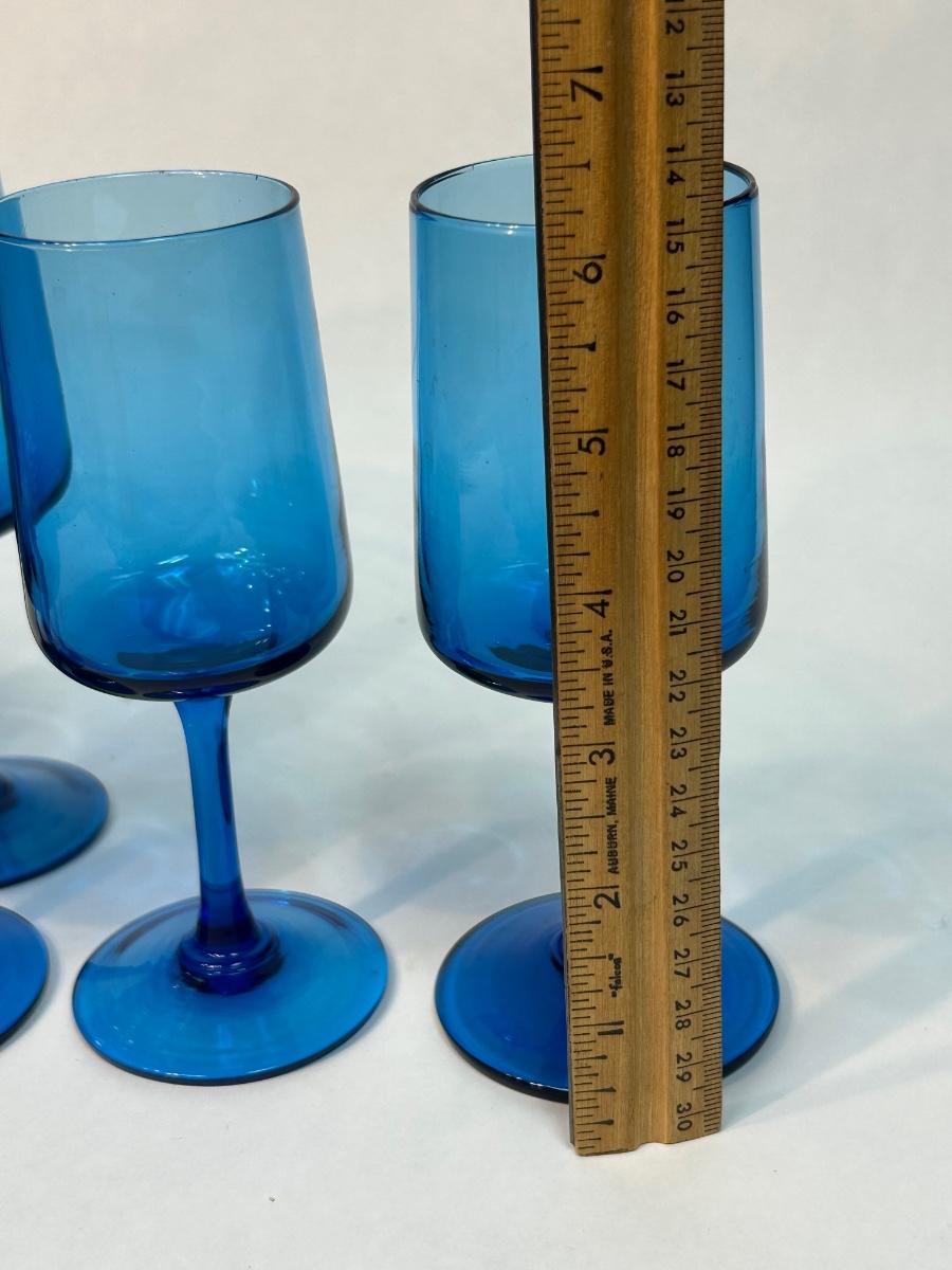Vintage Royal Blue Goblet Stemware Wine Water Glasses Set of 6. In good condition. No chips found. Look to be vintage blown glass rather than pressed as there is very slight variations in size and shape. About 6" size.
