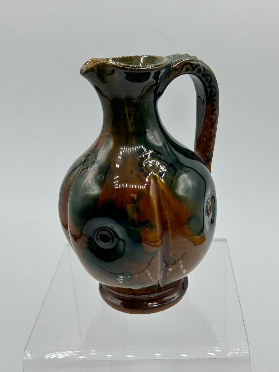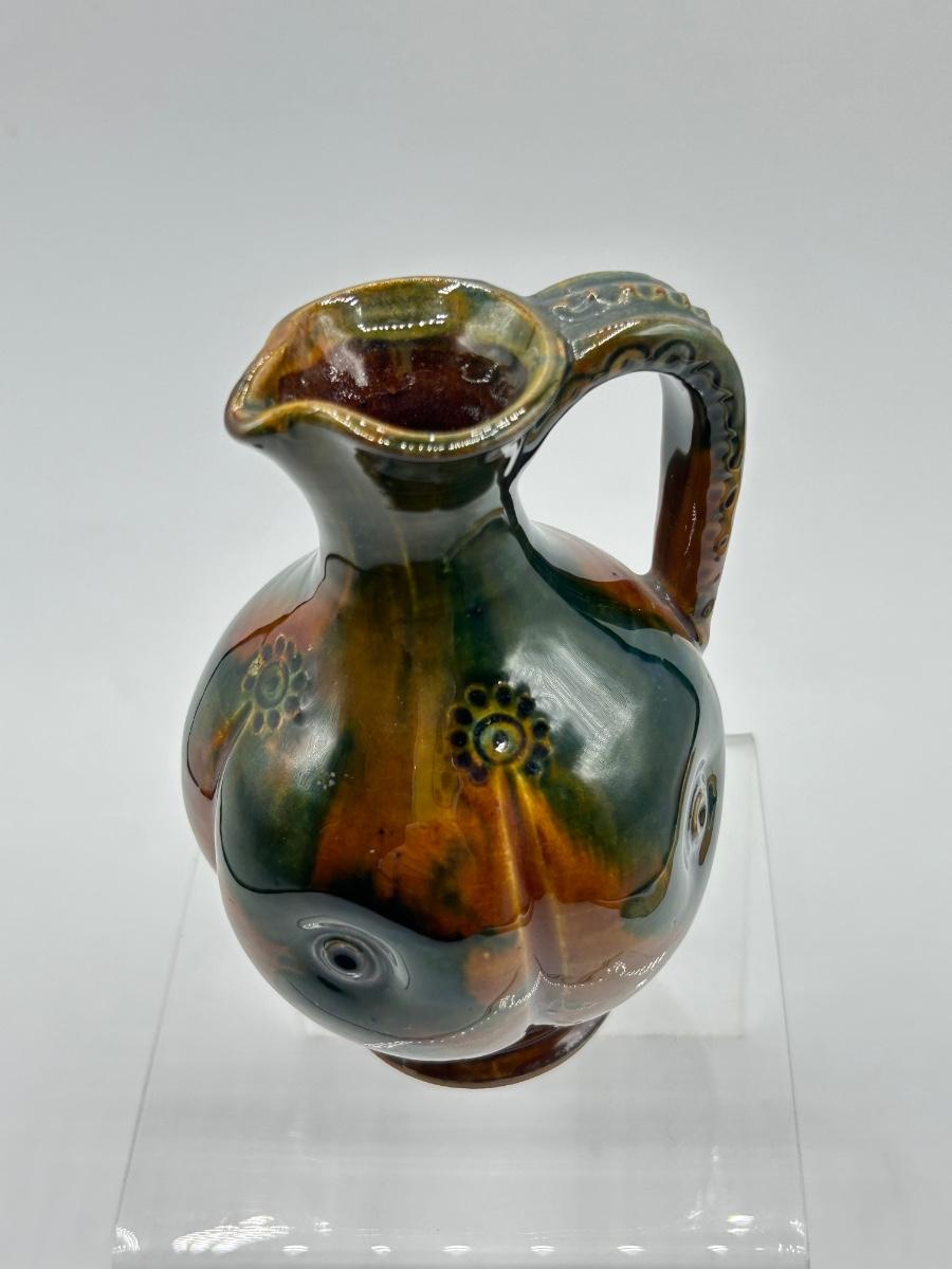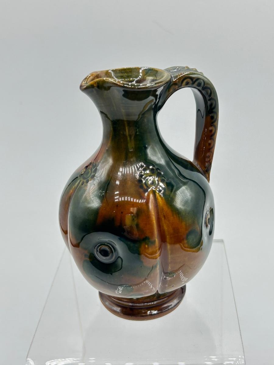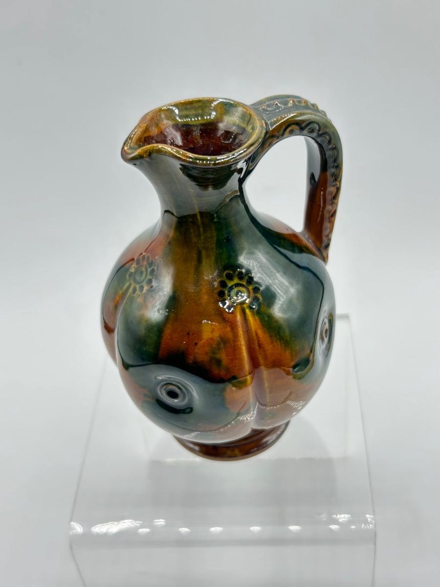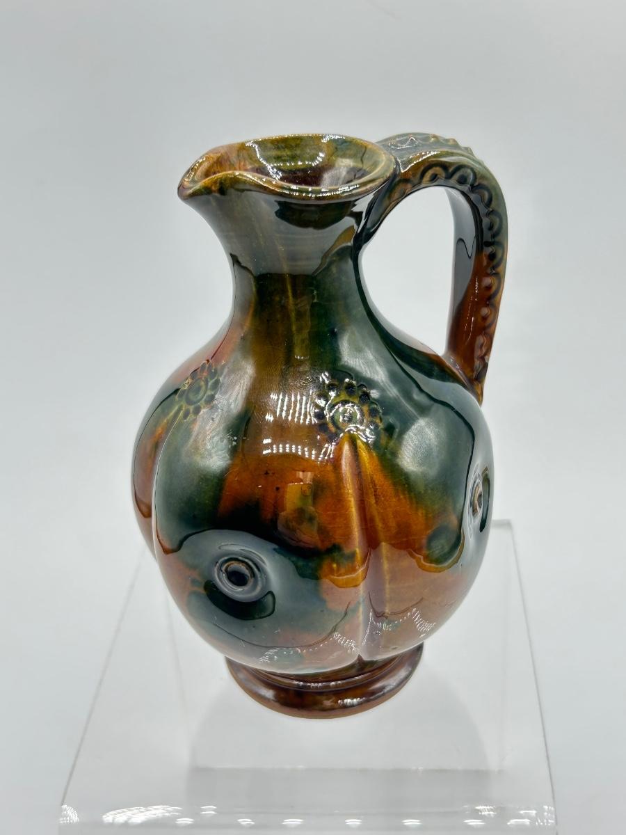 Vintage Orange & Green Abstract Stamped Thrown Pottery Clay Pitcher