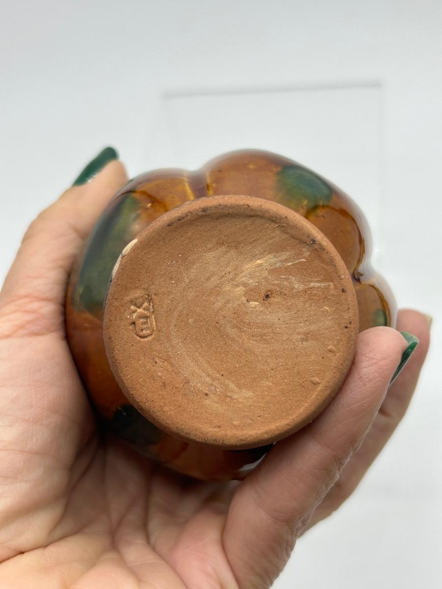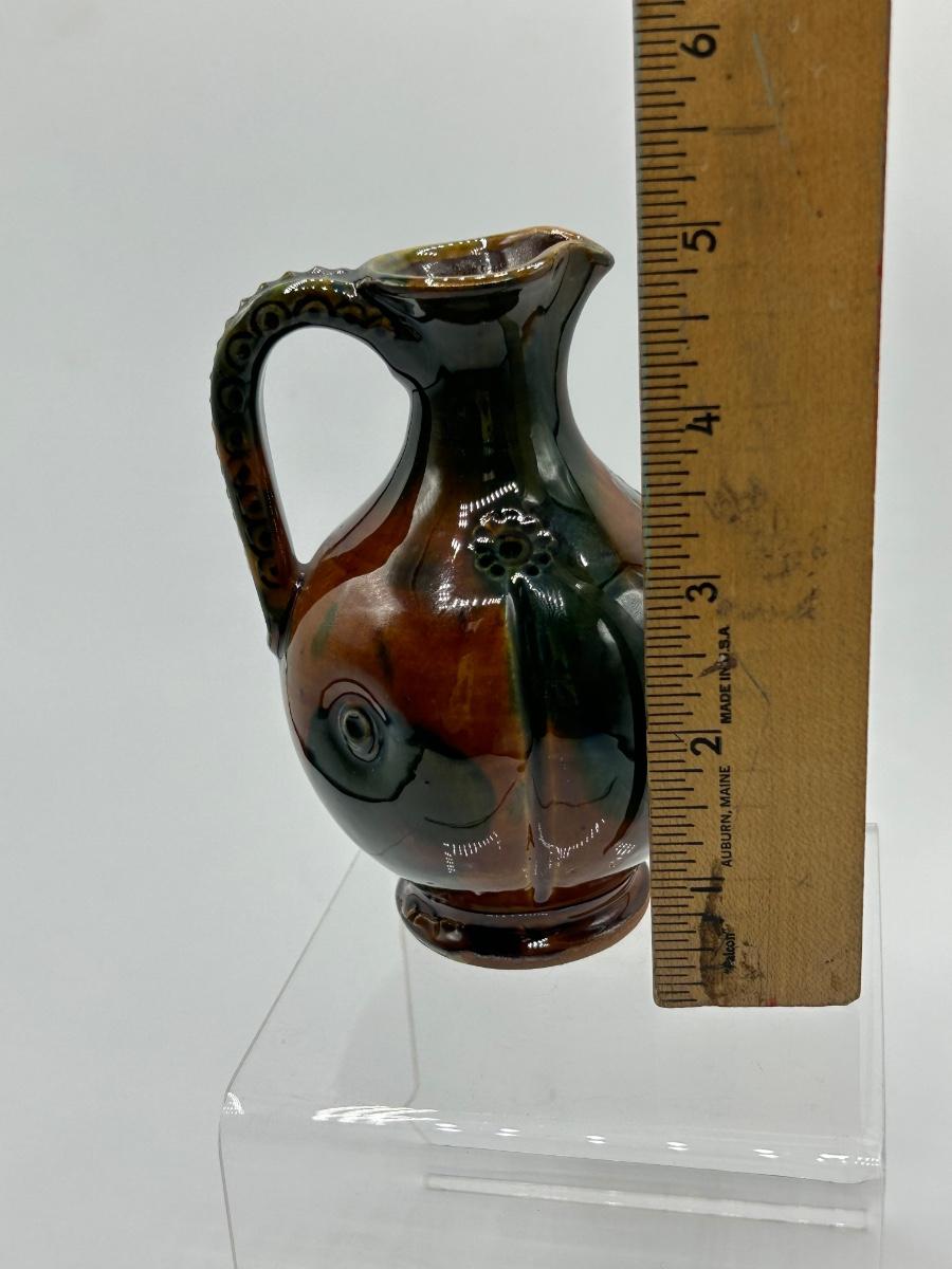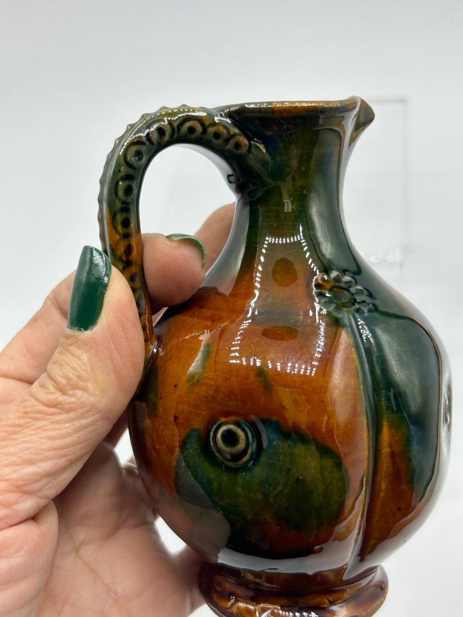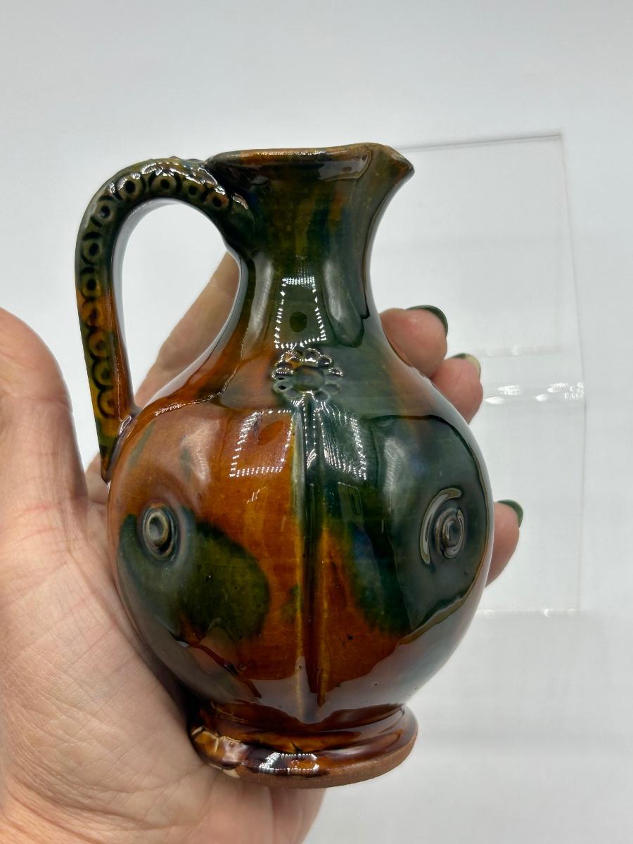 Vintage Orange & Green Abstract Stamped Thrown Pottery Clay Pitcher. In good condition, no chips or cracks. Displays well, about 5" tall. It is hallmarked on the bottom.