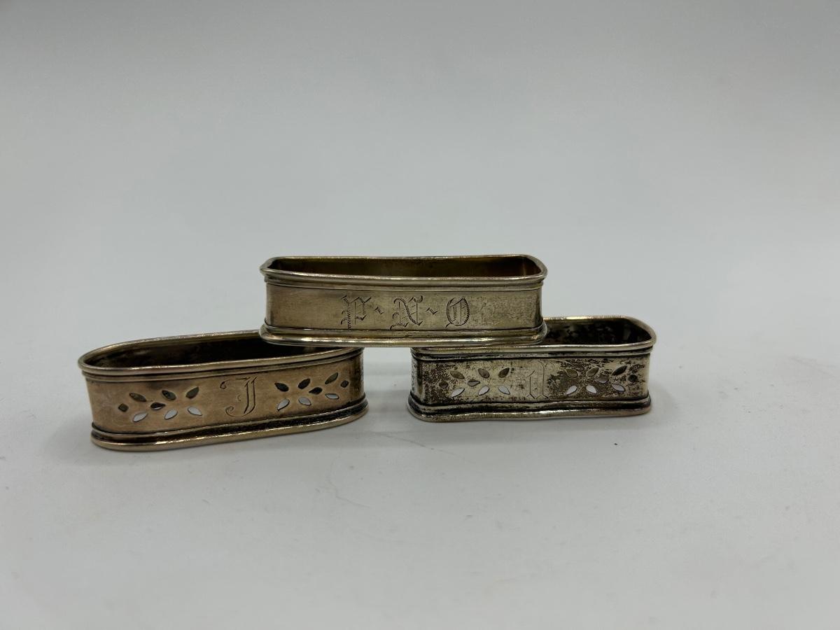 Set of Three Sterling Silver Napkin Rings Monogrammed Engraved. All three marked sterling. A little bent from age and storage. All have been monogrammed.