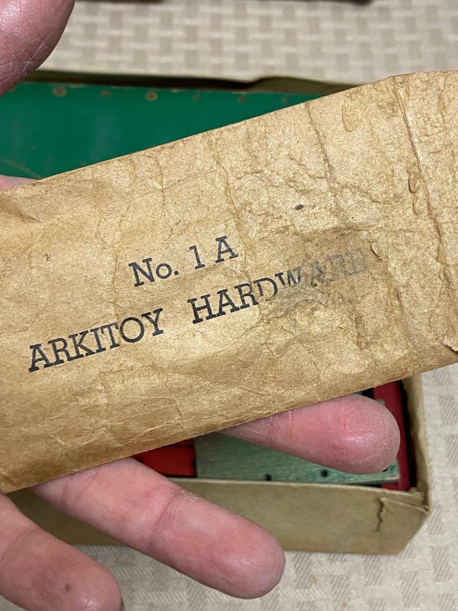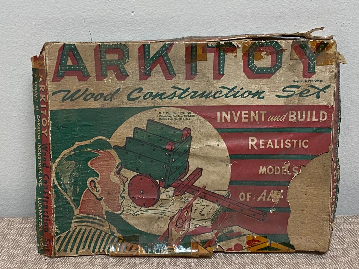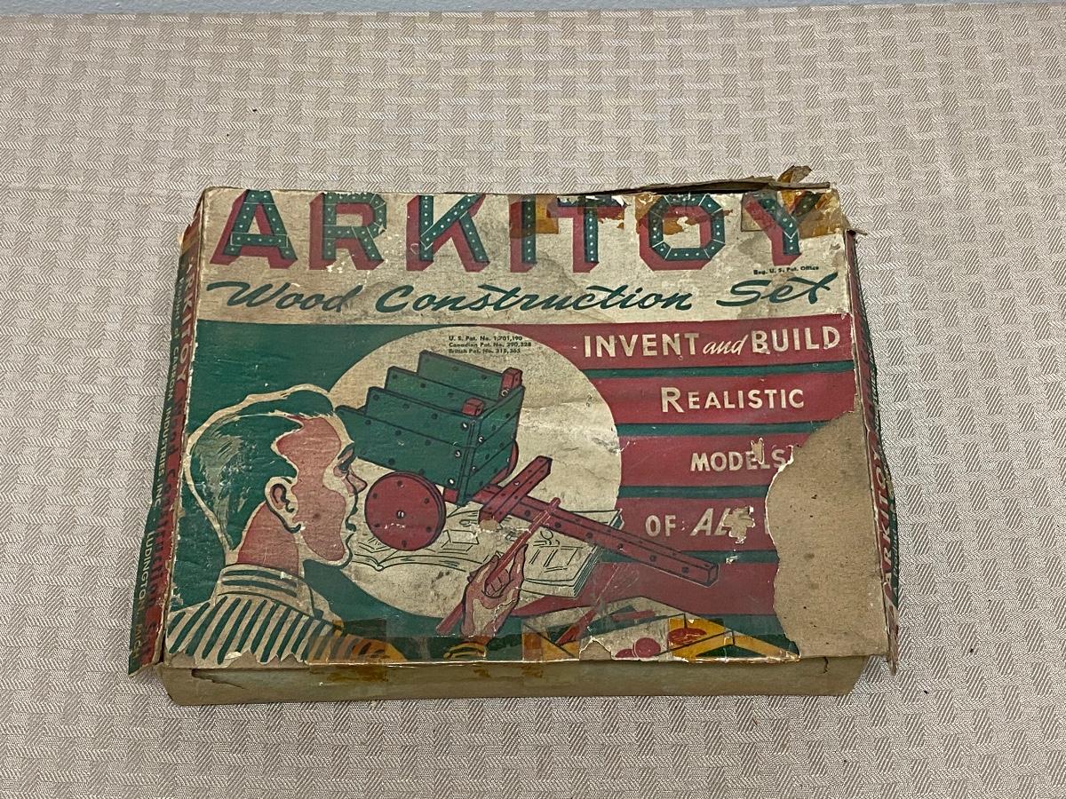 Vintage Arkitoy Wood Construction Set. Box is worn. Looks to be complete or mostly complete including booklet and screws.