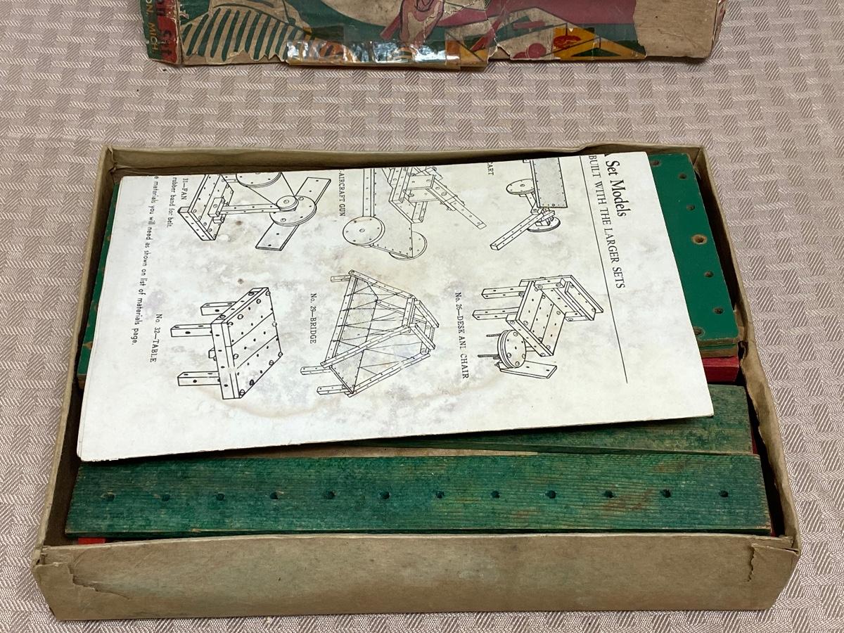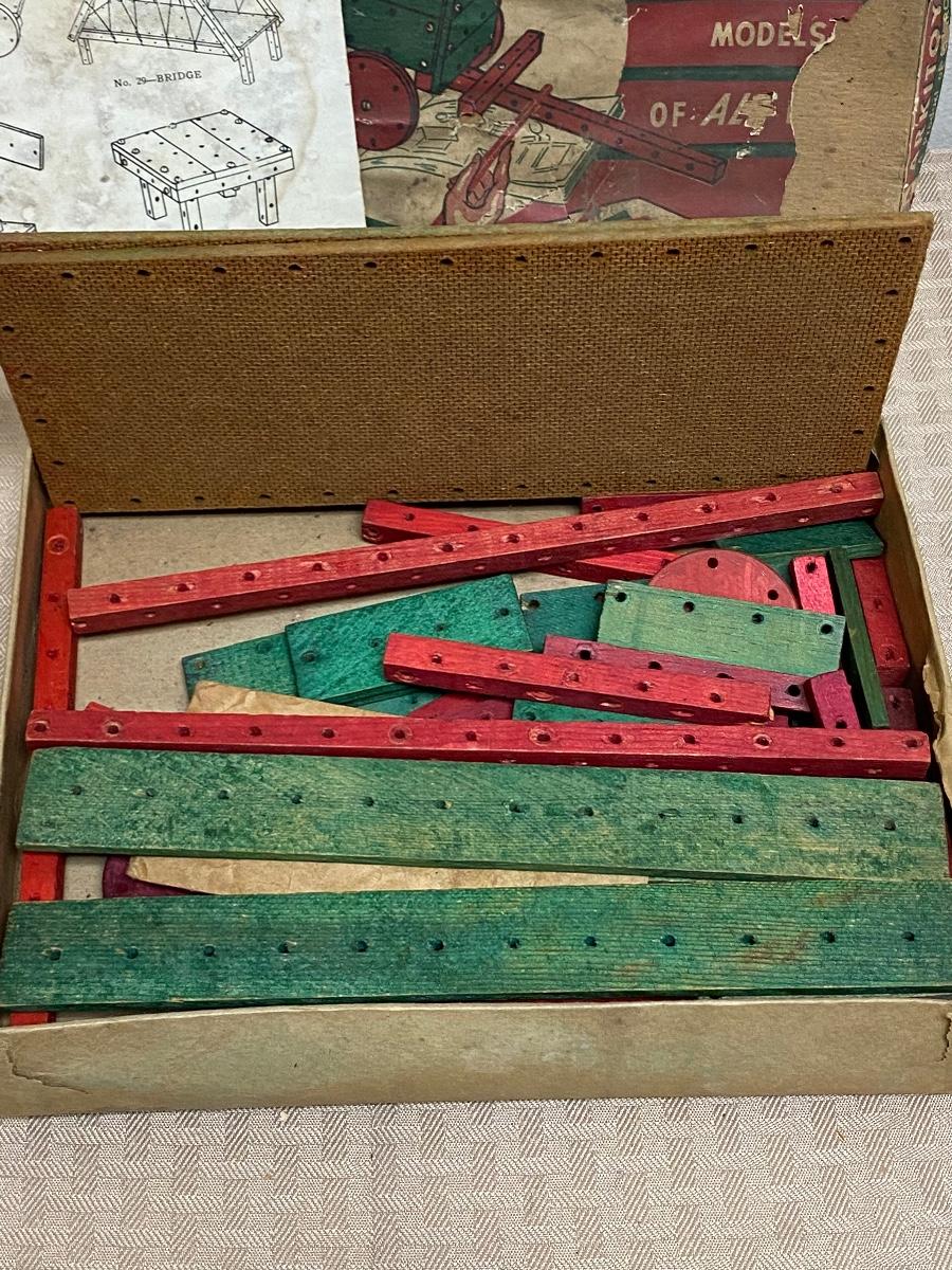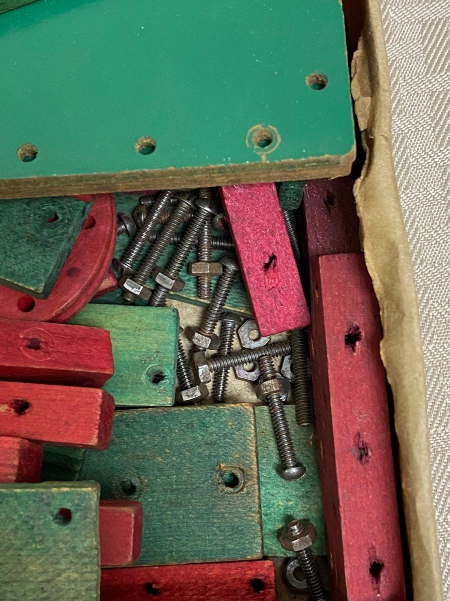 Vintage Arkitoy Wood Construction Set. Box is worn. Looks to be complete or mostly complete including booklet and screws.