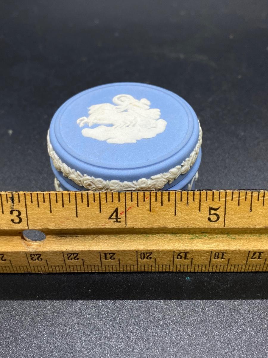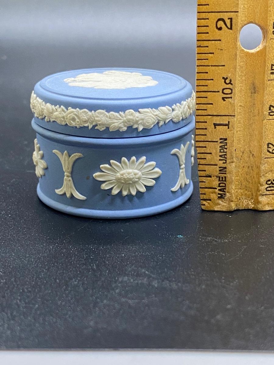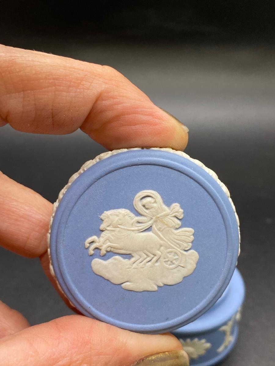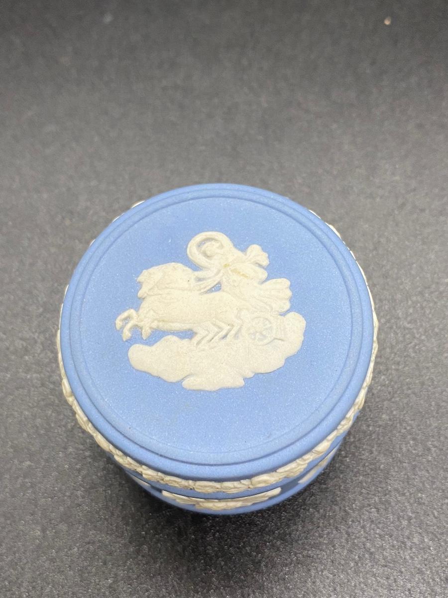Small Lidded Wedgwood Blue Jasperware Trinket Dish Daisy & Chariot. In excellent condition. About 1.5" size.