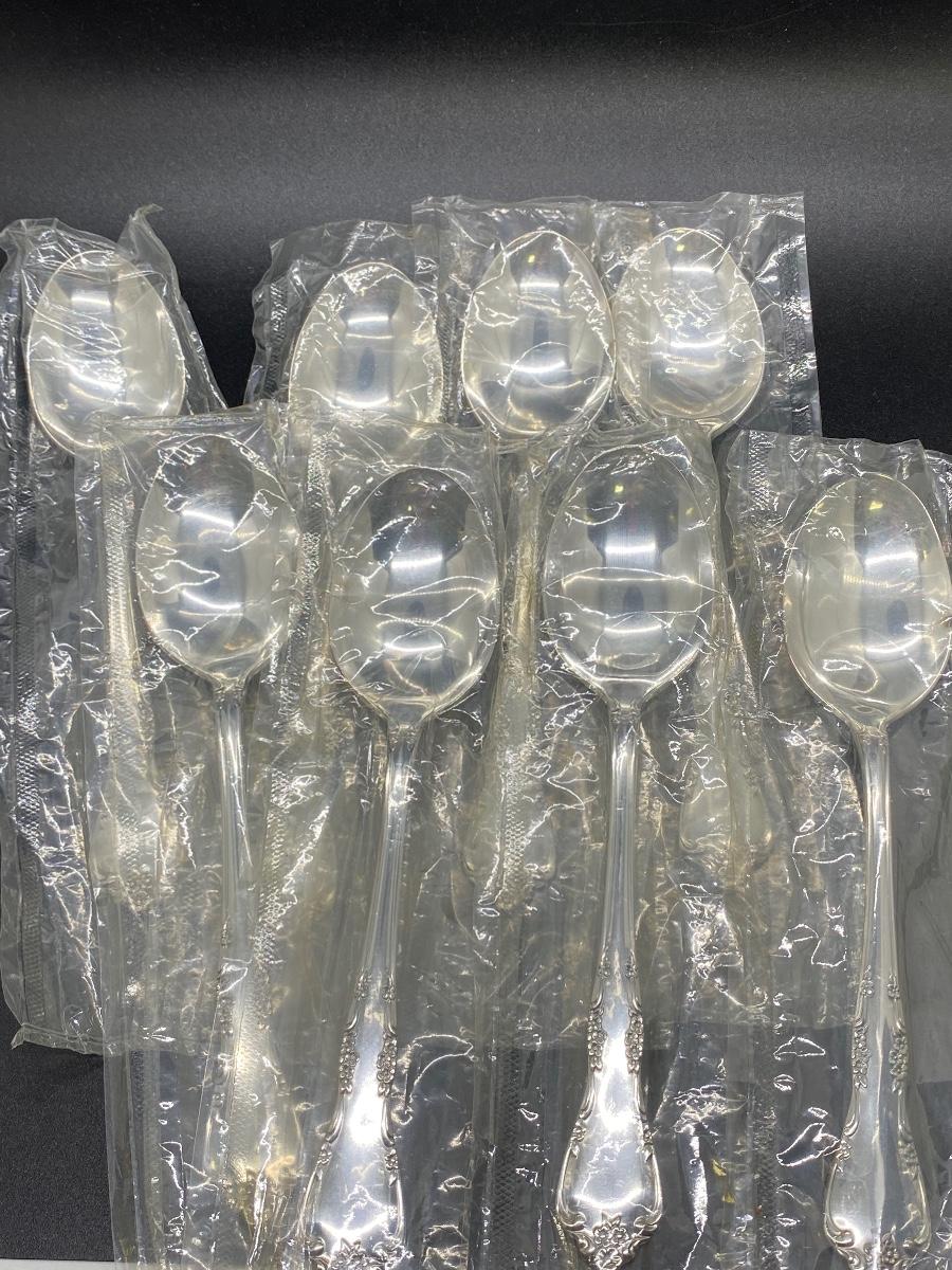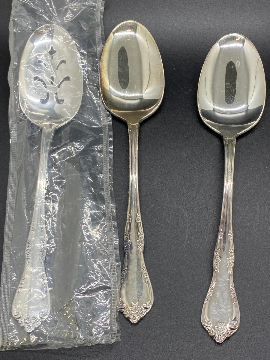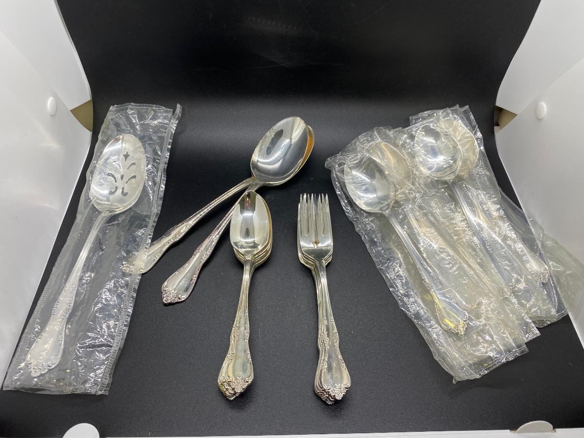 Oneida Community flatware. Salad forks, teaspoons, table spoons, and a couple serving spoons. Table spoons are still in plastic. 23 pieces total.
