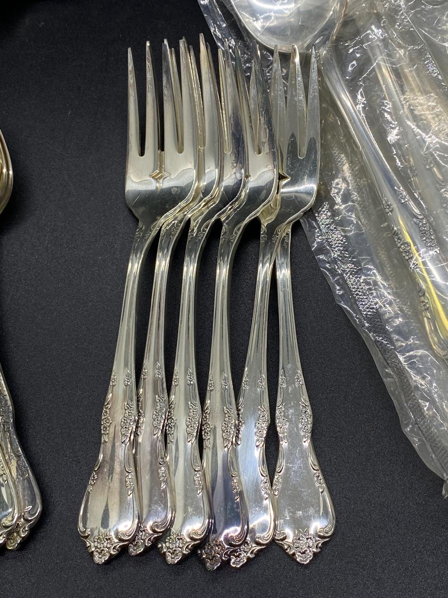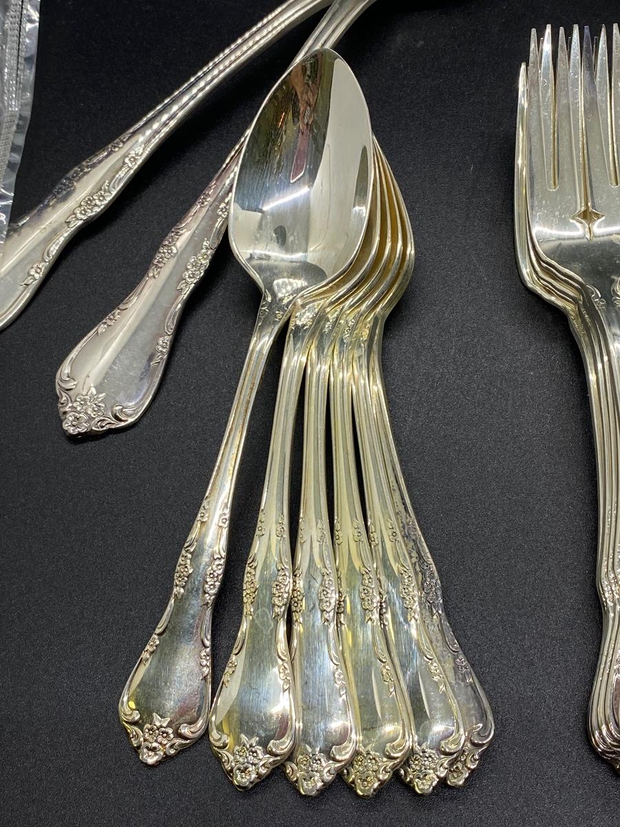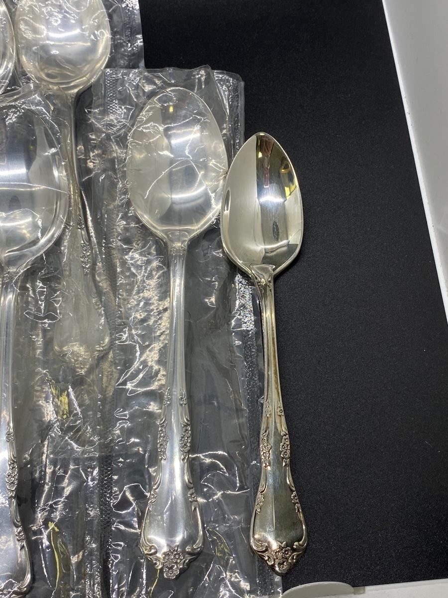 Oneida Community flatware. Salad forks, teaspoons, table spoons, and a couple serving spoons. Table spoons are still in plastic. 23 pieces total.