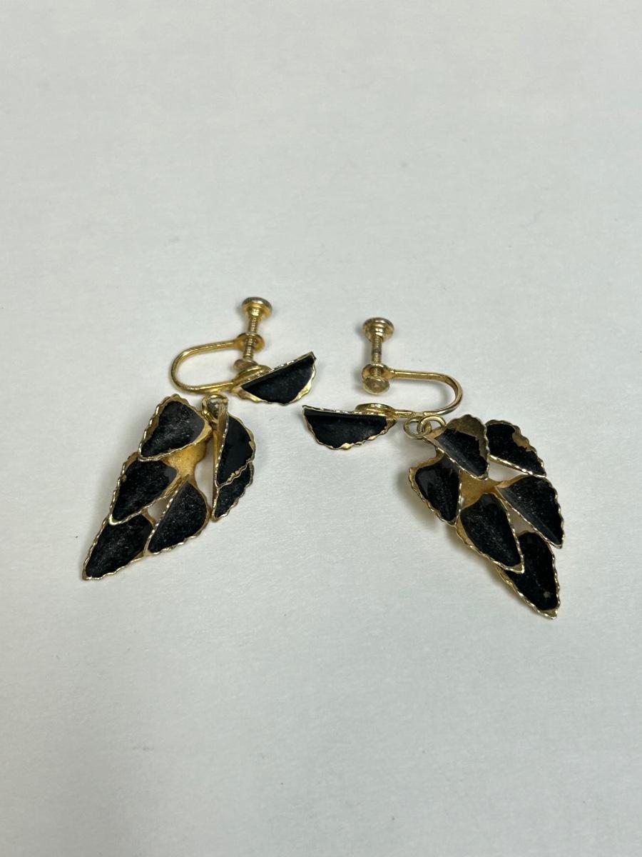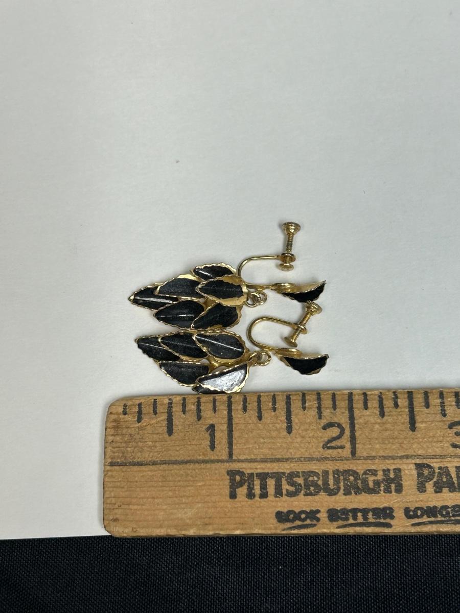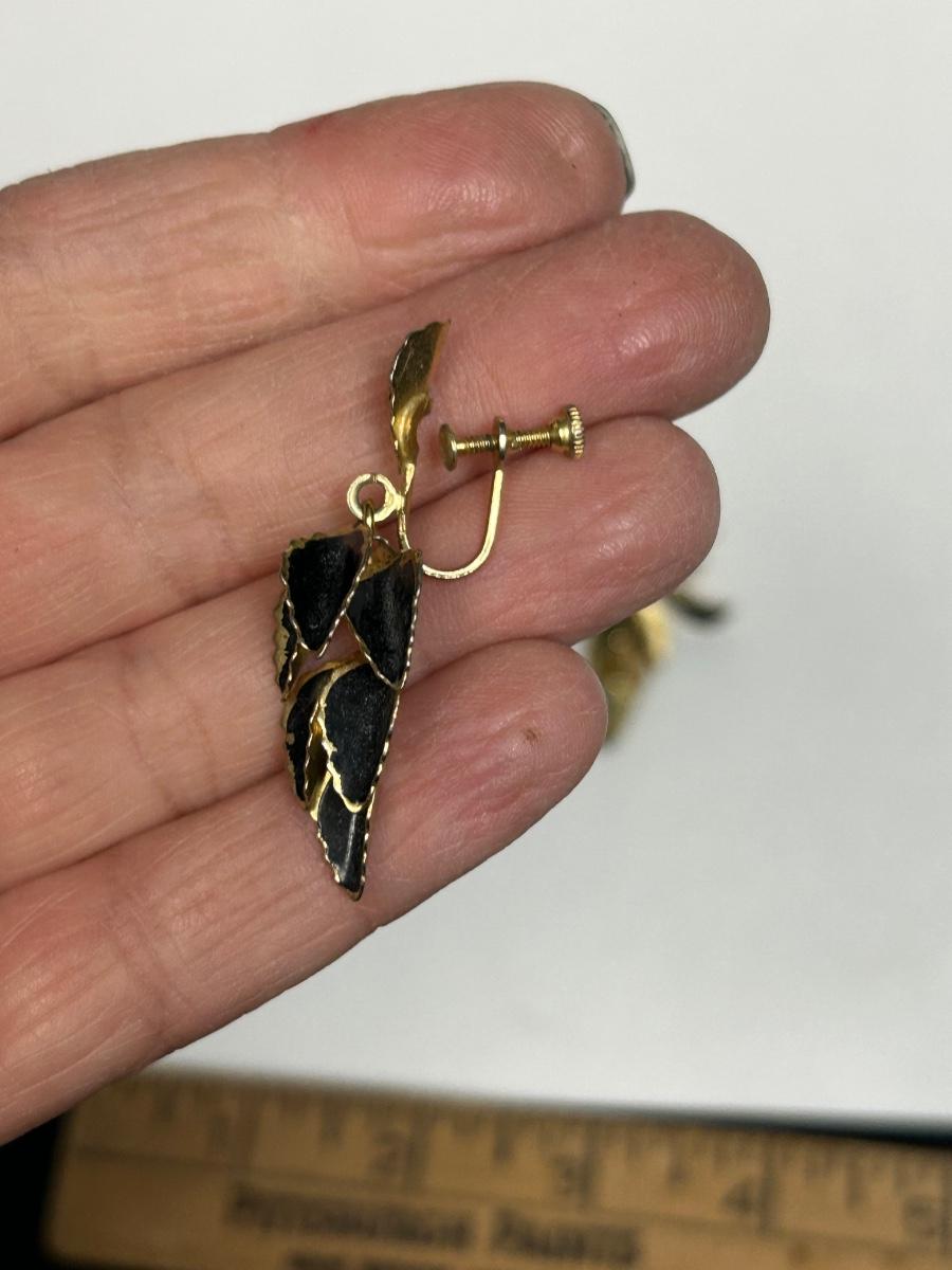 Black and Gold Tone Metal Leaf Shape Dangling Screw Back Earrings. In good previously worn condition.