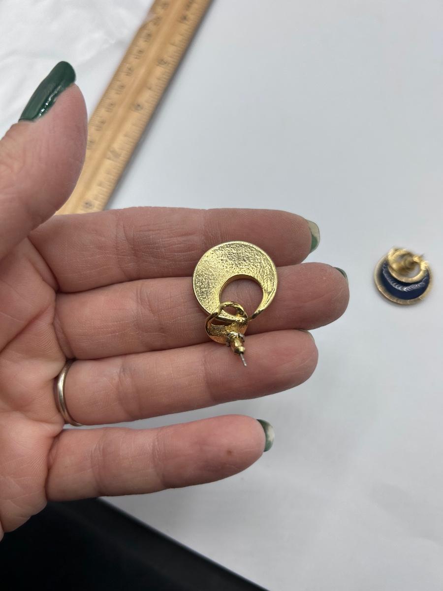 Two Pairs of Navy Blue Enamel Gold Tone Metal Earrings. Both pairs are in good condition.