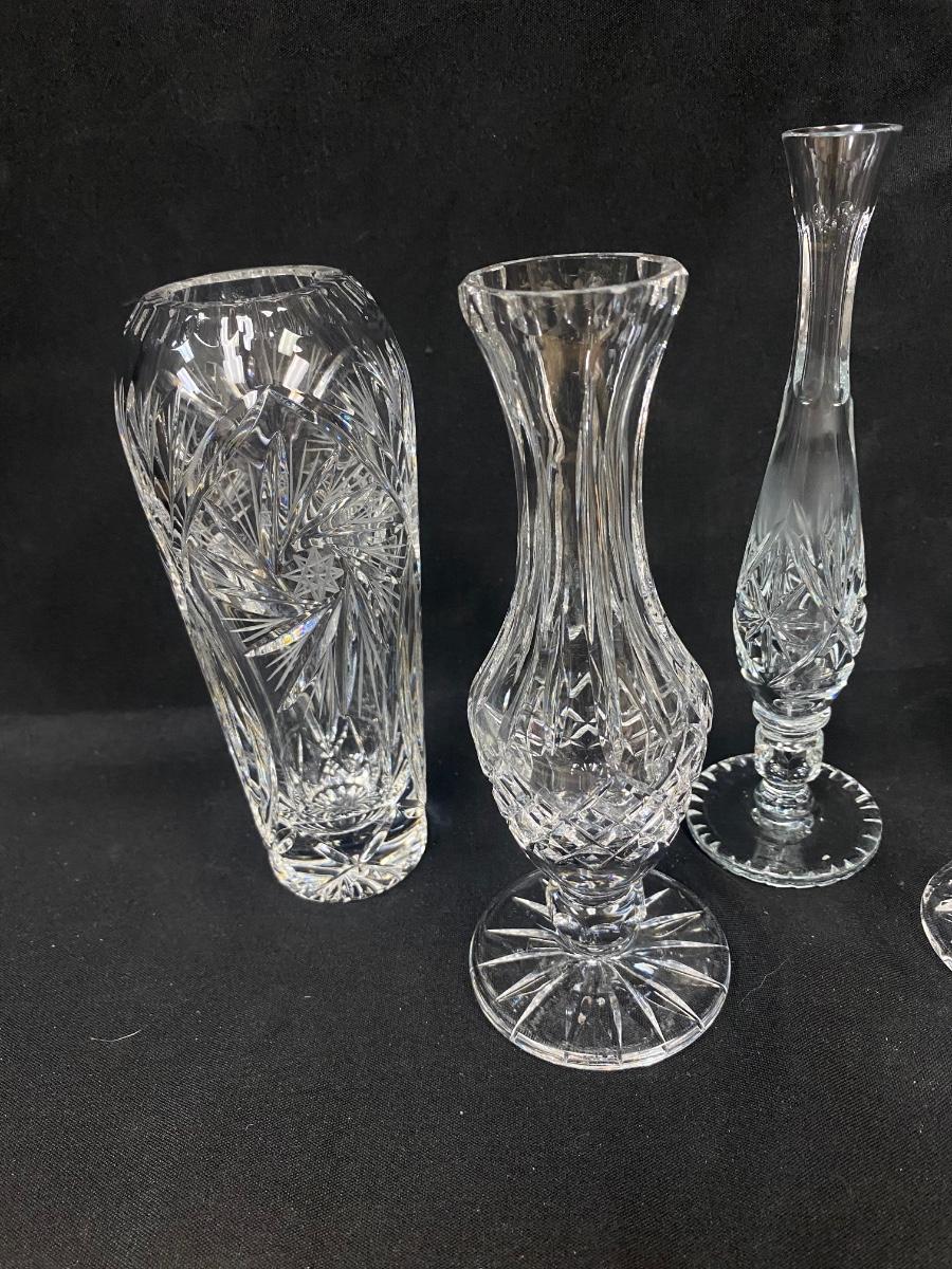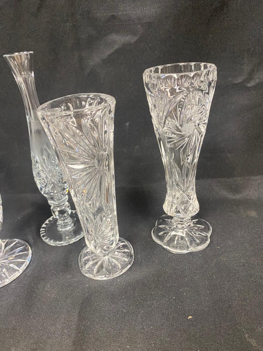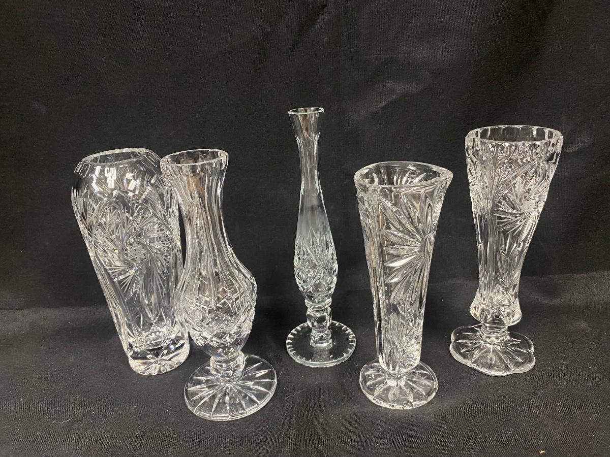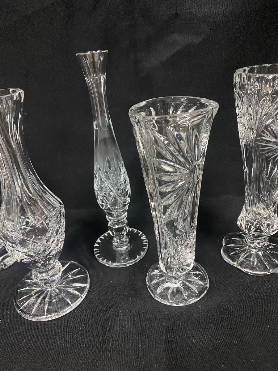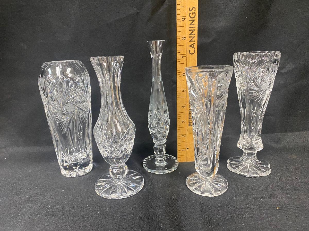 Lot of 5 Cut Crystal Glass Flower Bud Vases. In good condition. Different styles about the same size. 8" and smaller.