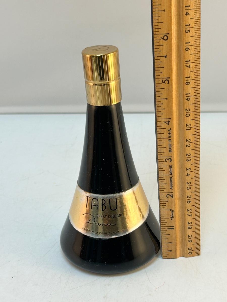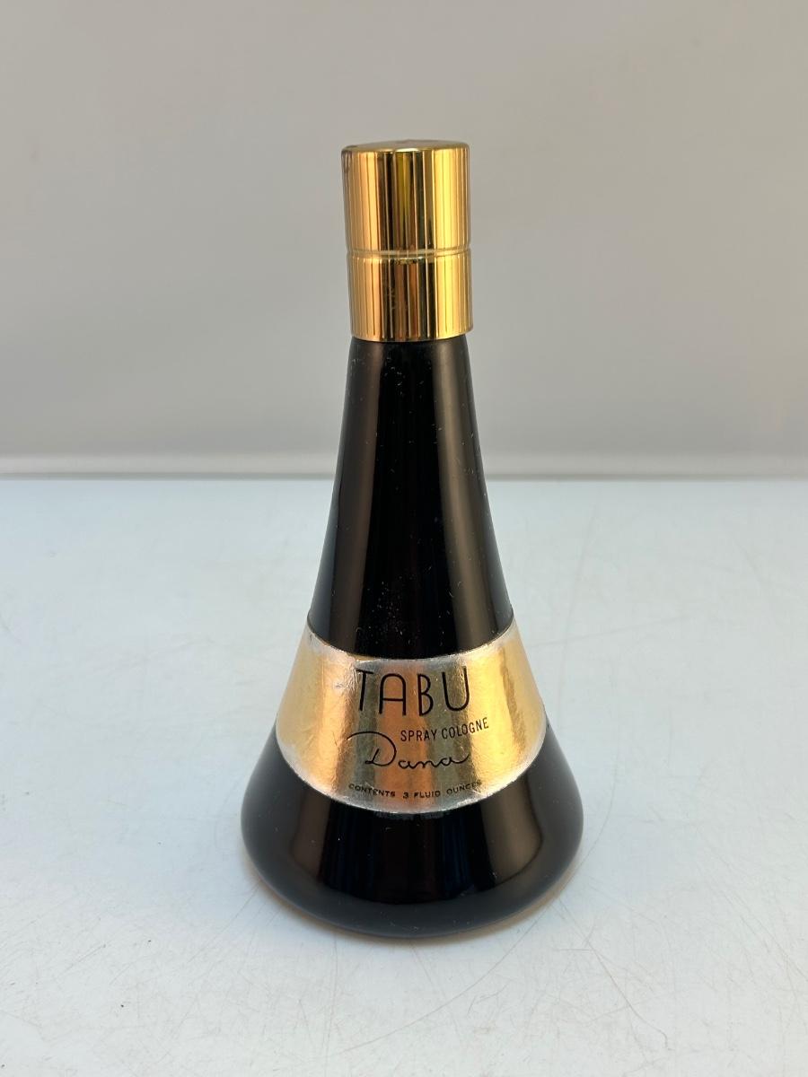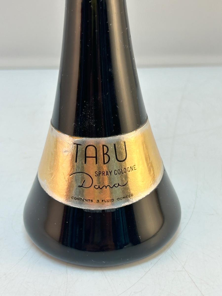 Vintage Dana TABU Spray Cologne Perfume Bottle Partially Full. Black glass cannot see exactly how much is left but you can hear it swish when moved. Great art deco style bottle.
