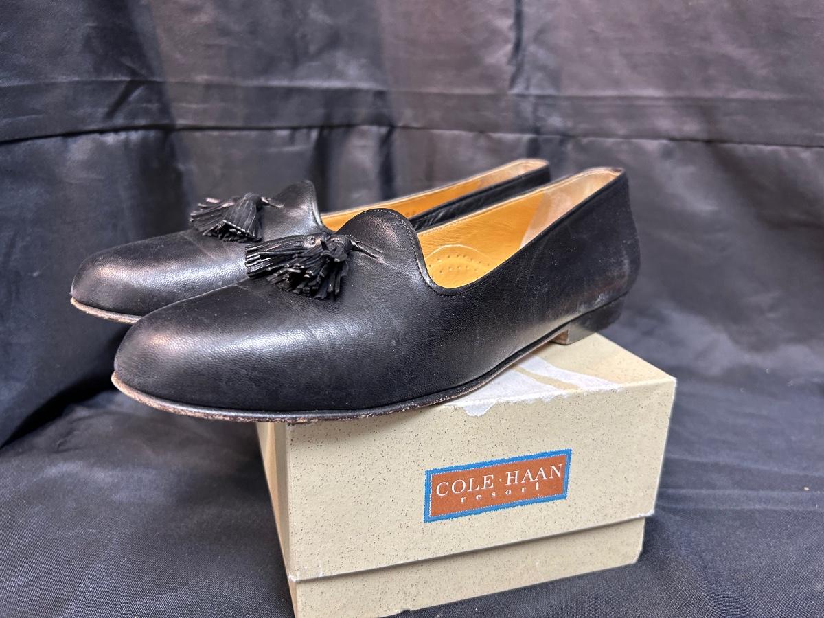 Cole Haan Size 9AA Black Leather Tassel Ladies Shoes Flats with Wood Shoe Forms. Have signs of wear.