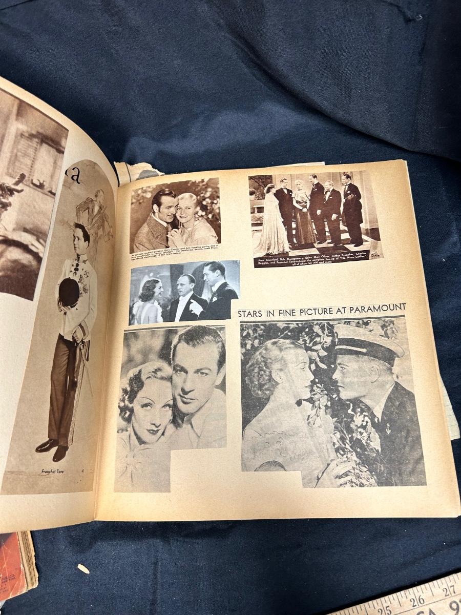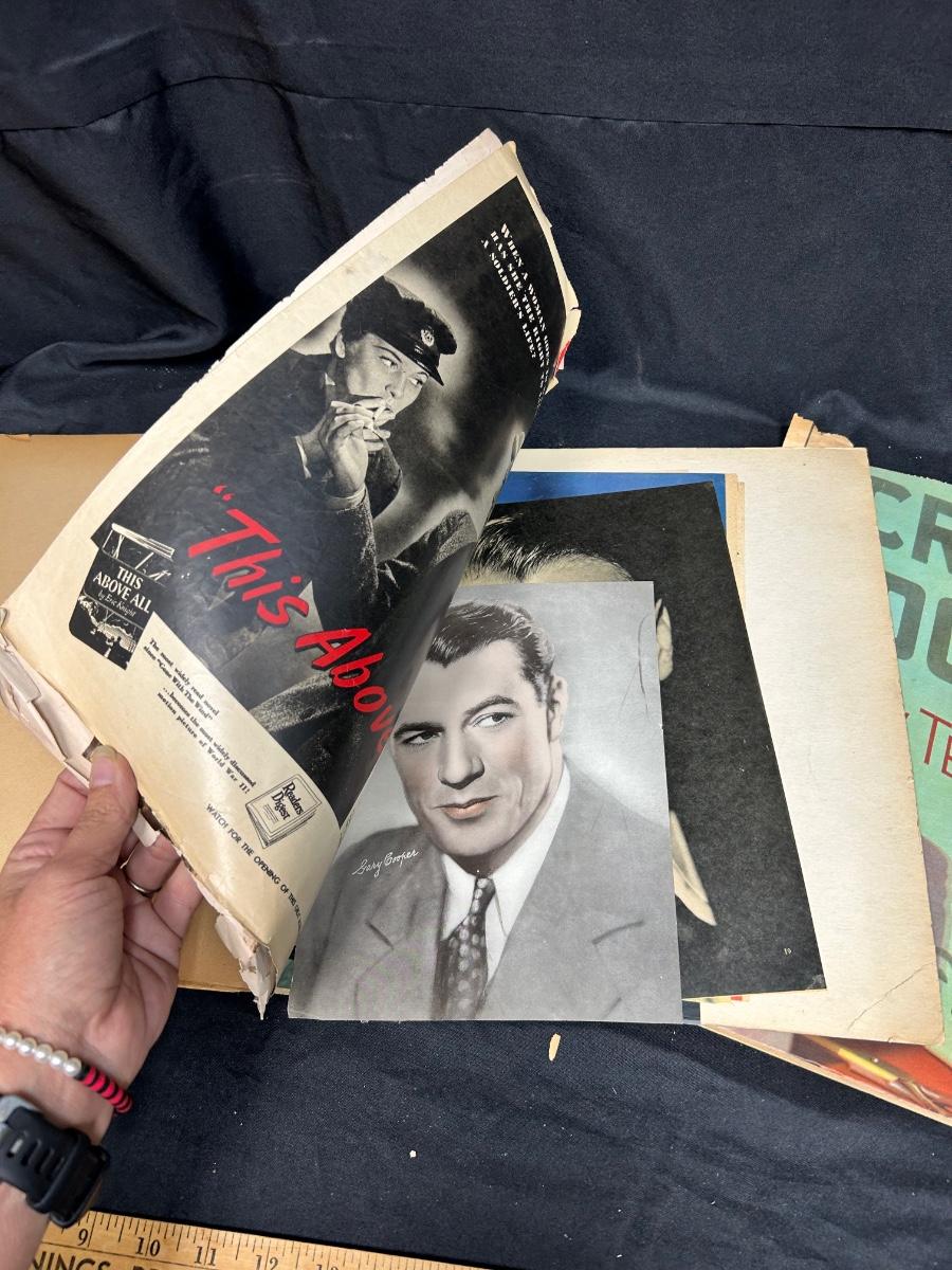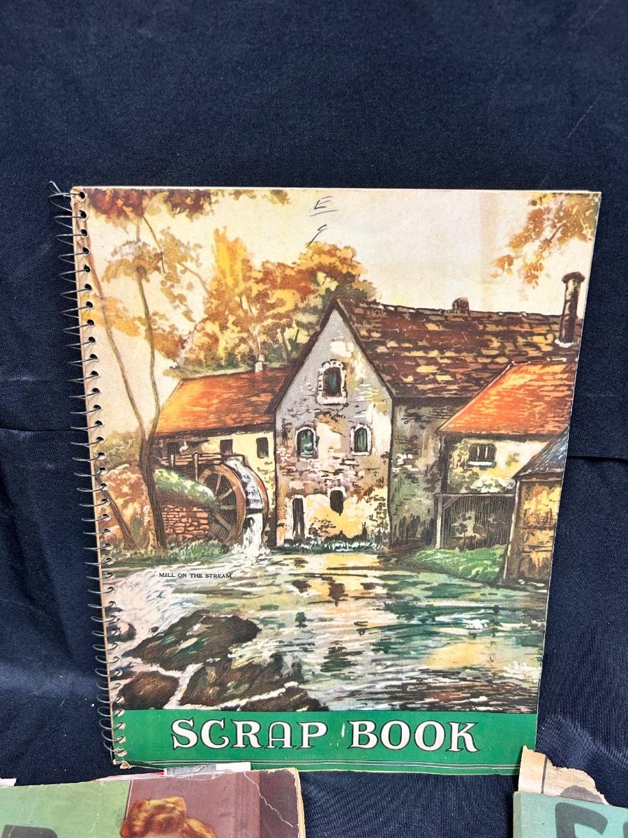 Vintage Set of Shirley Temple Cover Scrapbooks Filled with Old Hollywood Heartthrob Cut Outs and Blank Book. The Shirley Temple cover books are filled with clipped pictures of Hollywood actors and actresses. The spiral old mill book is empty.