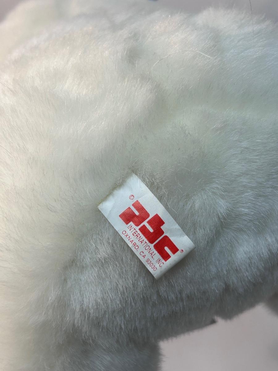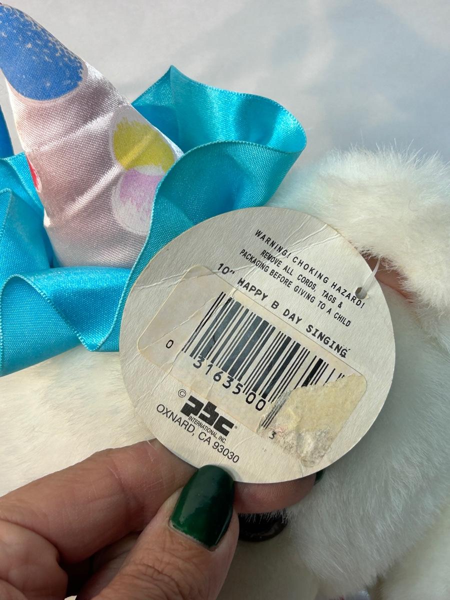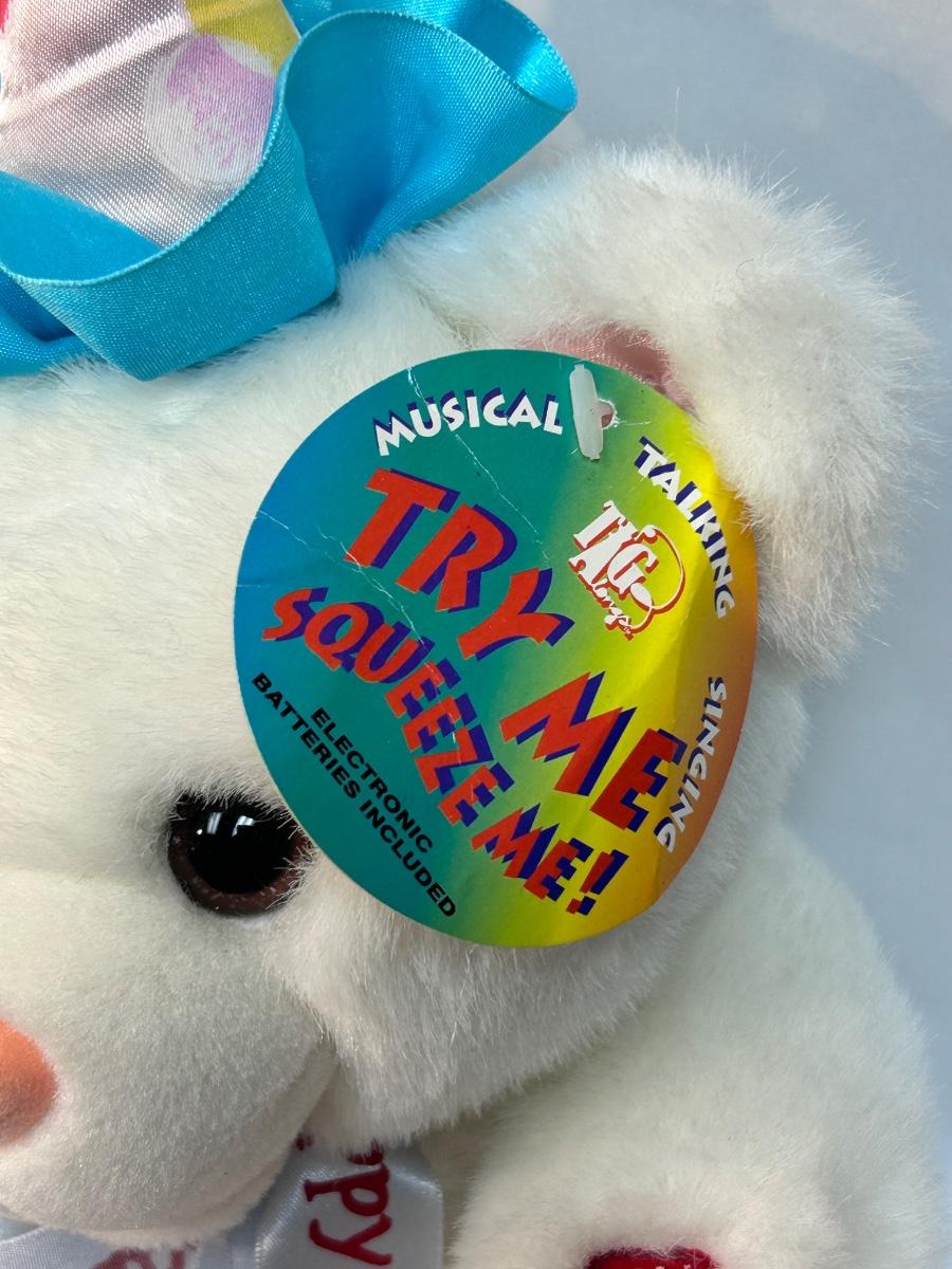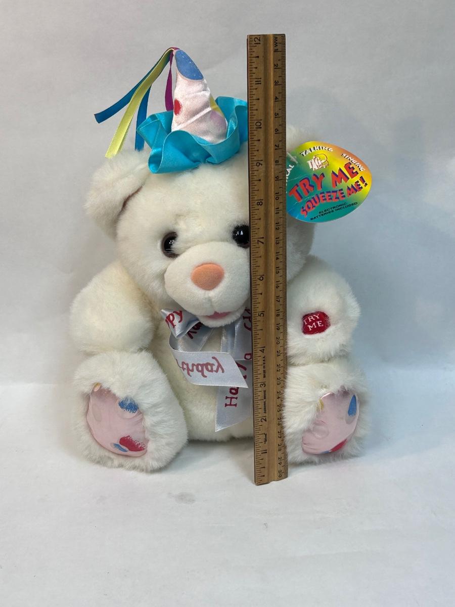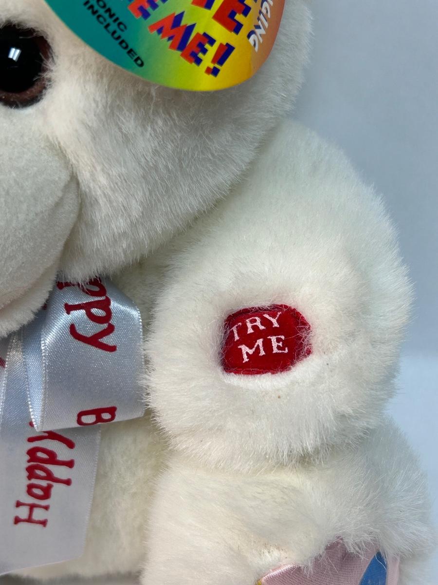White Happy Birthday Plush Stuffed Bear Battery Operated Talking and Singing Push Button Paw. In good condition, fairly clean with original hang tag. Not working, may just need new batteries.
