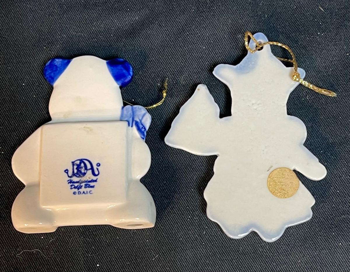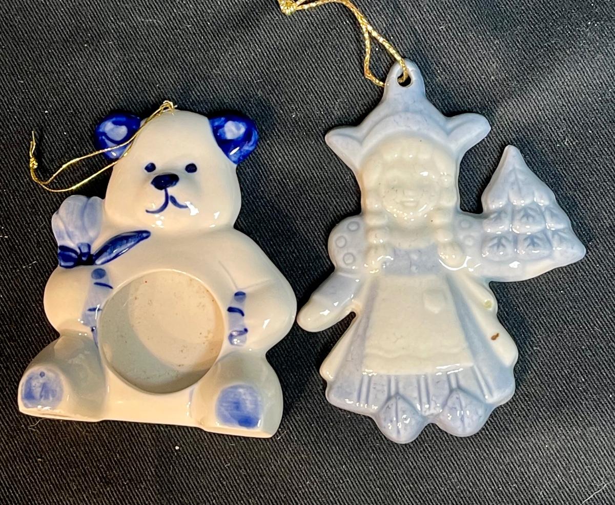 2 Delft Blue Ornaments - Bear Picture Frame and Dutch Girl with Tree