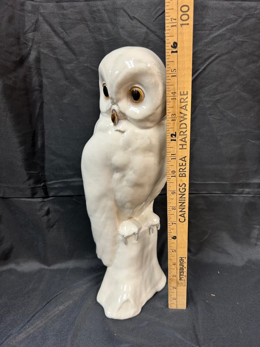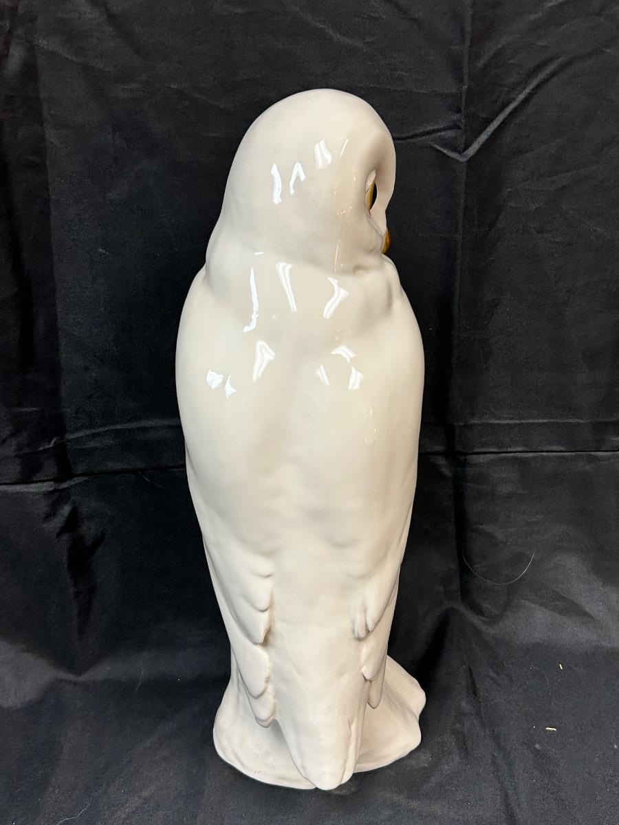 Large White Snowy Owl Porcelain ceramic Figurine Statue Signed. In good, displayed condition. Does seem to have some crazing but it doesn't stand out. It is signed on the bottom, hard to make out looks like a signature or mark and 92 USA. There is a sticker as well from The Card Castle Anaheim, CA. About 16" size. Hollow body. Other than the light crazing no damage found.