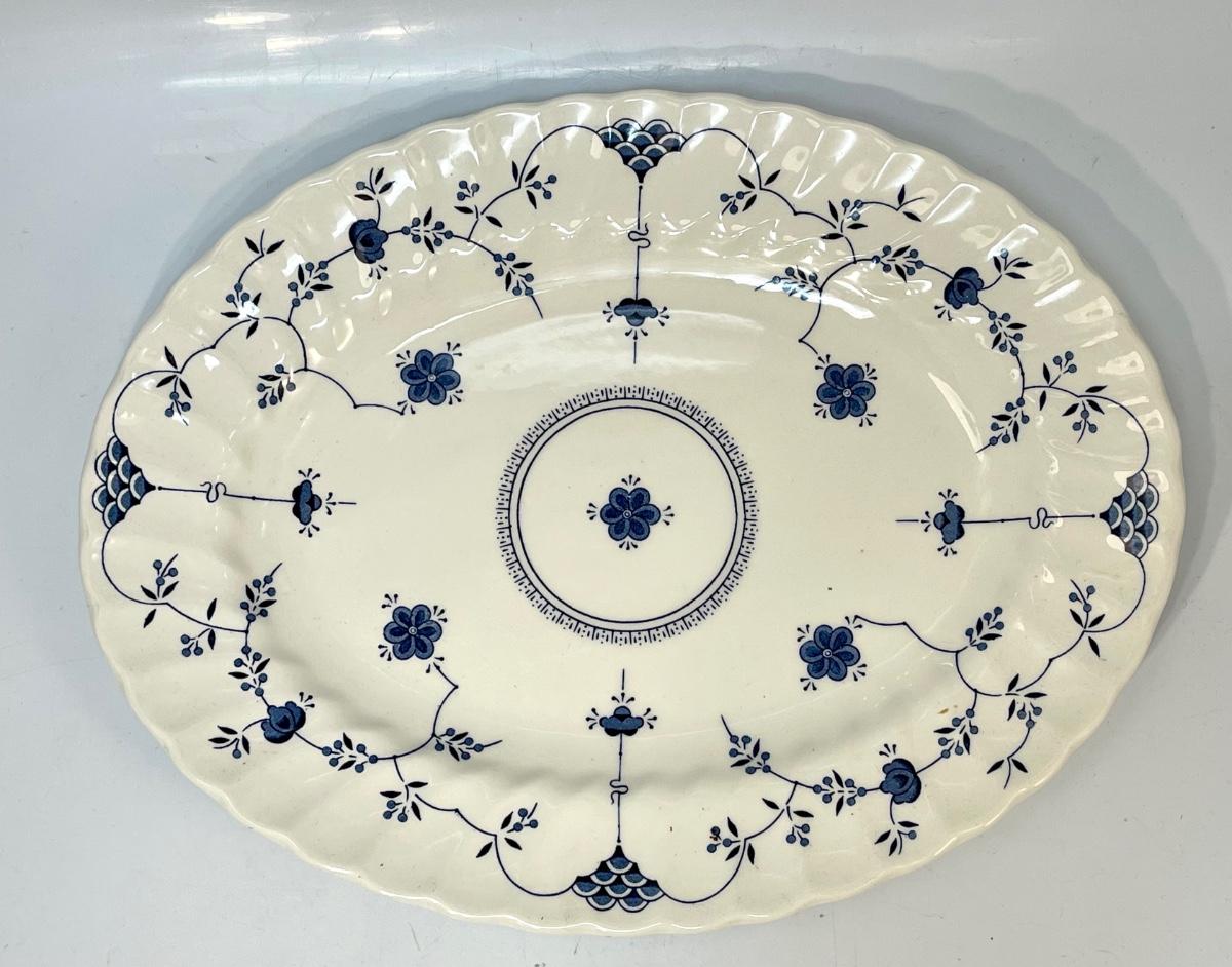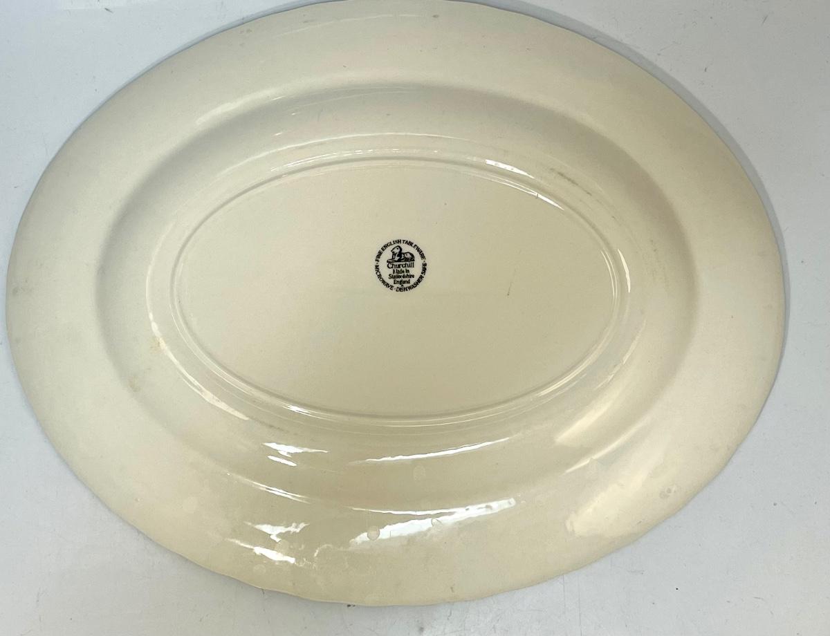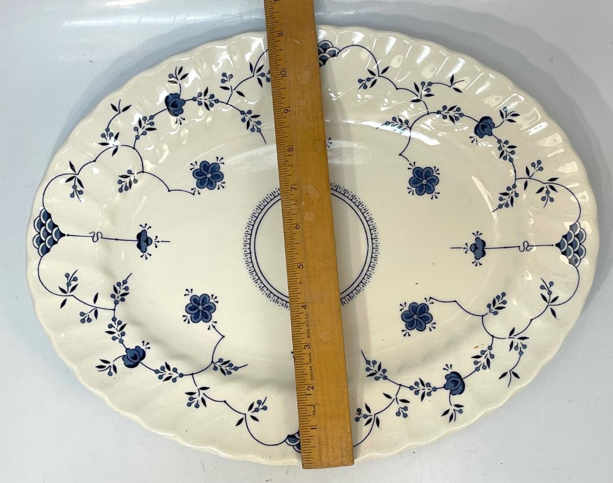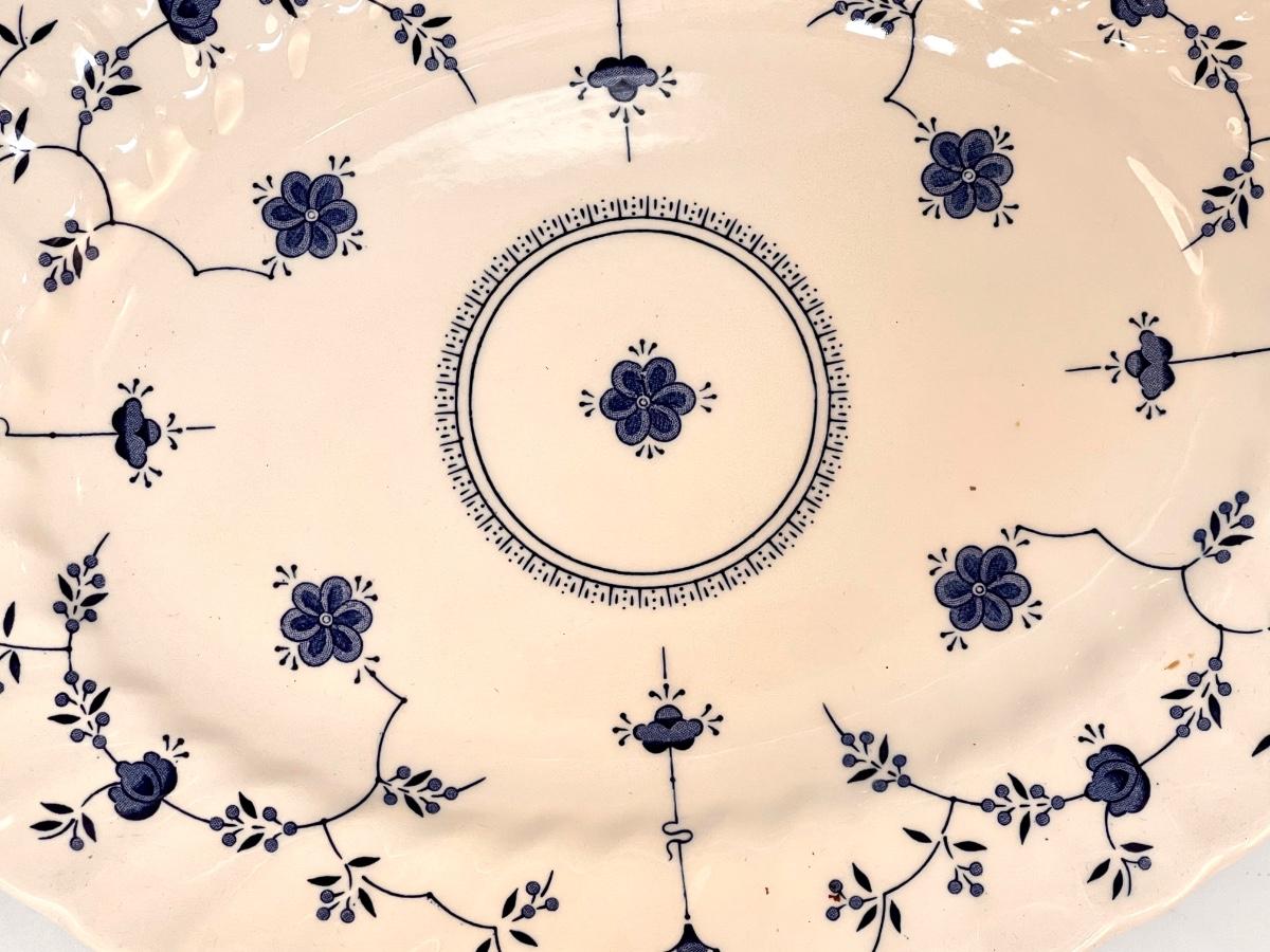 Vintage Churchill Staffordshire England Serving Plate Tray Dark Blue Floral. Scalloped edge. Delicate dark blue flower and vine print. About 15" length.