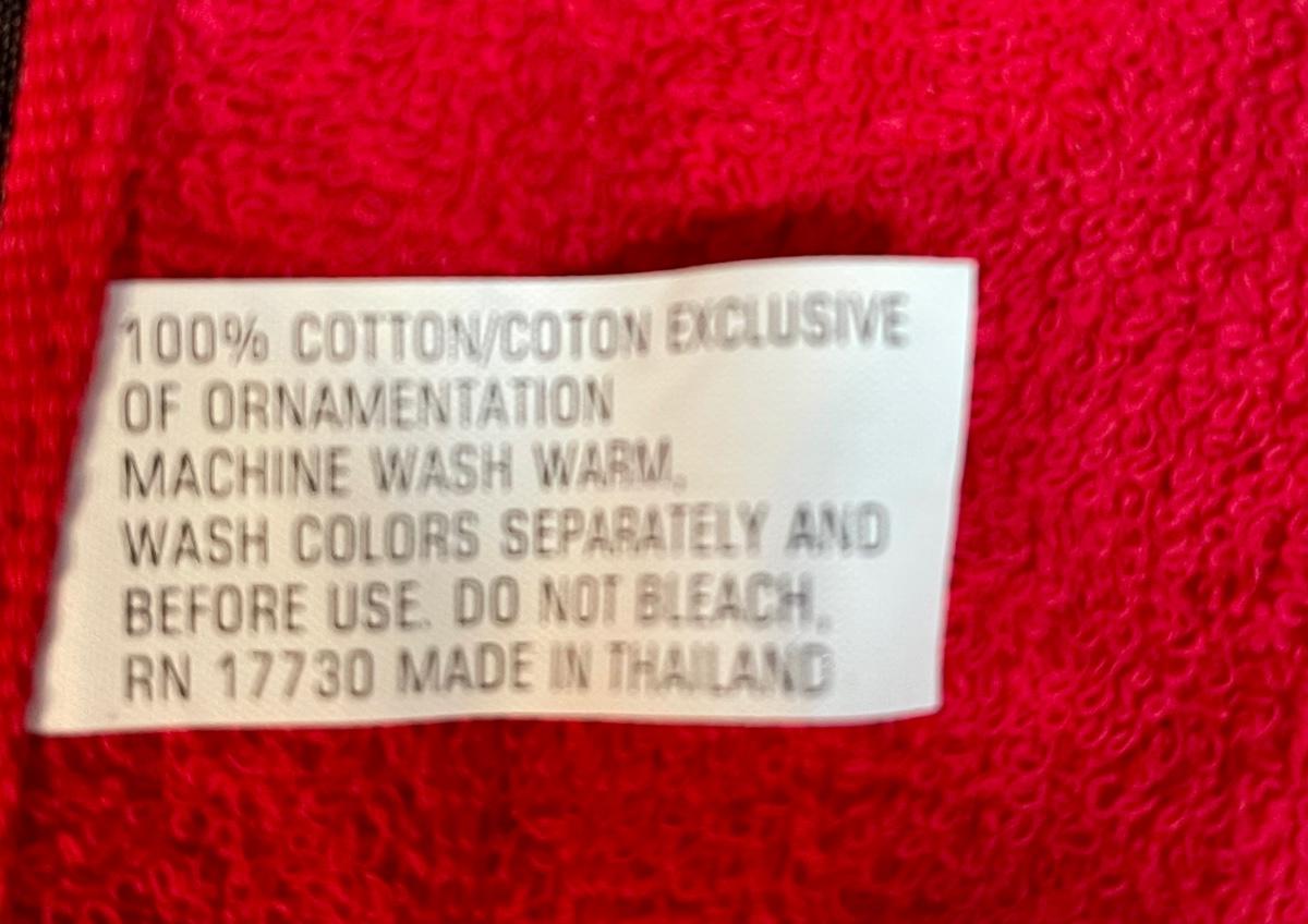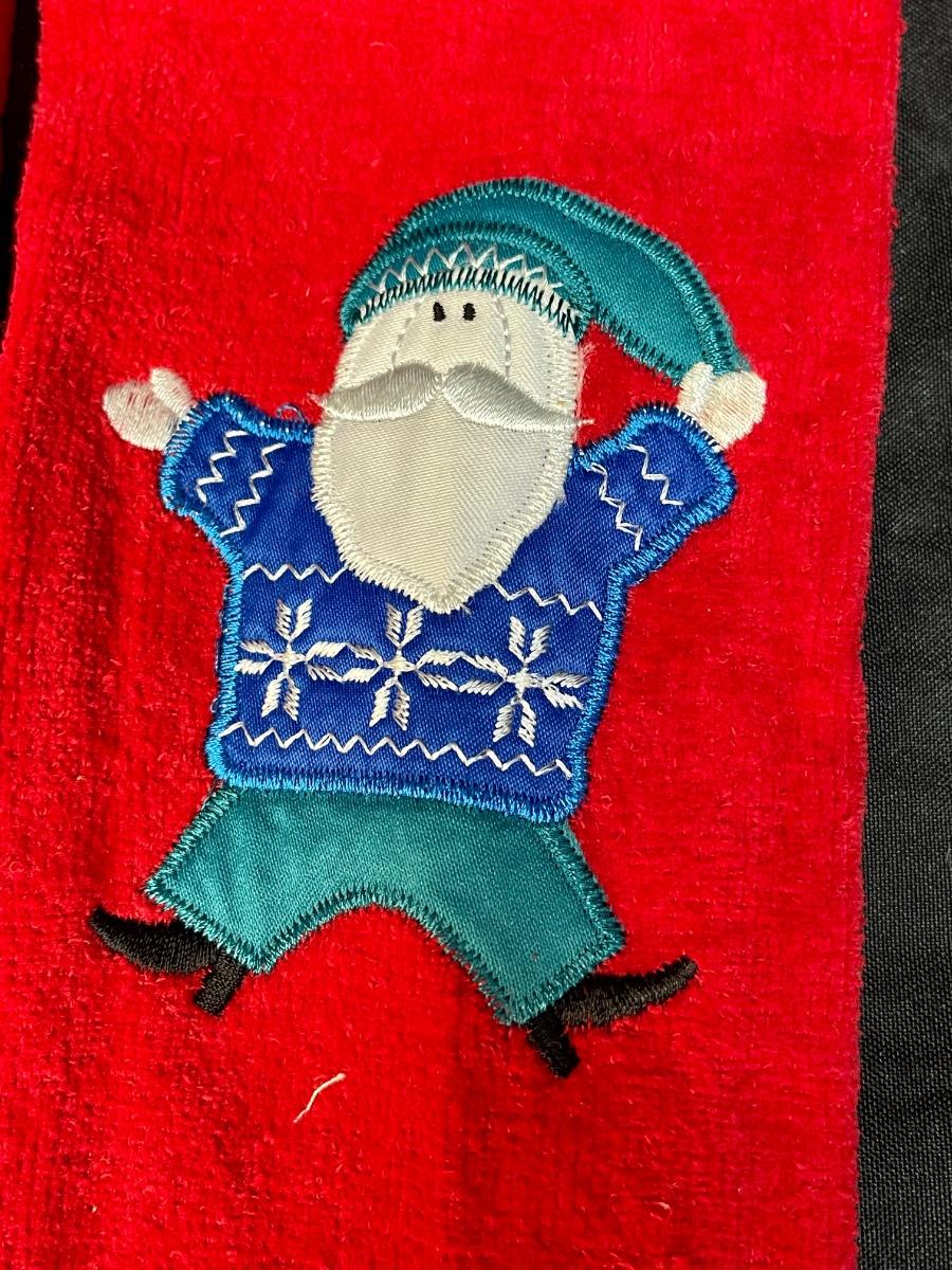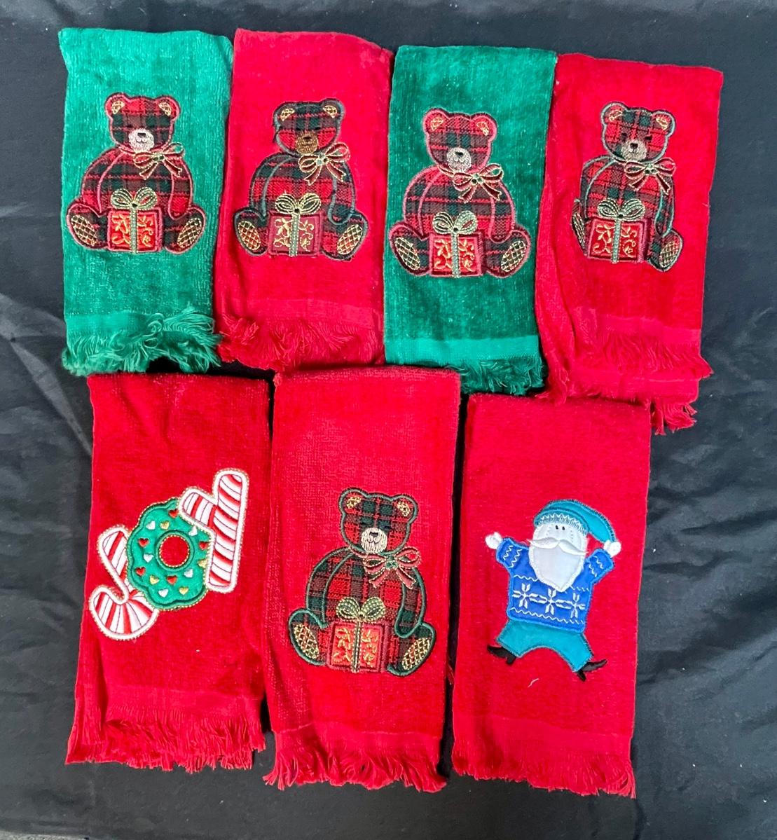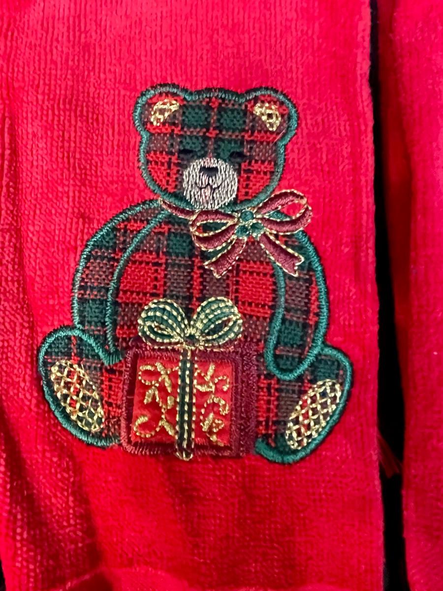 Red and Green Christmas Teddy Bear Santa Applique Hand Towels. In good used condition.