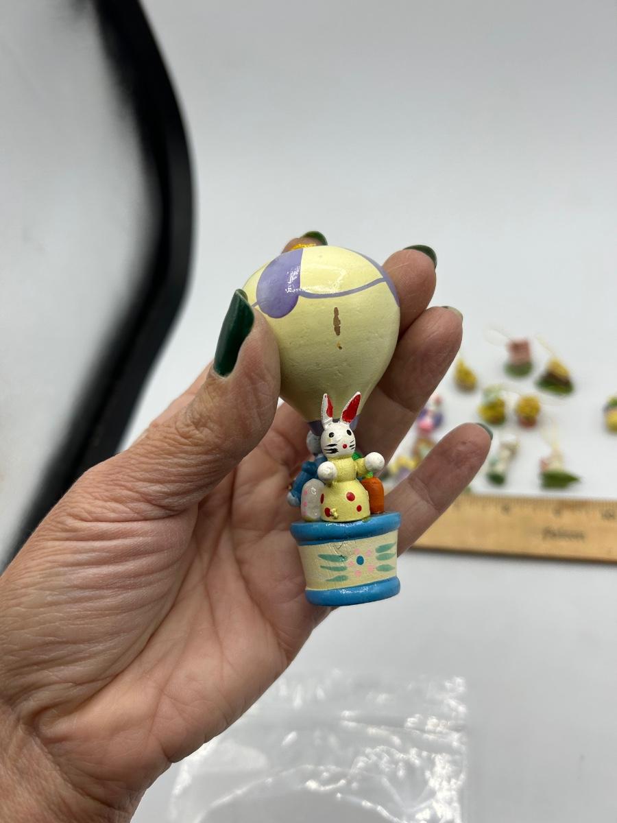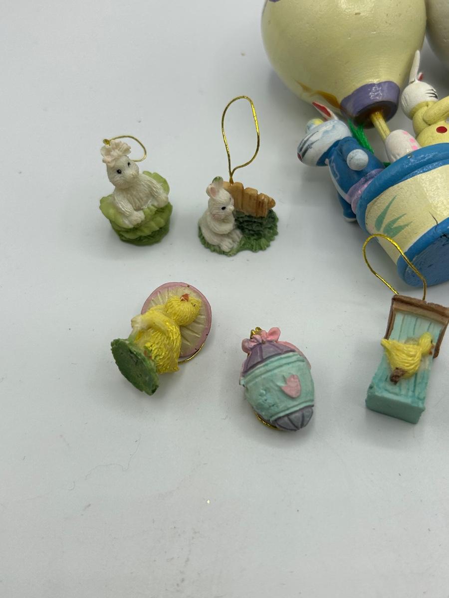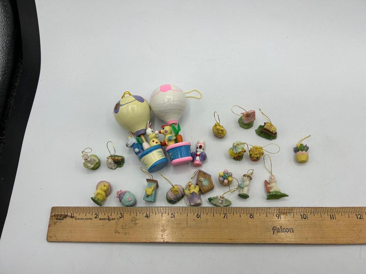 Mixed Lot of Easter Themed Miniature Ornament Figurines. Two hot air balloons are made of wood while the tiny ornaments seem to be resin like.