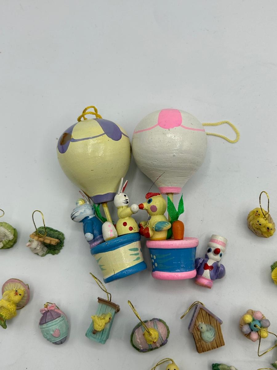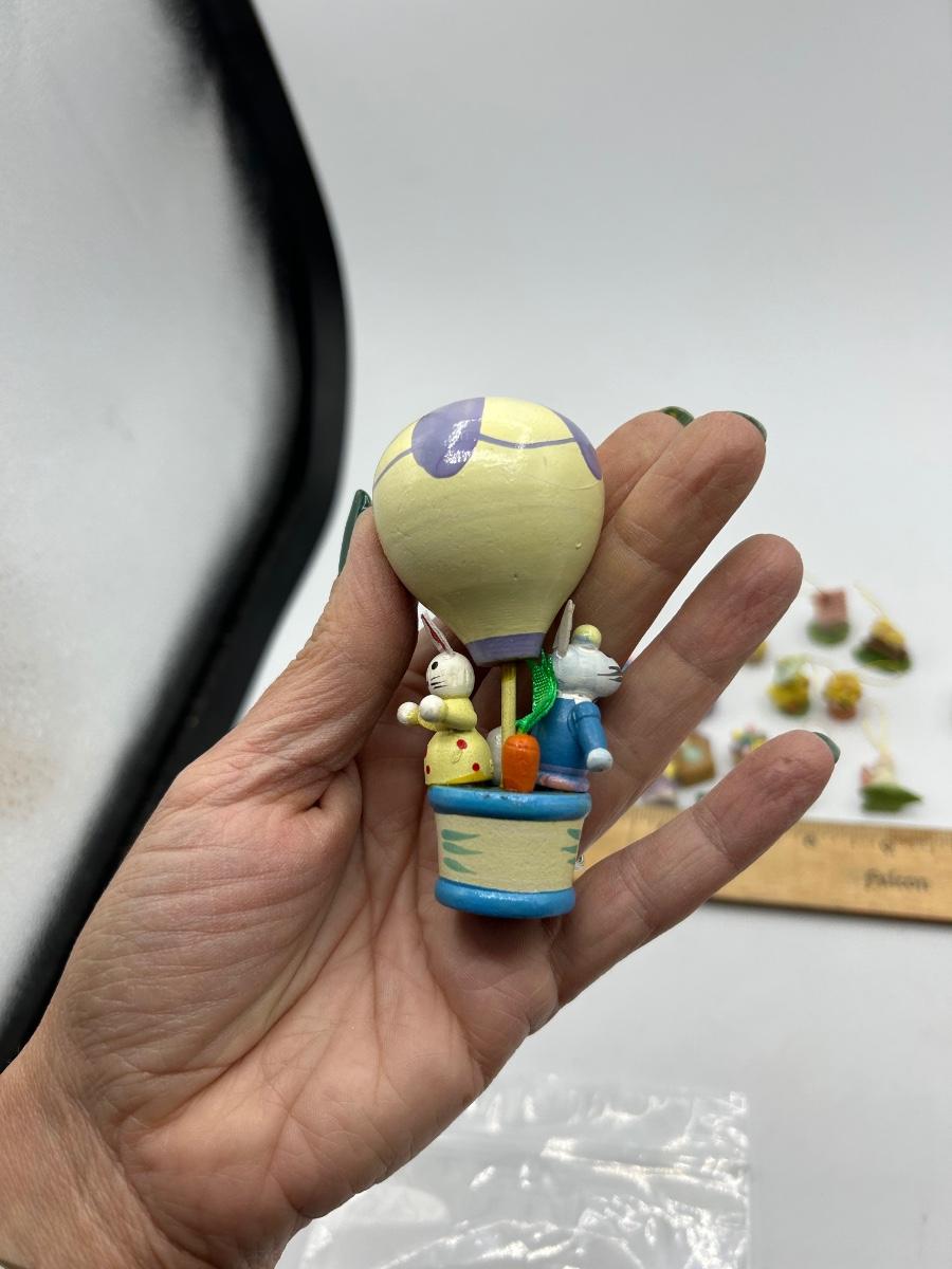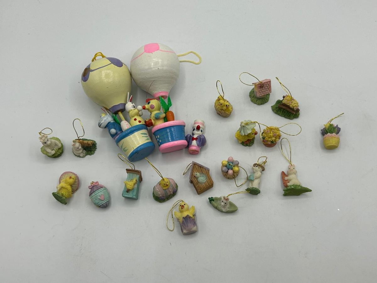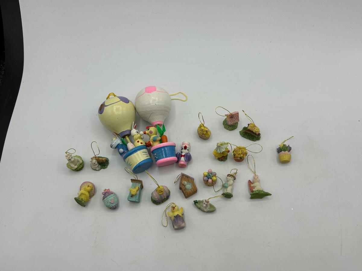 Mixed Lot of Easter Themed Miniature Ornament Figurines. Two hot air balloons are made of wood while the tiny ornaments seem to be resin like.