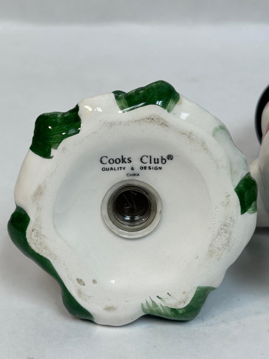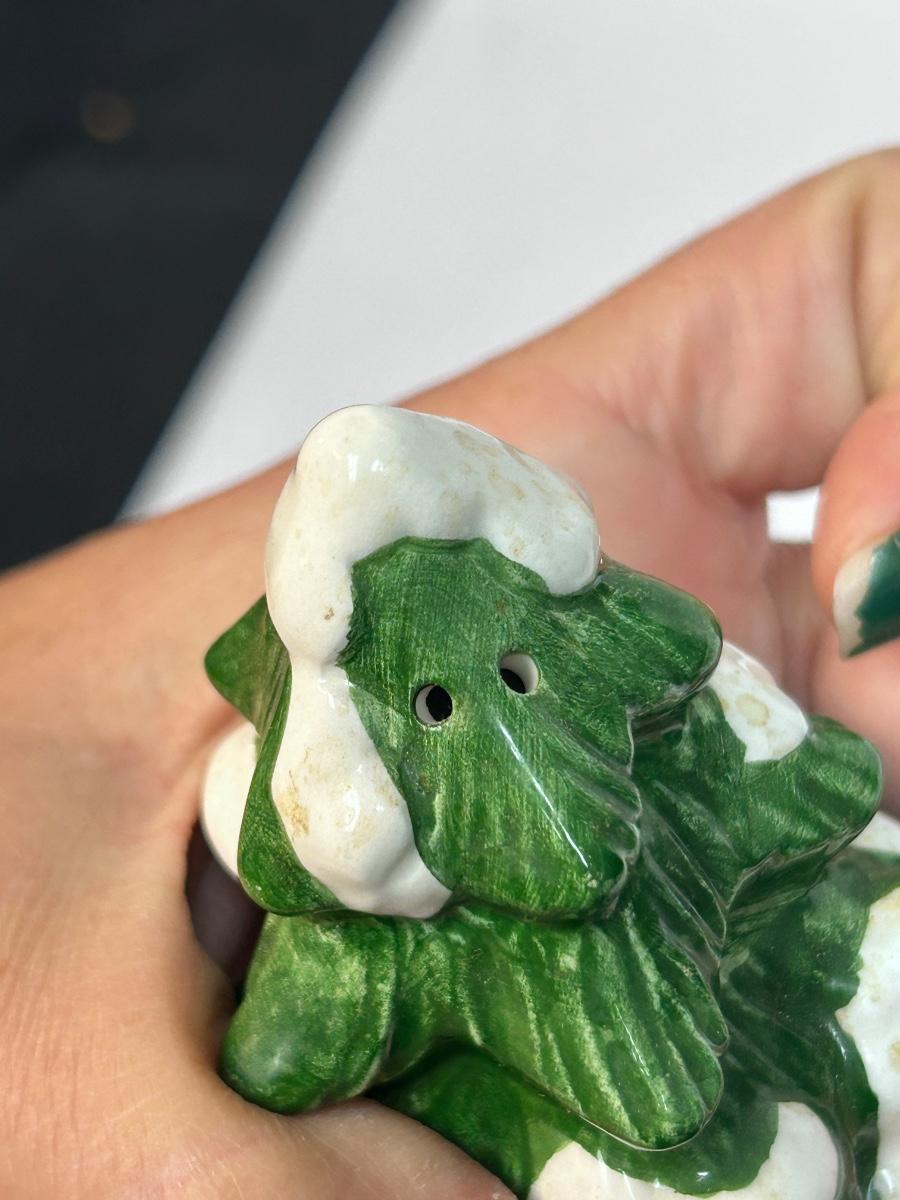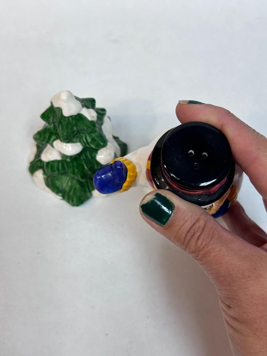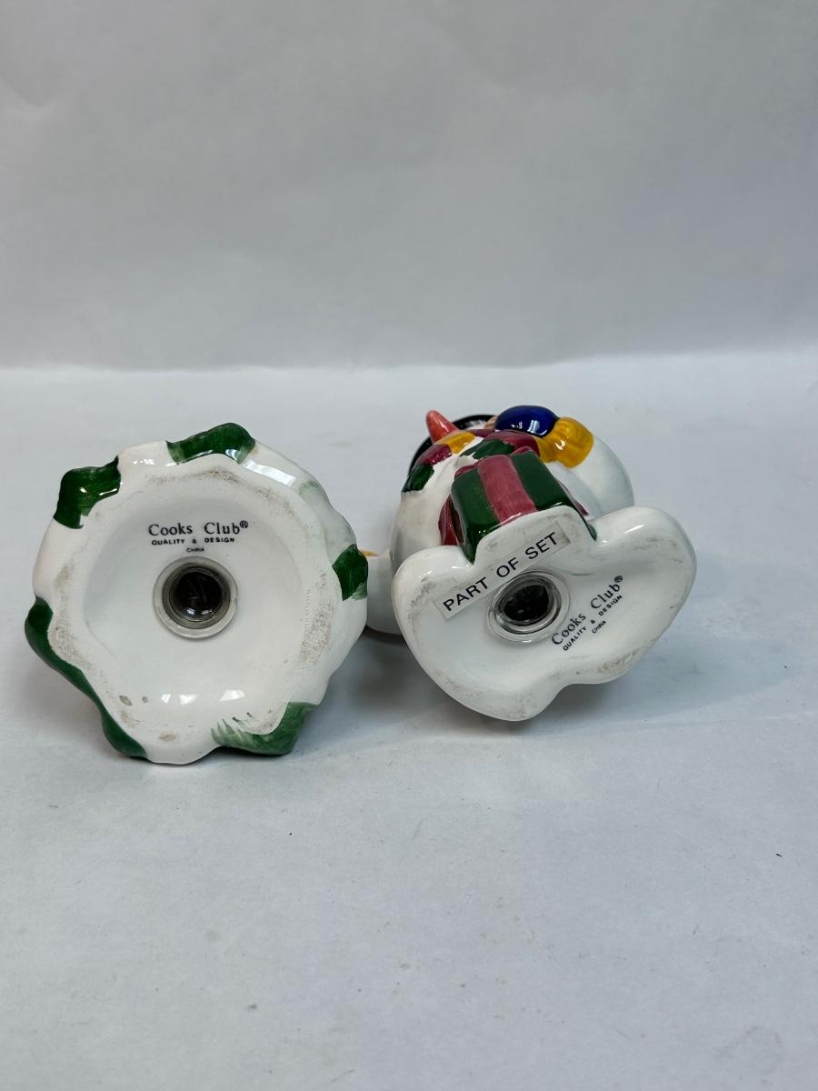 Ceramic Cooks Club Snowman Frosty and Christmas Holiday Tree Salt and Pepper Novelty Shakers. In good condition. Both have their stoppers, no chips found.