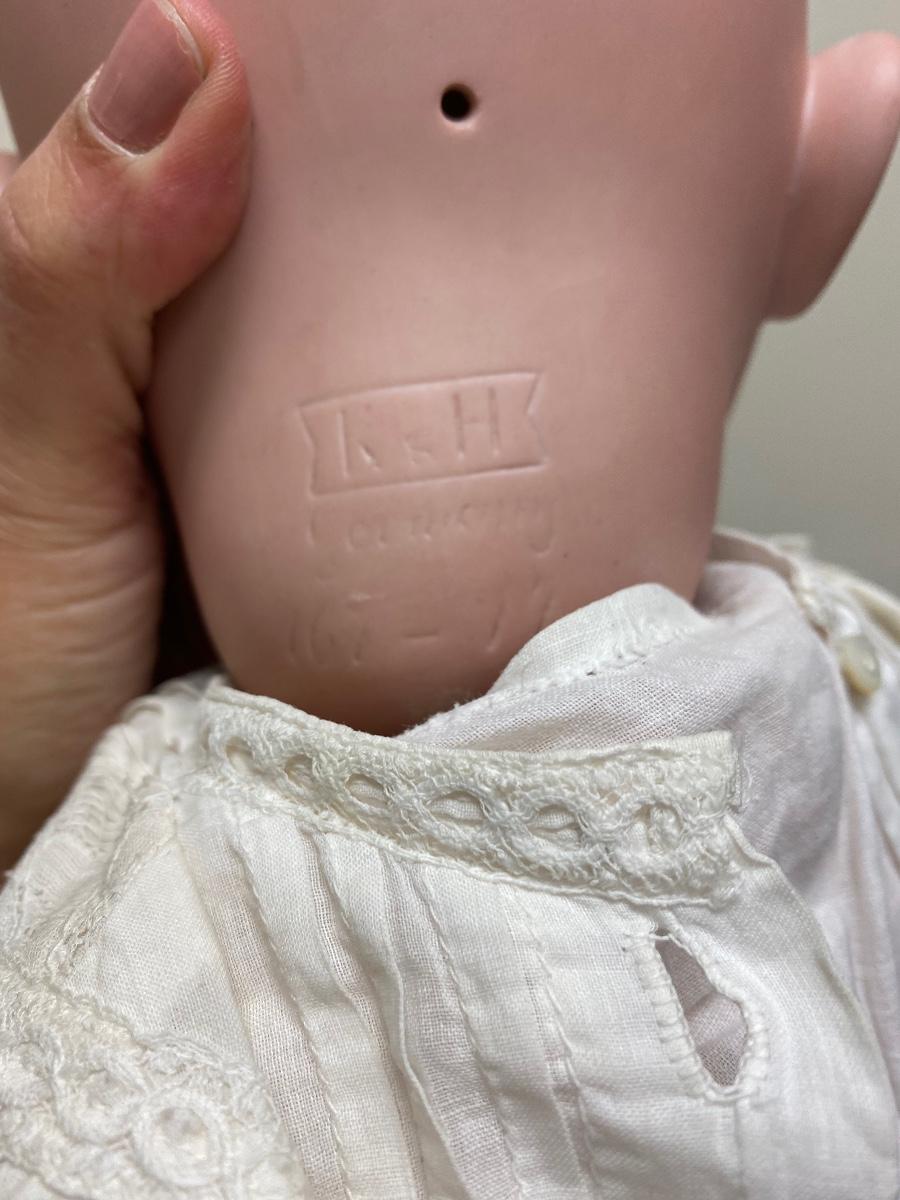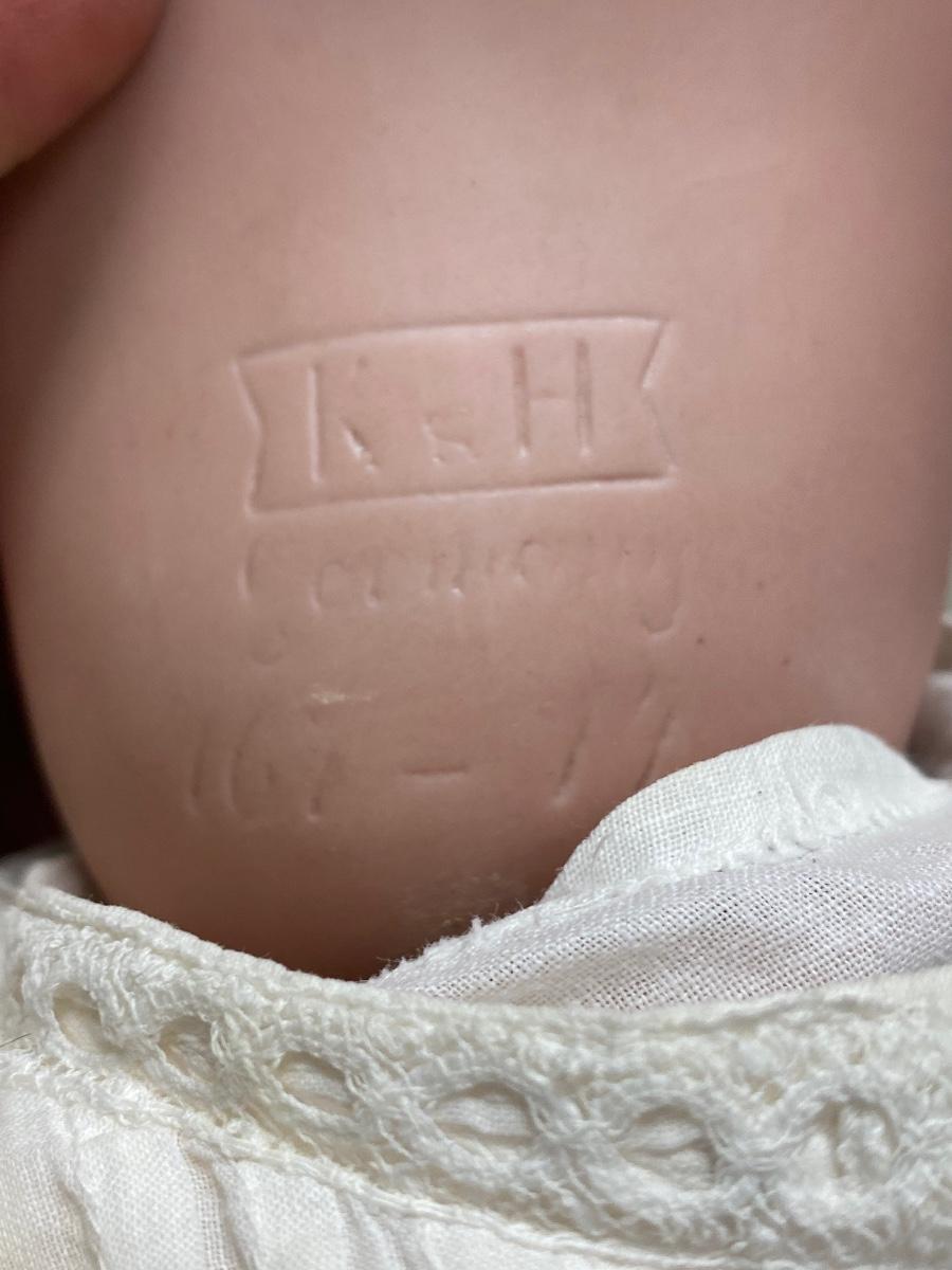 Vintage bisque & composite sleep eye doll. Head marked KH Germany 167-14?, not sure on the numbers. Strings are a bit tight. Composite is dark, some wear. About 28" size.